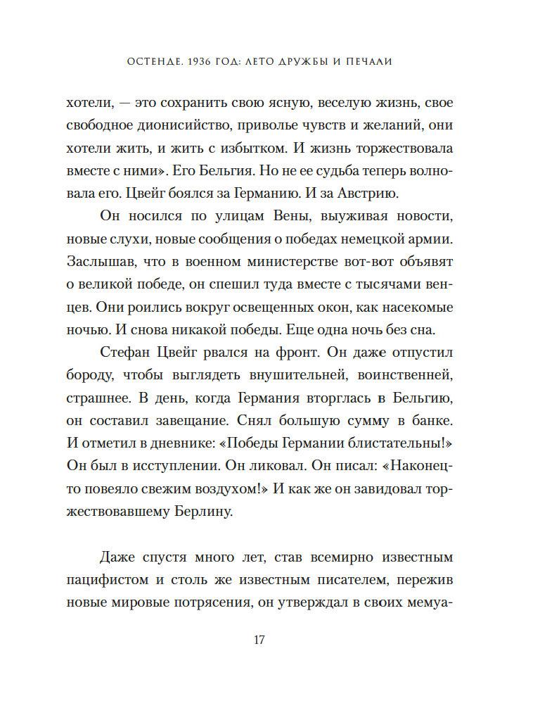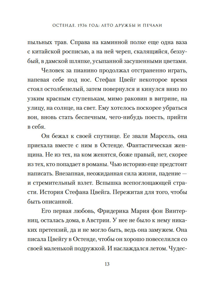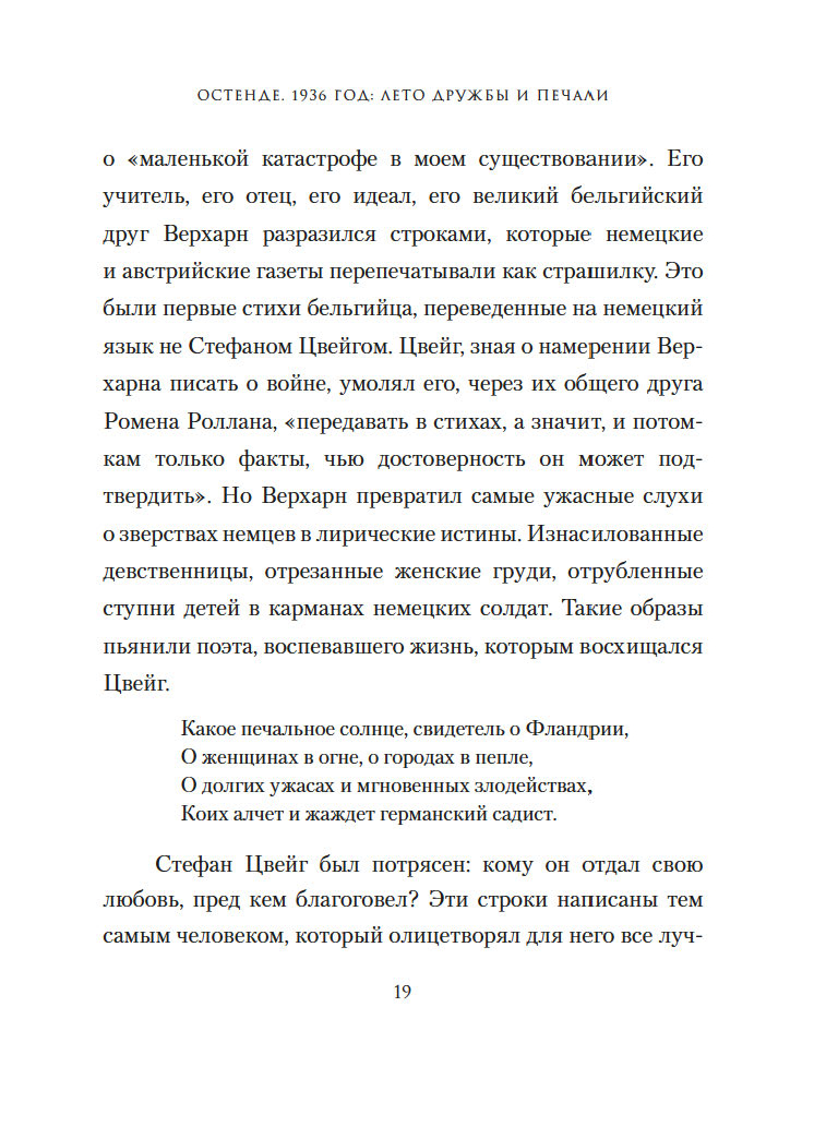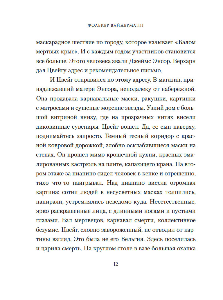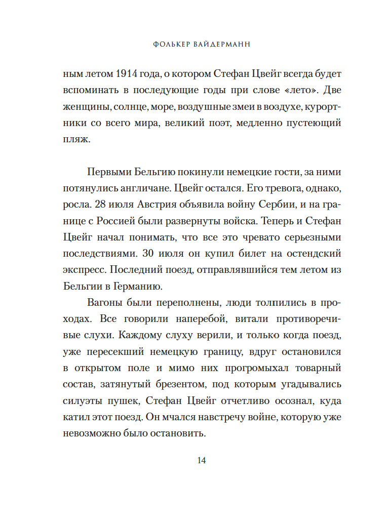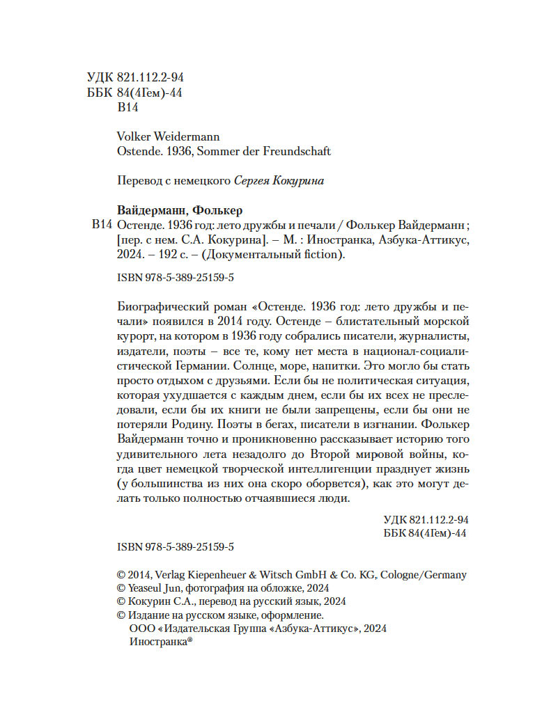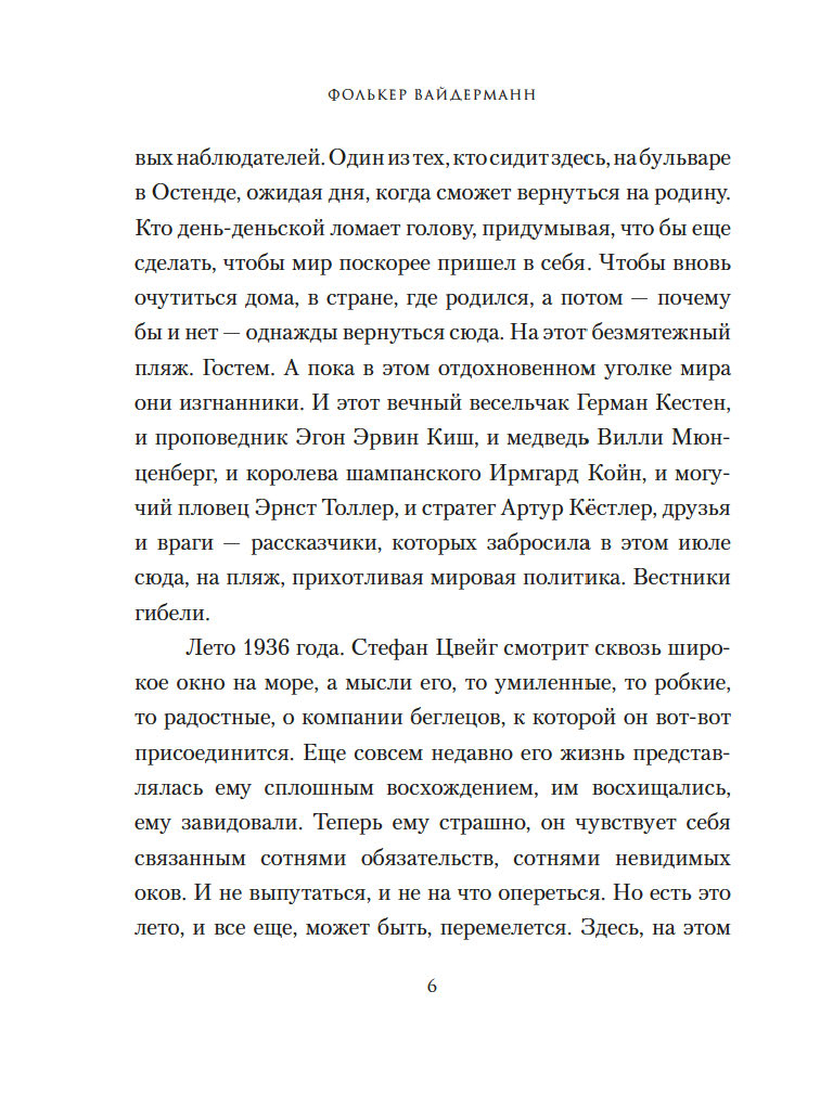 Биографический роман "Остенде. 1936 год: лето дружбы и печали" появился в 2014 году. Остенде – блистательный морской курорт, на котором в 1936 году собрались писатели, журналисты, издатели, поэты – Стефан Цвейг и Йозеф Рот, Артур Кестлер и Эрнст Толлер – все те, кому нет места в национал-социалистической Германии. Солнце, море, напитки. Это могло бы стать просто отдыхом с друзьями. Если бы не политическая ситуация, которая ухудшается с каждым днем, если бы их всех не преследовали, если бы их книги не были запрещены, если бы они не потеряли Родину. Поэты в бегах, писатели в изгнании. Фолькер Вайдерманн точно и проникновенно рассказывает историю того удивительного лета незадолго до Второй мировой войны, когда цвет немецкой творческой интеллигенции празднует жизнь (у большинства из них она скоро оборвется), как это могут делать только полностью отчаявшиеся люди.