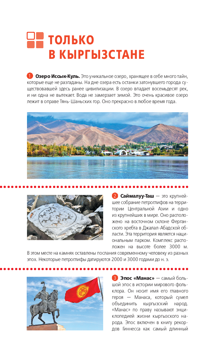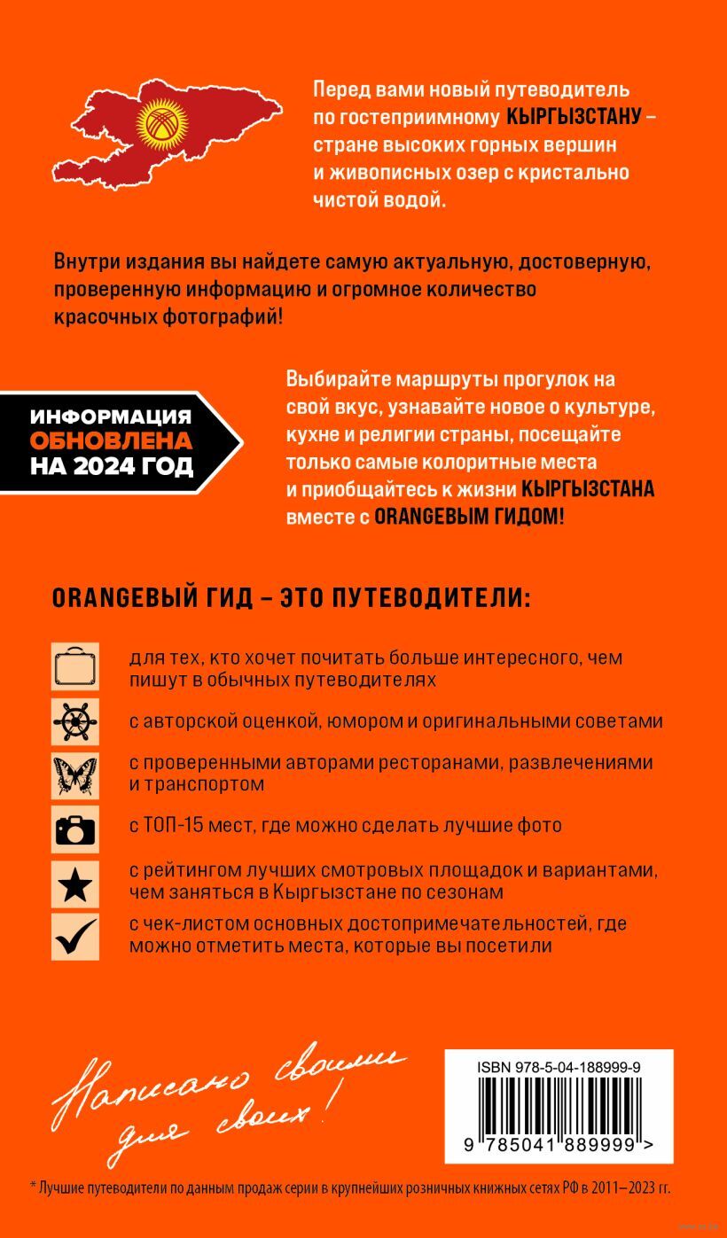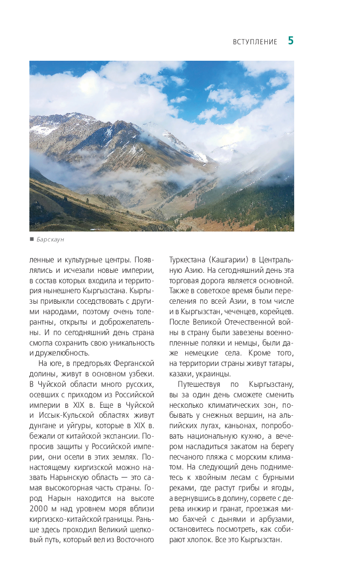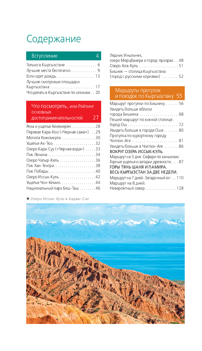 В нем содержится актуальная и полезная информация о главных городах страны, различные маршруты на любой вкус, подсказки, что делать, если идет дождь, или где искать лучшие смотровые площадки, а также множество полезных авторских советов. Посетите жемчужину Центральной Азии озеро Иссык-Куль, отправьтесь в ущелье Кекемерен или прогуляйтесь в курортном городе Чолпон-Ате – выбор только за вами!