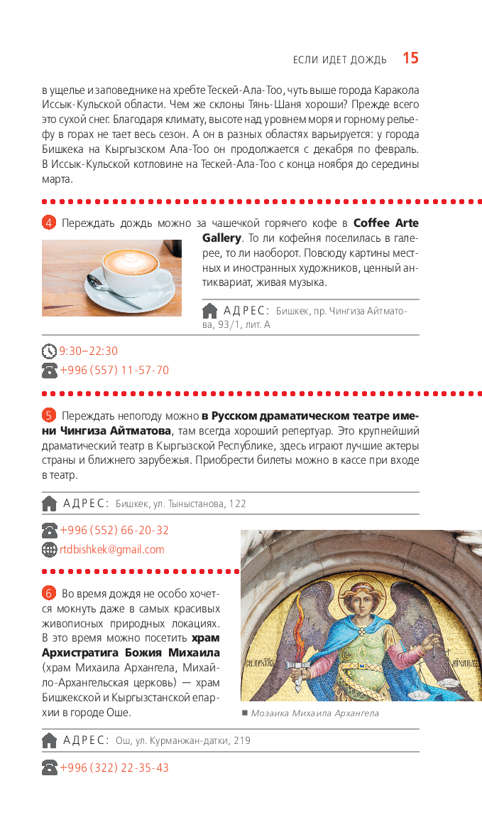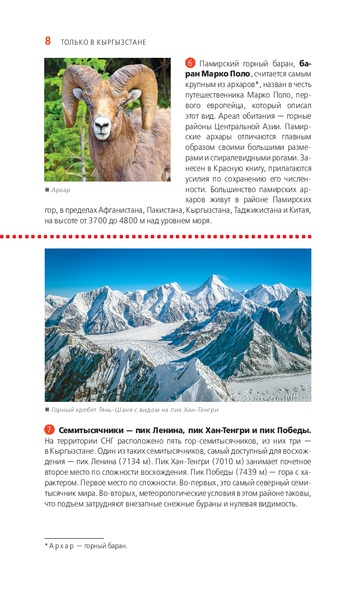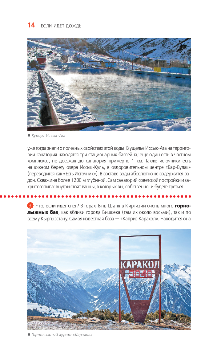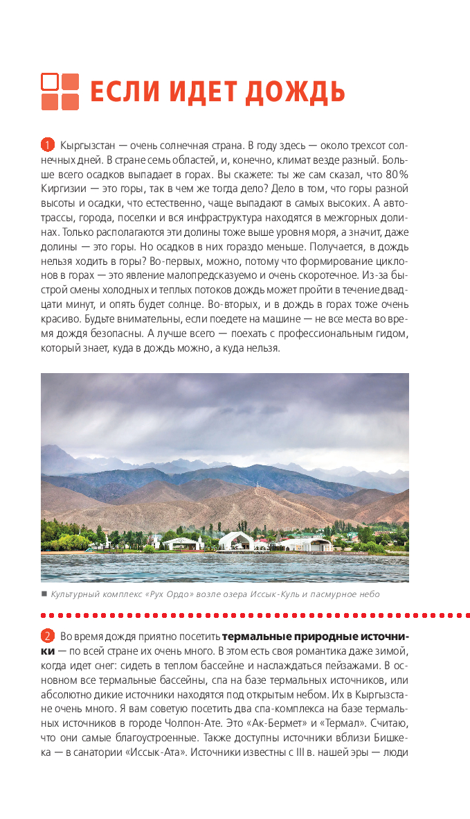 В нем содержится актуальная и полезная информация о главных городах страны, различные маршруты на любой вкус, подсказки, что делать, если идет дождь, или где искать лучшие смотровые площадки, а также множество полезных авторских советов. Посетите жемчужину Центральной Азии озеро Иссык-Куль, отправьтесь в ущелье Кекемерен или прогуляйтесь в курортном городе Чолпон-Ате – выбор только за вами!