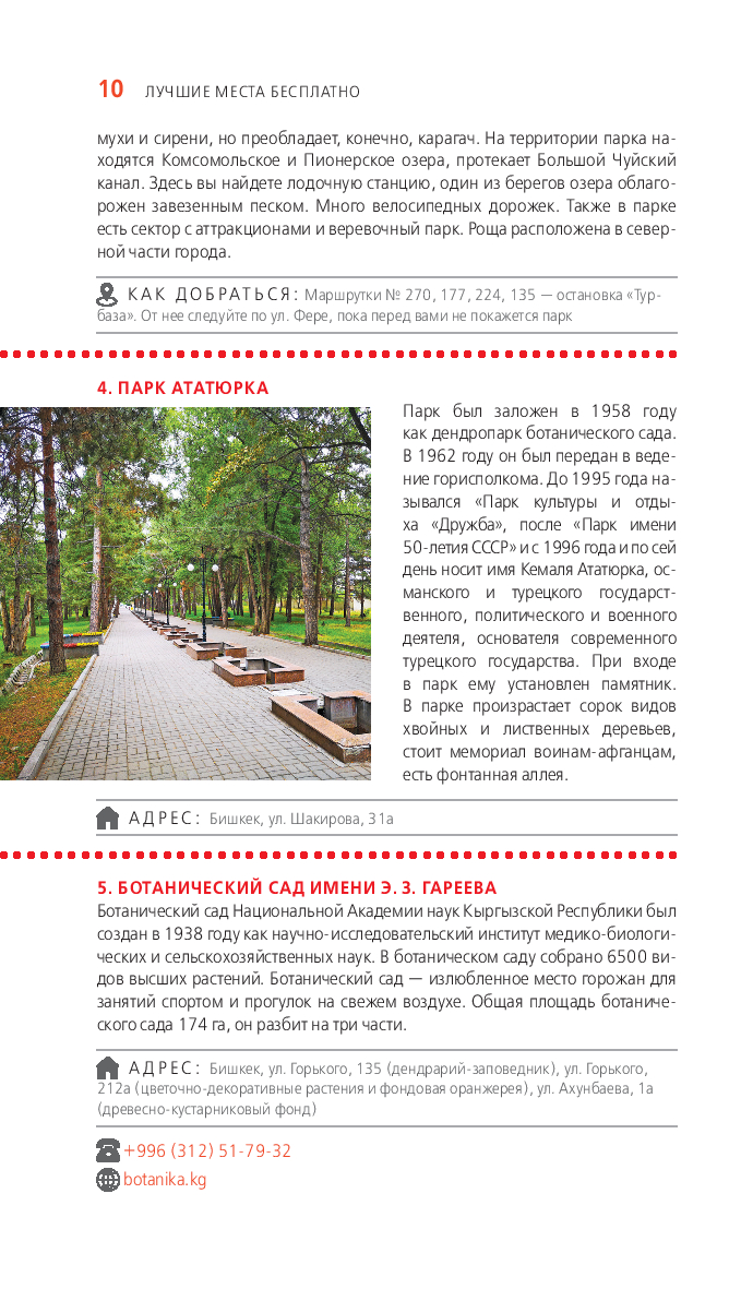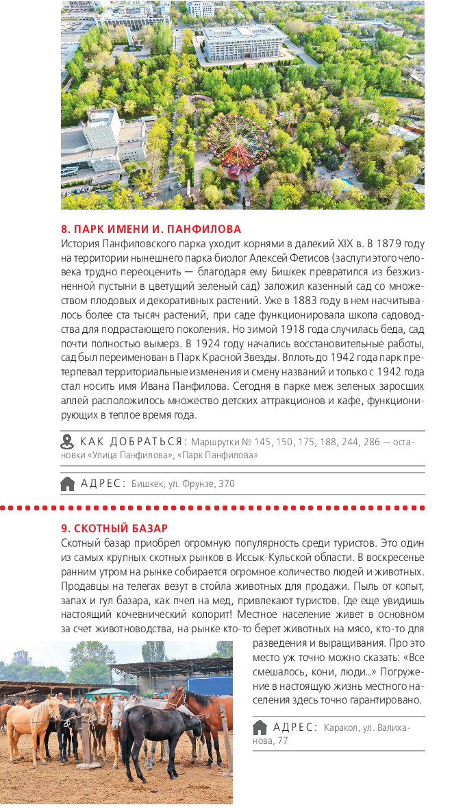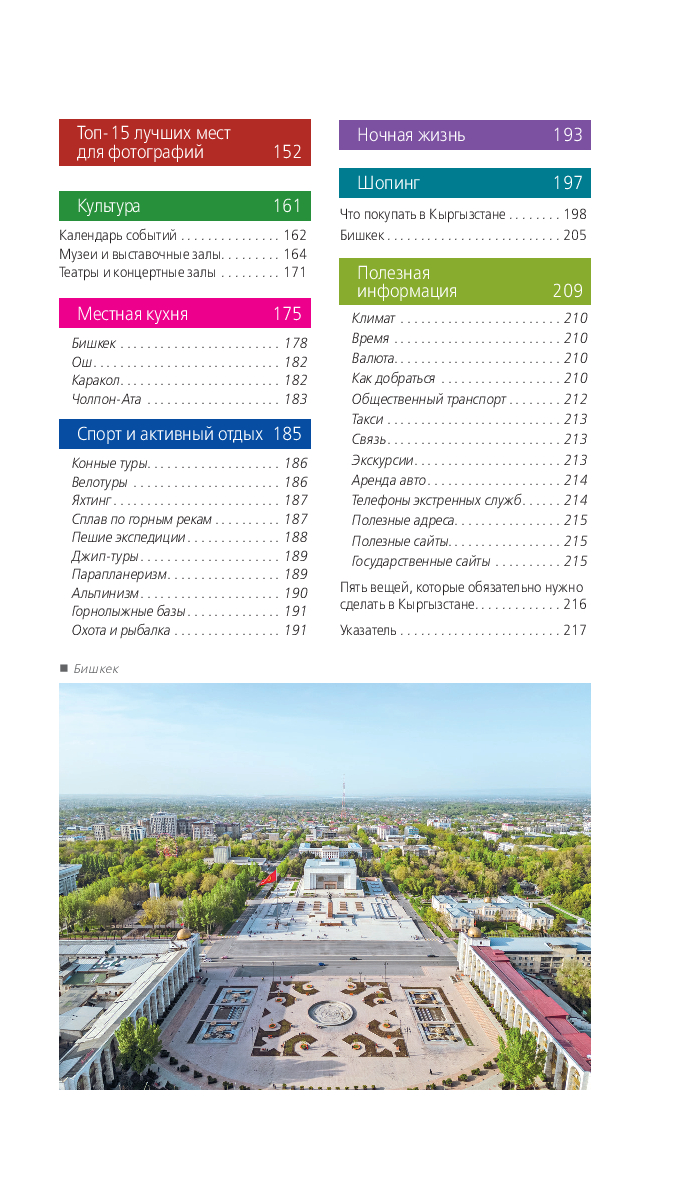Вас ждут варианты прогулок по Бишкеку, а также готовые маршруты поездок по главным достопримечательностям Кыргызстана. Сориентироваться на местности помогут удобные карты, расположенные на страницах путеводителя.