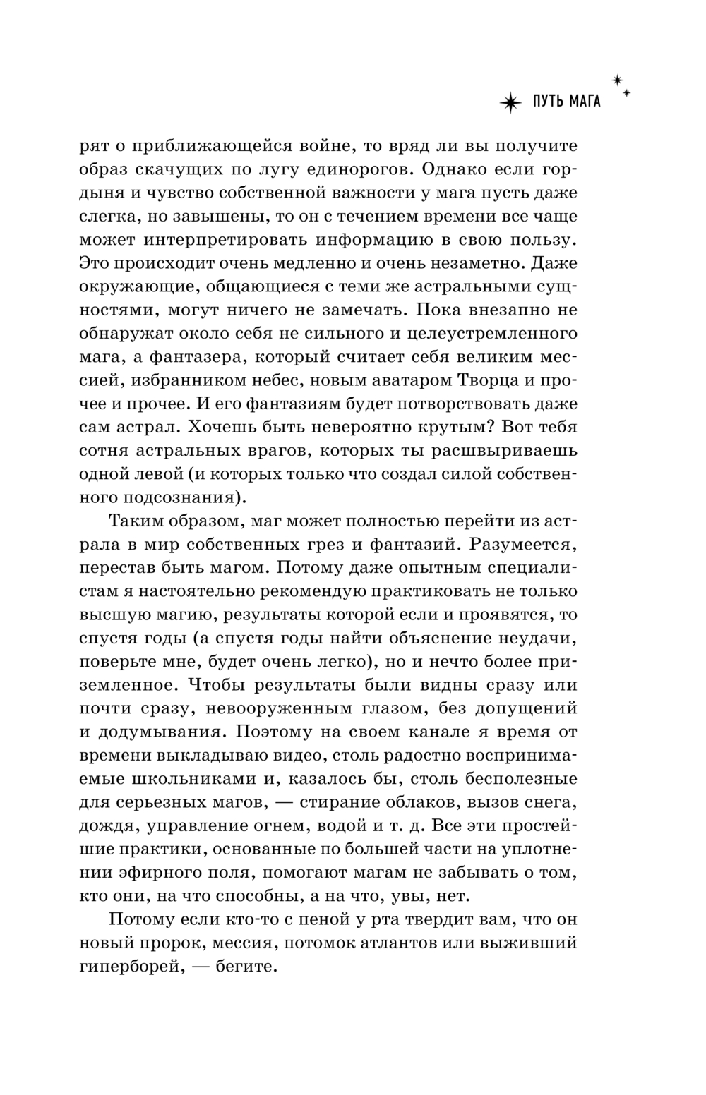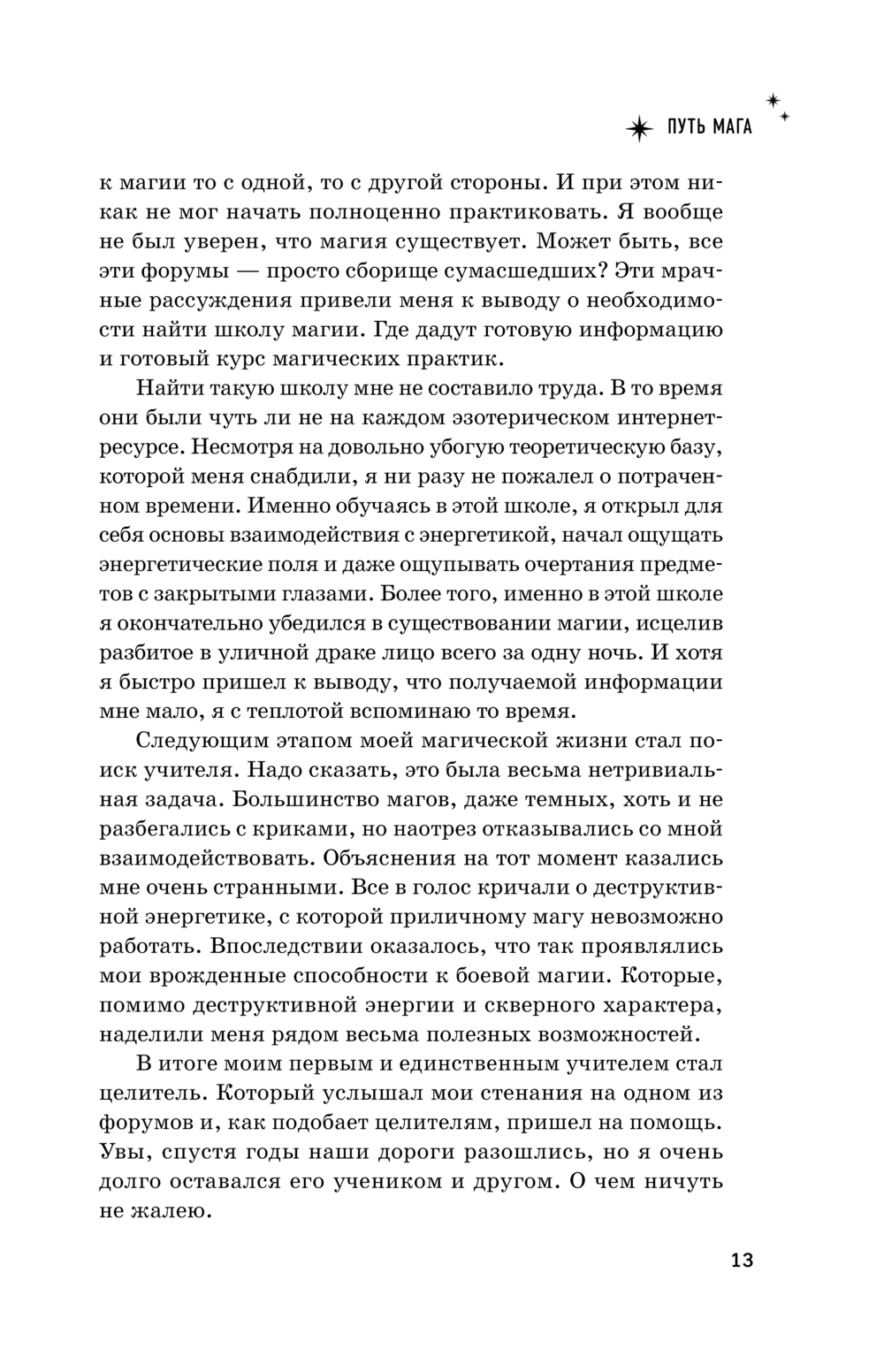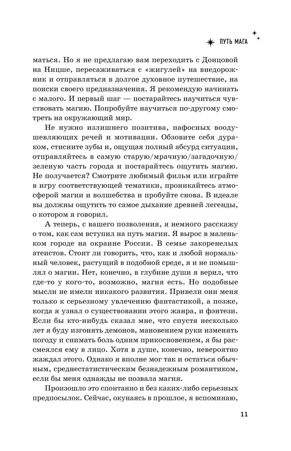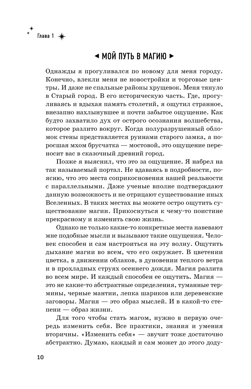 "Много лет назад, когда я делал свои первые робкие шаги на пути магического развития, мне пришлось очень долго искать информацию. И, прямо скажем, лучше бы мне никогда не знать многое из того, что мне приходилось читать. Однако совершенно случайно я столкнулся с несколькими практиками, которые позволили мне сперва осознать первые намеки на существование магии в нашем мире, а затем ощутить на себе ее действие. Это, в свою очередь, позволило мне понять и принять тот факт, что магия не где-то там, не с кем-то другим – она прямо здесь, достаточно просто сесть и начать практиковать. Путем, которым прошел когда-то я сам, я хотел бы поделиться с вами. В этой книге и в последующих шаг за шагом я буду знакомить вас с магией, минуя те ошибки и заблуждения, через которые мне самому пришлось пройти.