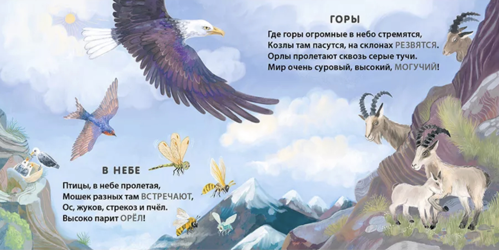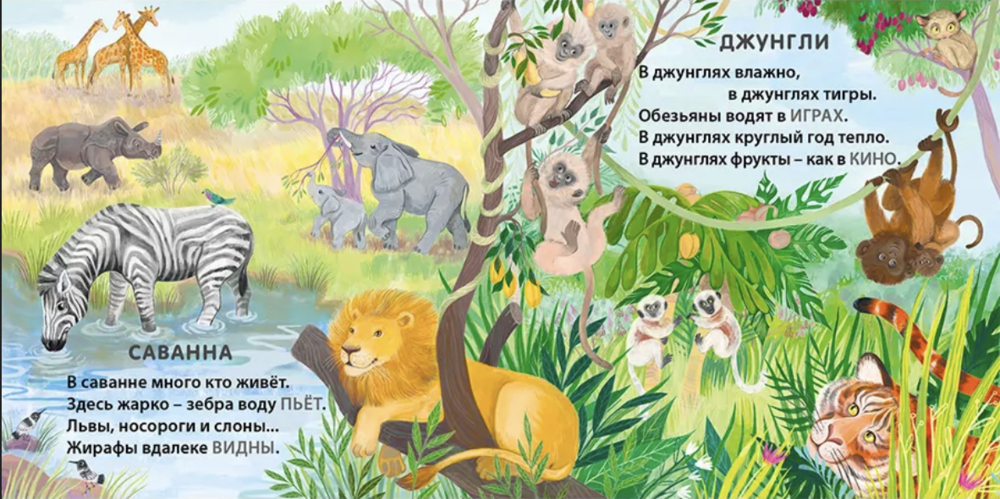 Стихи написаны так, чтобы ребёнок смог сам срифмовать названия животных и другие слова.