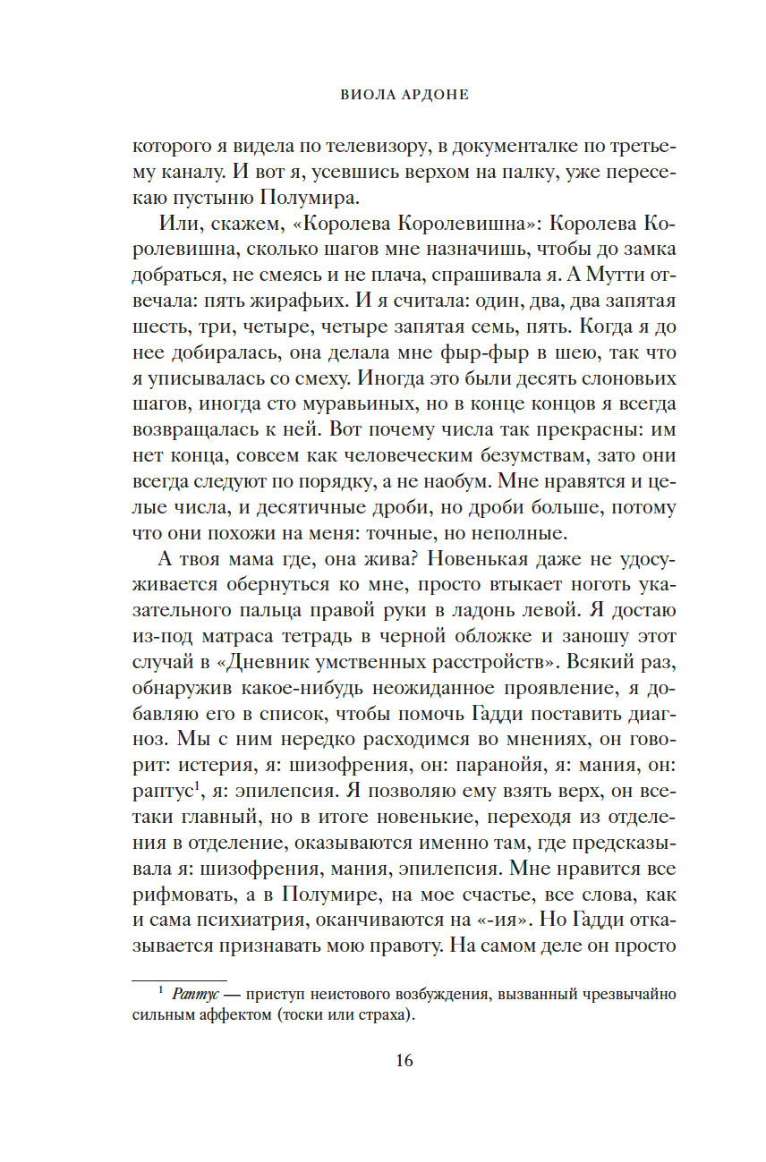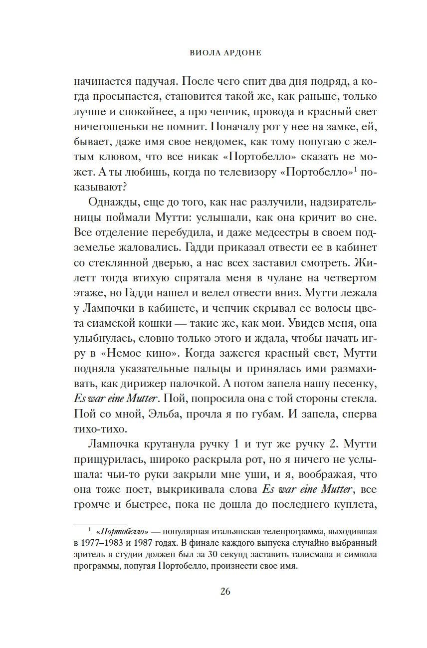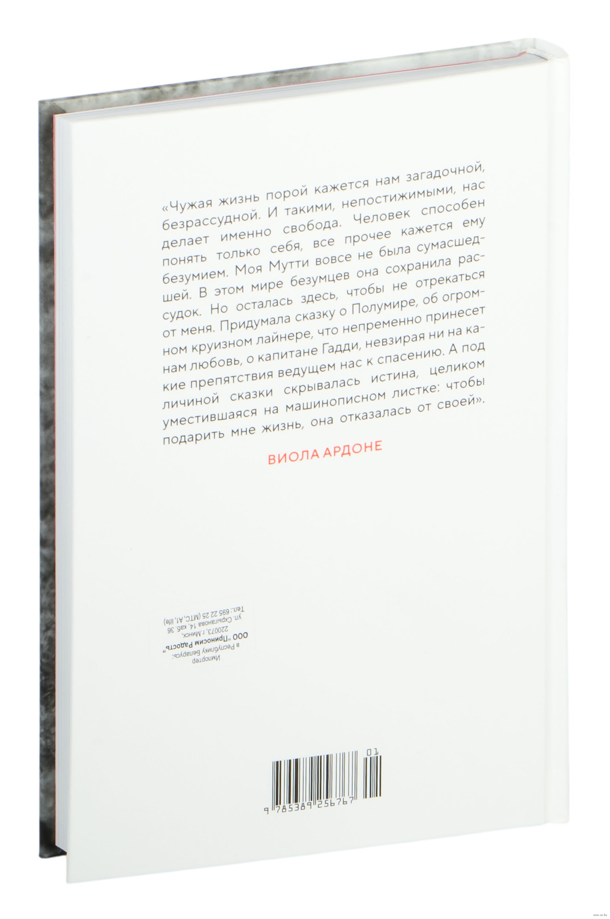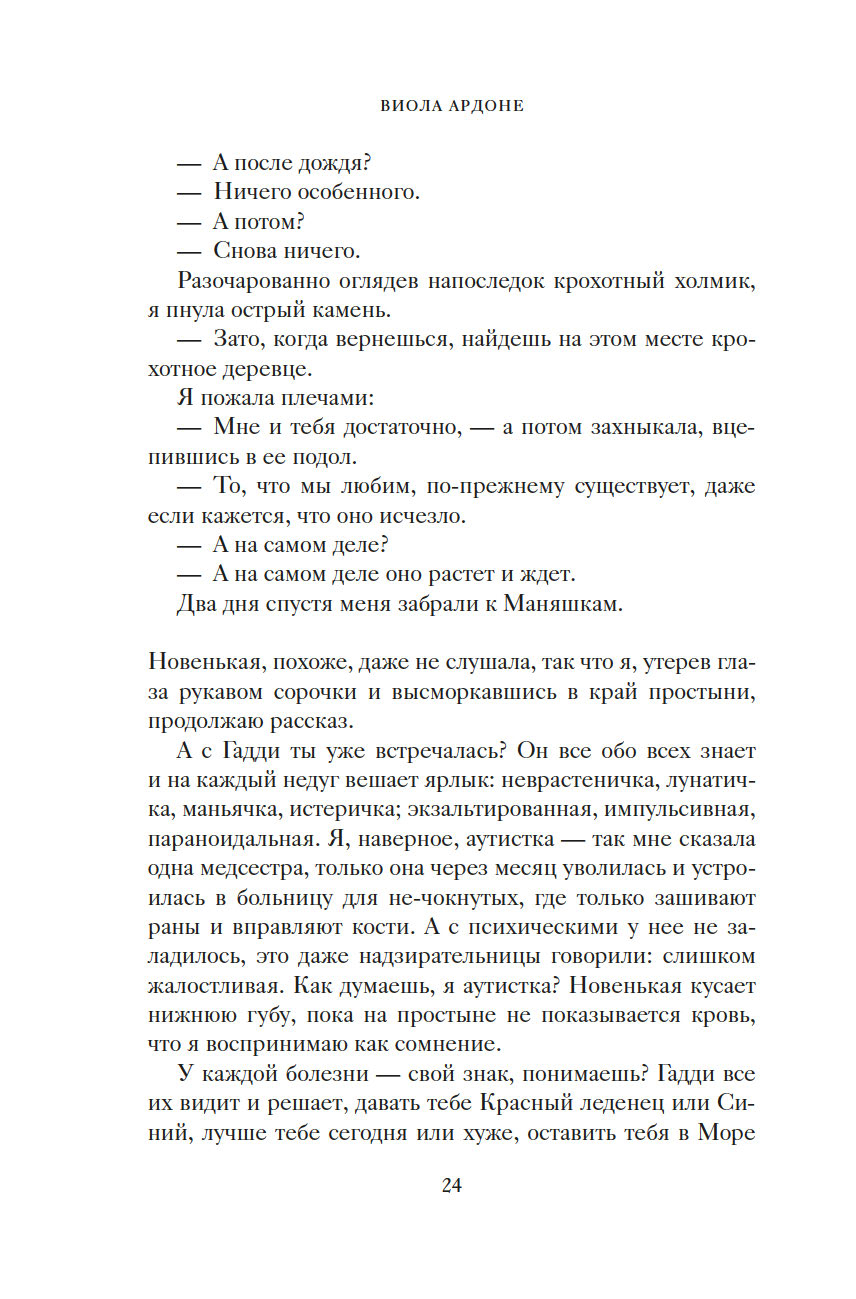 "Чужая жизнь порой кажется нам загадочной, безрассудной. И такими, непостижимыми, нас делает именно свобода. Человек способен понять только себя, все прочее кажется ему безумием. Моя Мутти вовсе не была сумасшедшей. В этом мире безумцев она сохранила рассудок. Но осталась здесь, чтобы не отрекаться от меня. Придумала сказку о Полумире, об огромном круизном лайнере, что непременно принесет нам любовь, о капитане Гадди, невзирая ни на какие препятствия ведущем нас к спасению. А под личиной сказки скрывалась истина, целиком уместившаяся на машинописном листке: чтобы подарить мне жизнь, она отказалась от своей" (Виола Ардоне).