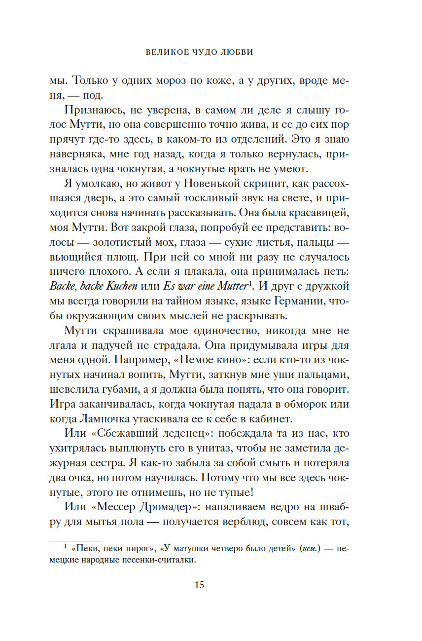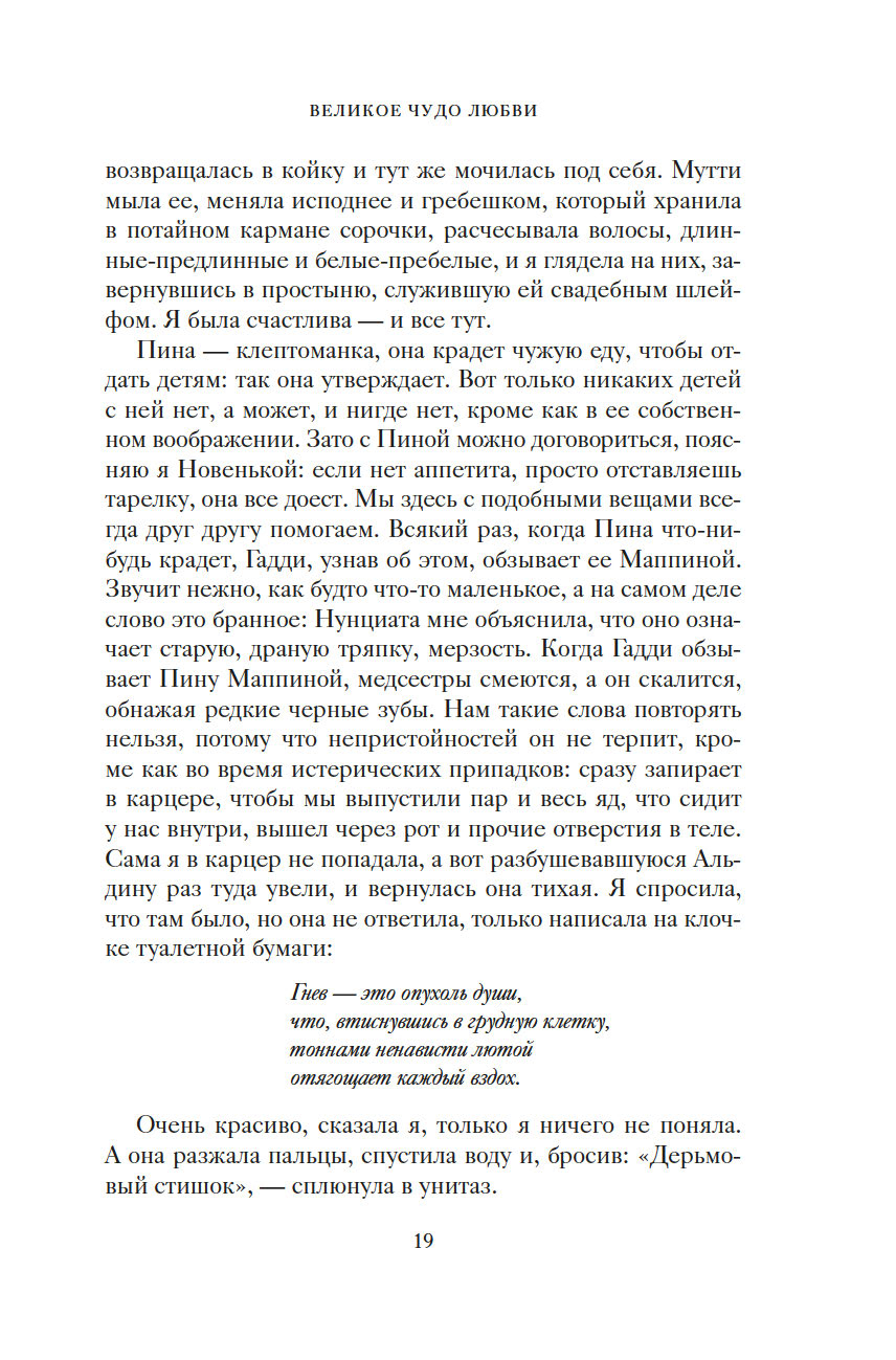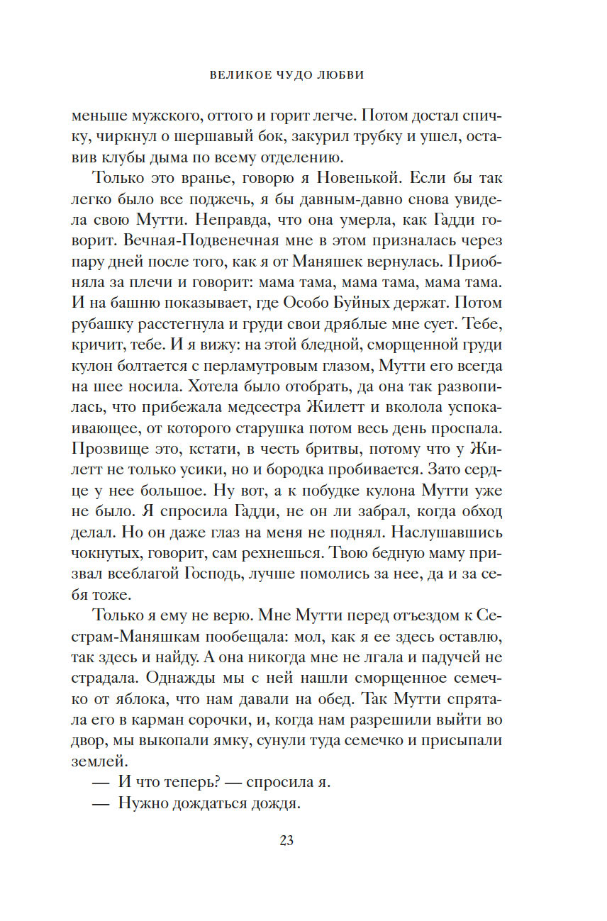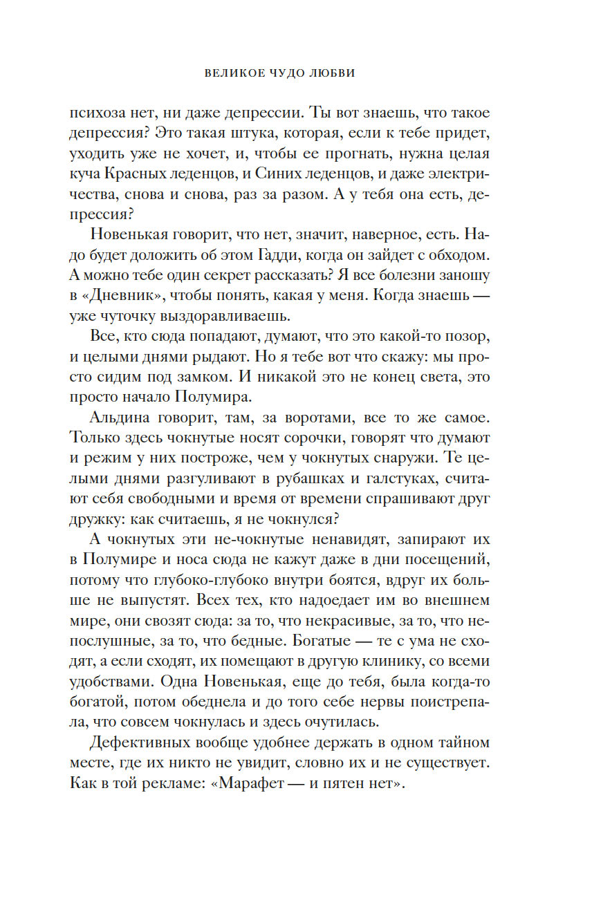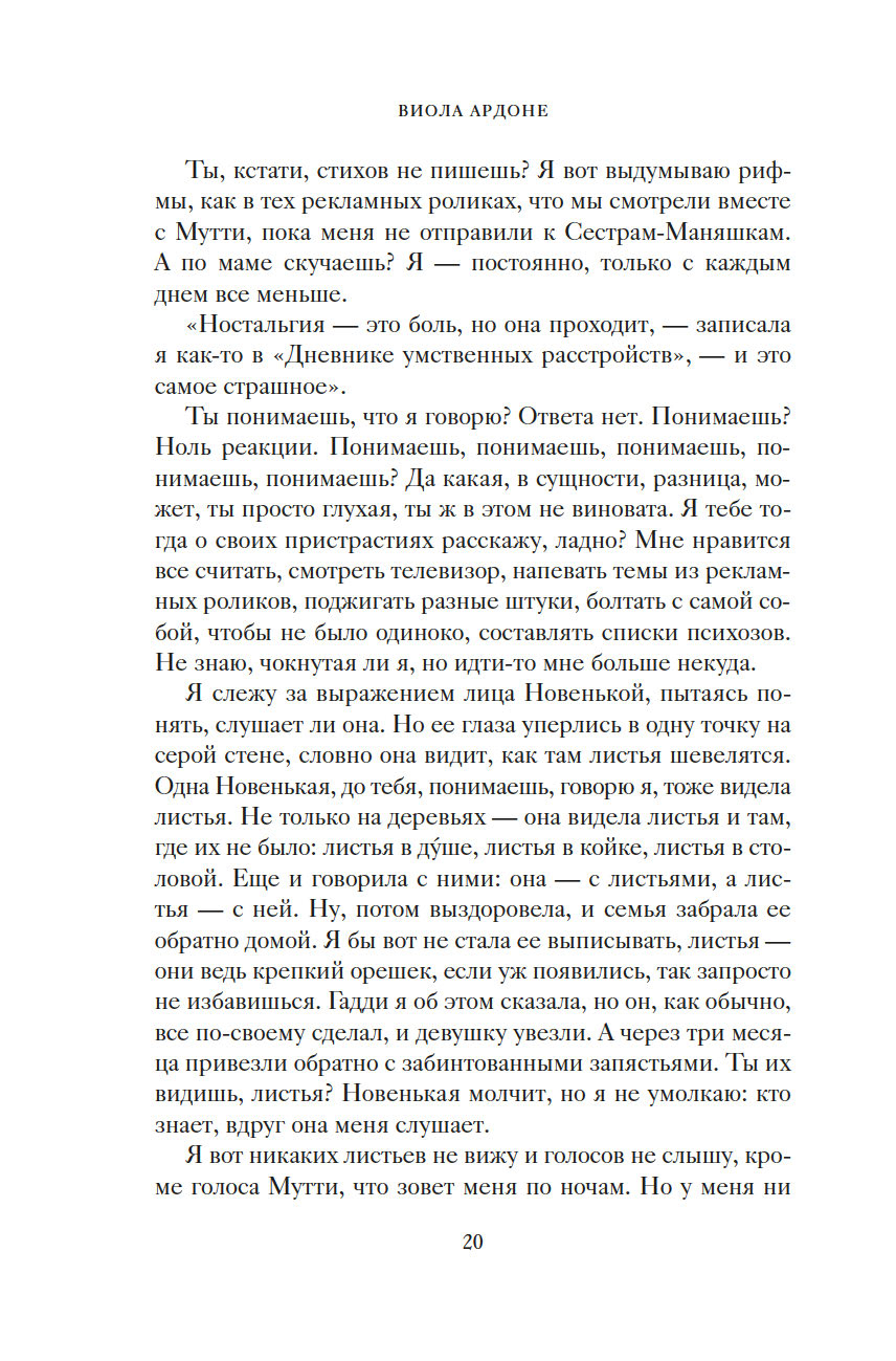 "Чужая жизнь порой кажется нам загадочной, безрассудной. И такими, непостижимыми, нас делает именно свобода. Человек способен понять только себя, все прочее кажется ему безумием. Моя Мутти вовсе не была сумасшедшей. В этом мире безумцев она сохранила рассудок. Но осталась здесь, чтобы не отрекаться от меня. Придумала сказку о Полумире, об огромном круизном лайнере, что непременно принесет нам любовь, о капитане Гадди, невзирая ни на какие препятствия ведущем нас к спасению. А под личиной сказки скрывалась истина, целиком уместившаяся на машинописном листке: чтобы подарить мне жизнь, она отказалась от своей" (Виола Ардоне).