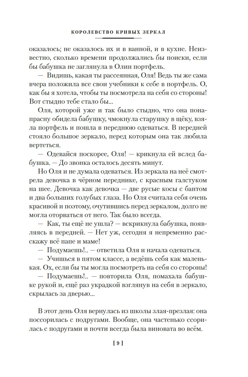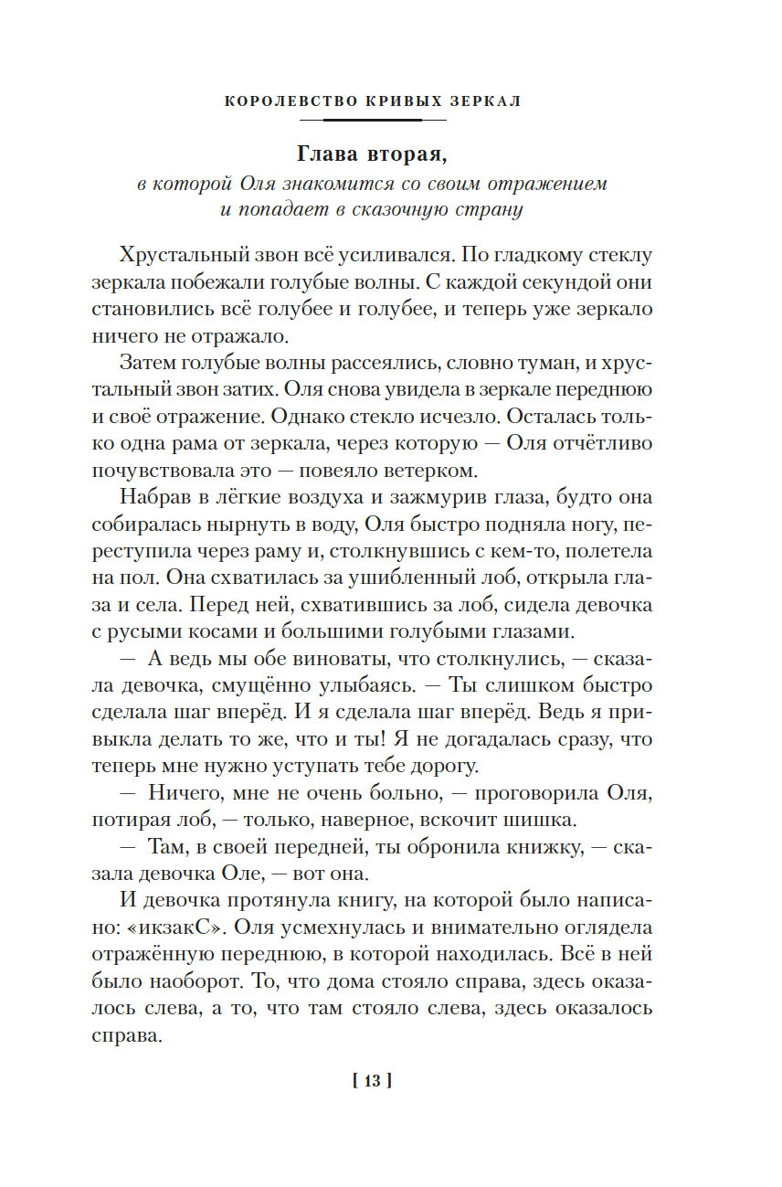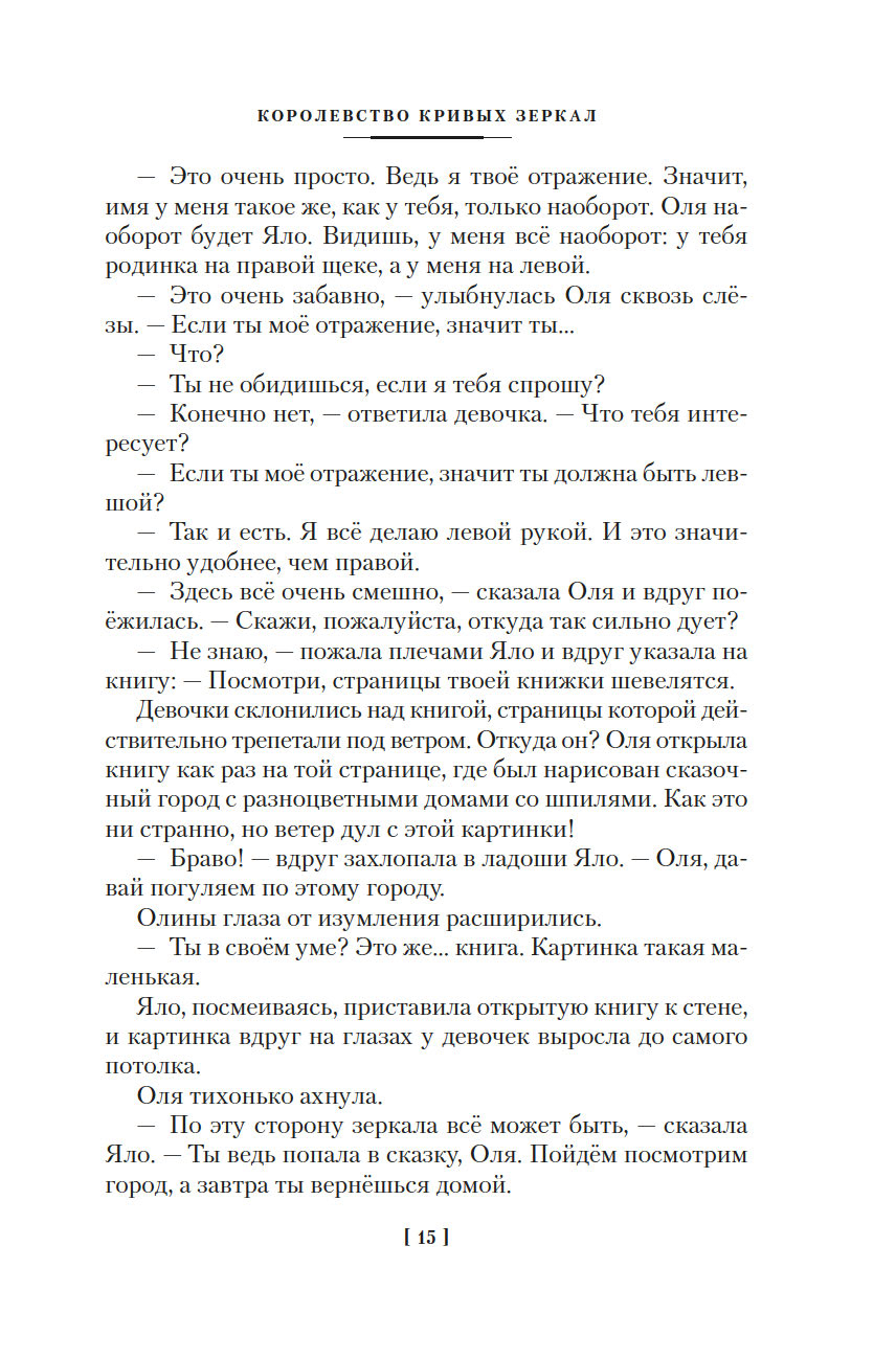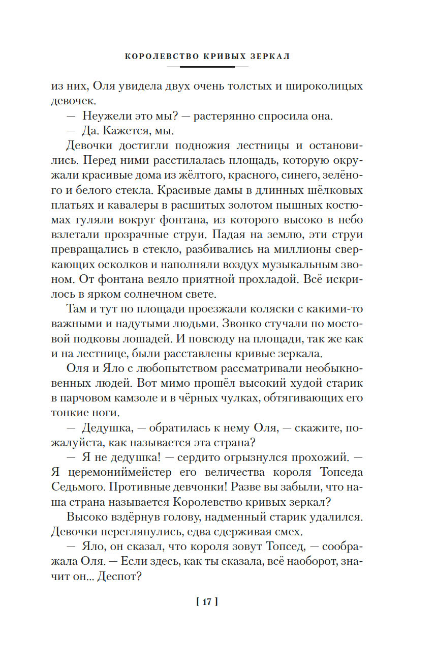 Оля – обычная девочка, вот только до жути непослушная, рассеянная и ленивая. Рано вставать в школу или класть вещи на место – не для неё. Оля не замечала в себе недостатков, пока не познакомилась со своим отражением по имени Яло. Внешне Яло – точная копия Оли, в остальном же полная её противоположность: смелая, прилежная и внимательная. Волшебным образом девочки попадают в Королевство кривых зеркал, где крошка хлеба кажется целой булкой, глупцов называют мудрецами, а уродин считают настоящими красавицами – в общем, там всё наоборот. Чтобы вернуться домой, Оле вместе с Яло предстоит пережить много опасных приключений, вызволить из темницы зеркальщика Гурда, а также одолеть невежественного короля Топседа и его жестокого министра Нушрока, которые уже долгое время угнетают простой народ.