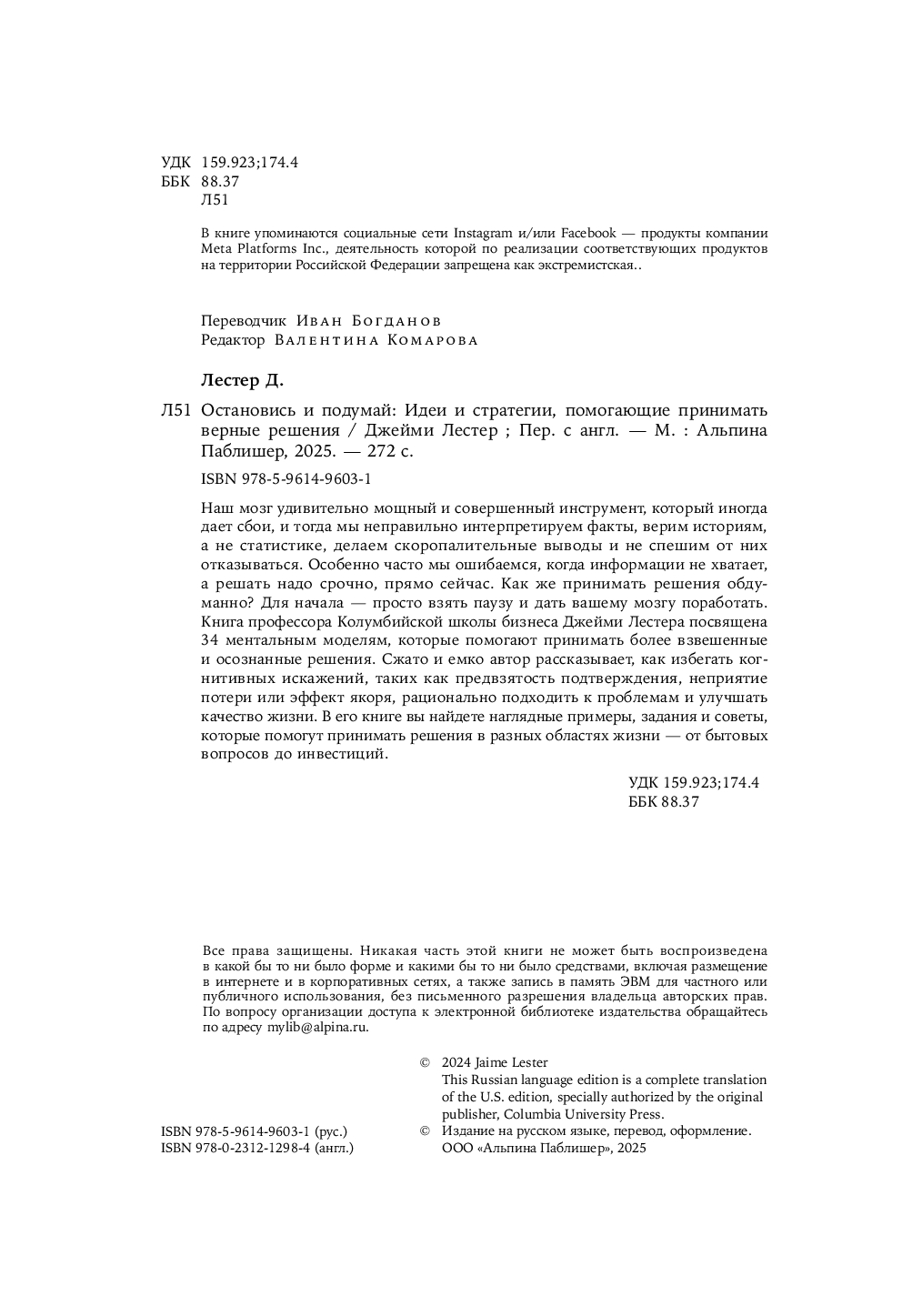 Книга профессора Колумбийской школы бизнеса Джейми Лестера посвящена 34 ментальным моделям, которые помогают принимать более взвешенные и осознанные решения. Сжато и емко автор рассказывает, как избегать когнитивных искажений, таких как предвзятость подтверждения, неприятие потери или эффект якоря, рационально подходить к проблемам и улучшать качество жизни.