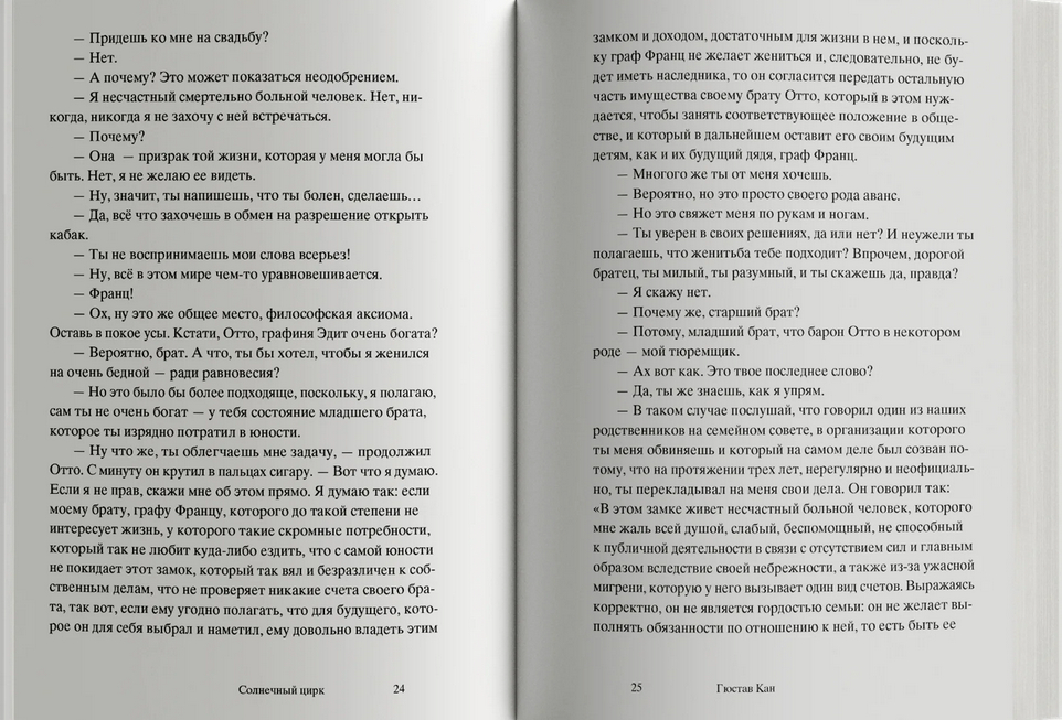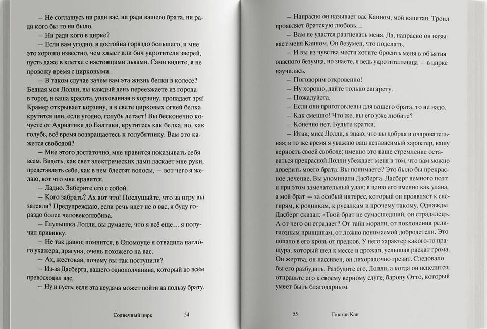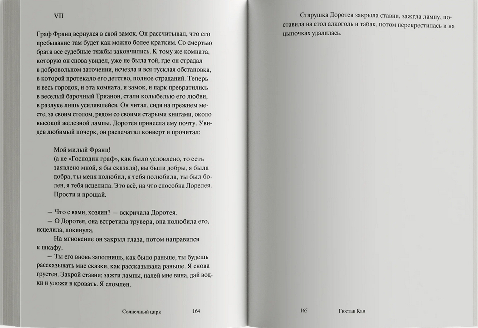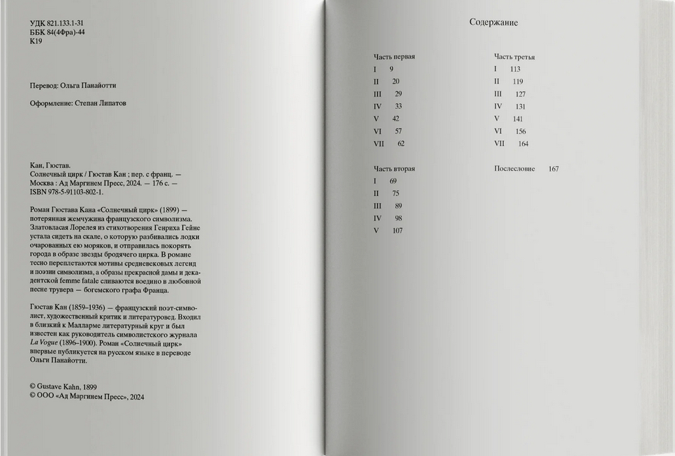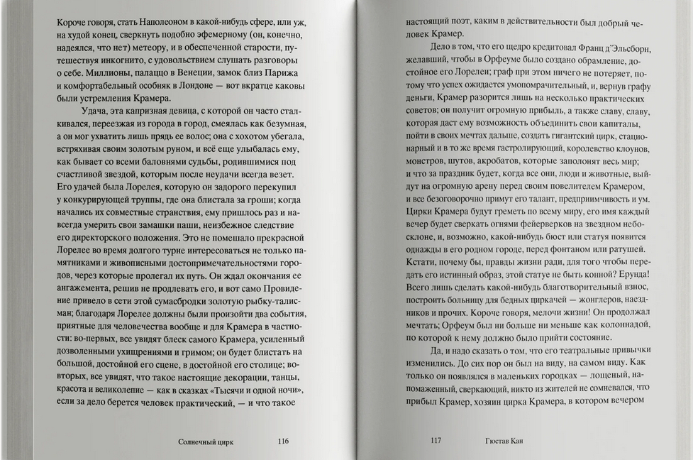 Роман Гюстава Кана "Солнечный цирк" (1899) – потерянная жемчужина французского символизма. Златовласая Лорелея из стихотворения Генриха Гейне устала сидеть на скале, о которую разбиваются лодки очарованных ею моряков, и отправилась покорять города в образе звезды бродячего цирка. Она странствует по городам Европы в сопровождении свиты из рыцарей в доспехах, сарацинов на арабских скакунах, прекрасных итальянок и резвых андалусок, львов и тигров. А зовут ее теперь солнечная принцесса! В небольшом городе она встречает меланхоличного богемского графа, которого семейный совет хочет лишить наследства в пользу младшего брата, бойкого офицера драгунского полка. Солнечная принцесса пробуждает Франца от многолетнего сна, он покидает родной замок и отправляется странствовать с бродячим цирком.