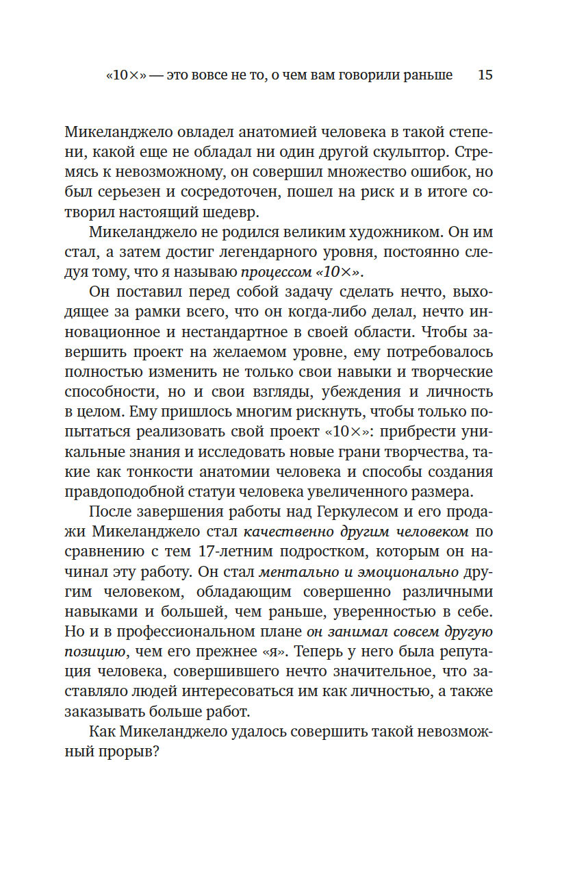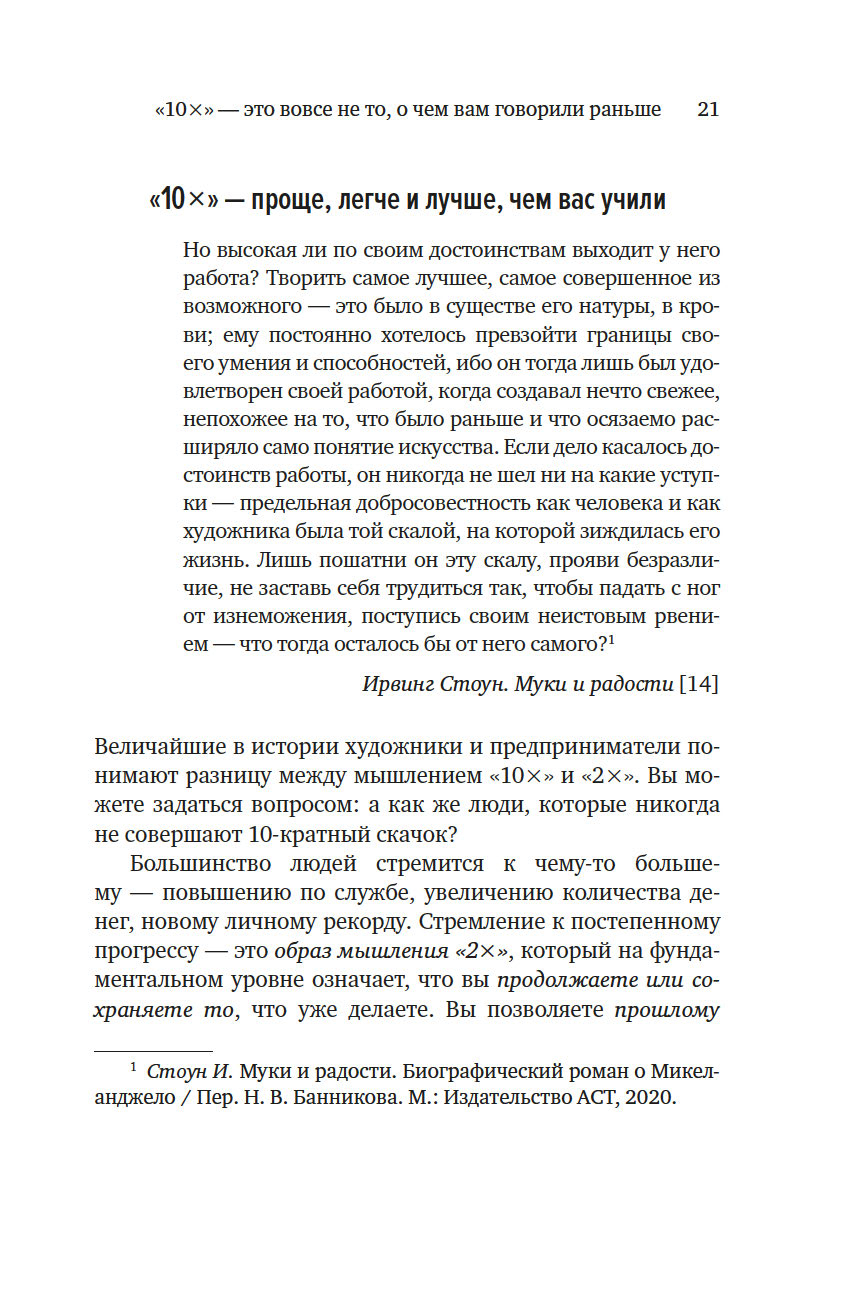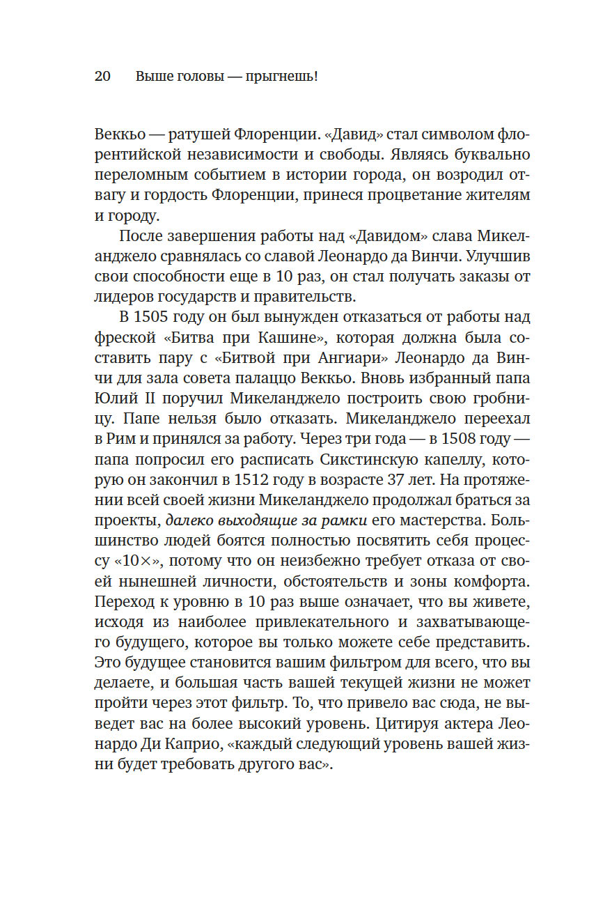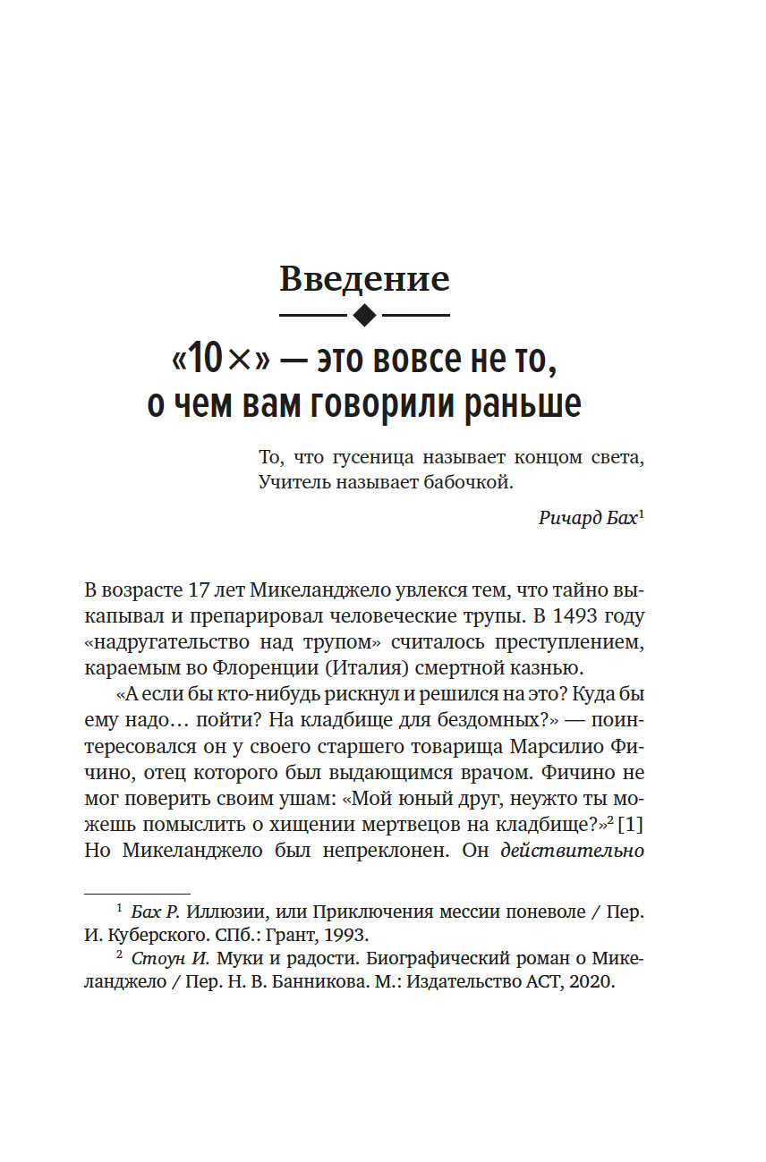 4 свободы – время, деньги, взаимоотношения, цели. 150+ свободных дней в год – восстановление, отдых, общение, креатив. Эффективность, амбиции, уникальность, саморазвитие – все это авторская концепция "10х". Бросайте себе вызов раз за разом! Сложные задачи упрощают решение. Будьте в 10 раз лучше! Действуя по-старому, вы никогда не добьетесь перемен, только отказавшись от 80% вашей рутины и сосредоточившись на 20% задач, вы прорветесь на новый уровень. Верьте даже в несбыточные мечты! Нет ничего продуктивнее высоких целей, только они заставляют действовать. Знаете, что Джим Керри в 1990 году выписал себе чек на 10 млн долларов? Тогда неизвестный комик дал себе пять лет, чтобы стать высокооплачиваемым актером. В 1995 году после успеха фильма "Тупой и еще тупее" Джим обналичил свой "чек мечты".