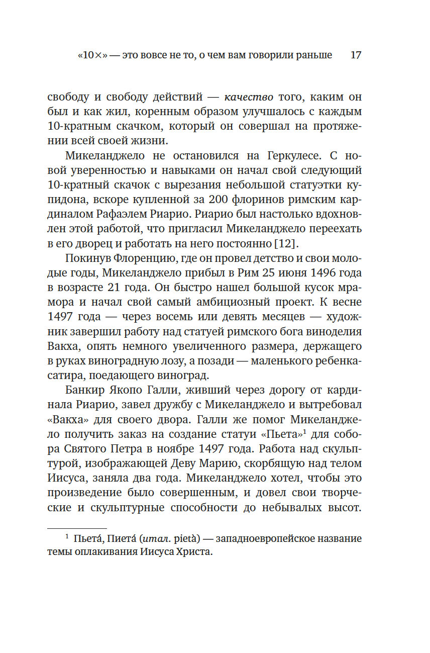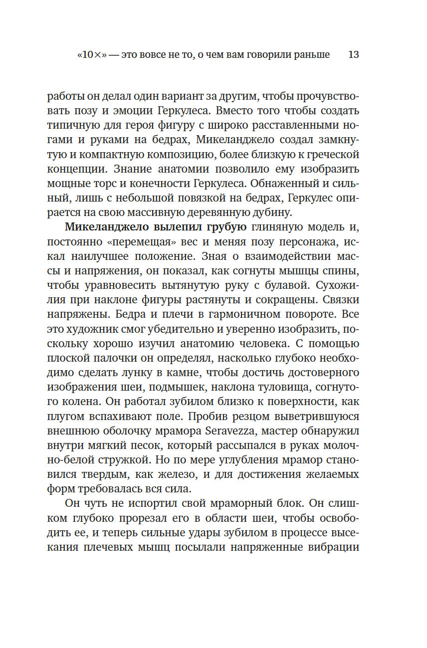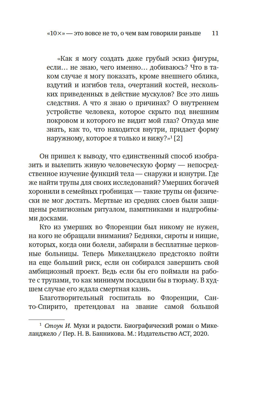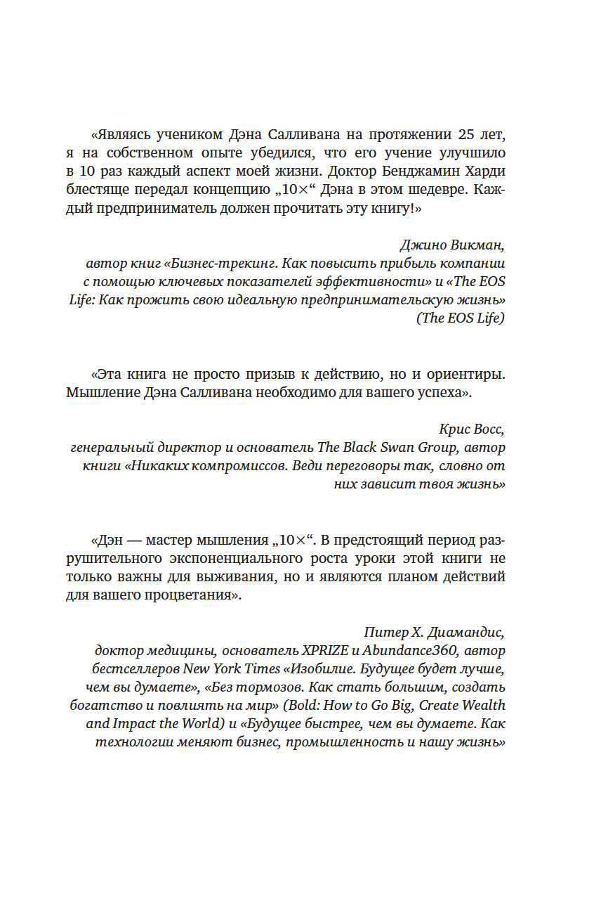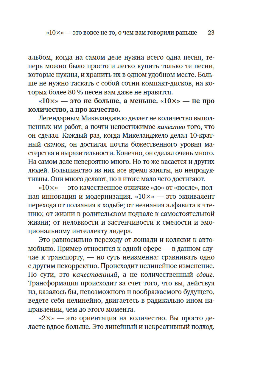 4 свободы – время, деньги, взаимоотношения, цели. 150+ свободных дней в год – восстановление, отдых, общение, креатив. Эффективность, амбиции, уникальность, саморазвитие – все это авторская концепция "10х". Бросайте себе вызов раз за разом! Сложные задачи упрощают решение. Будьте в 10 раз лучше! Действуя по-старому, вы никогда не добьетесь перемен, только отказавшись от 80% вашей рутины и сосредоточившись на 20% задач, вы прорветесь на новый уровень. Верьте даже в несбыточные мечты! Нет ничего продуктивнее высоких целей, только они заставляют действовать. Знаете, что Джим Керри в 1990 году выписал себе чек на 10 млн долларов? Тогда неизвестный комик дал себе пять лет, чтобы стать высокооплачиваемым актером. В 1995 году после успеха фильма "Тупой и еще тупее" Джим обналичил свой "чек мечты".