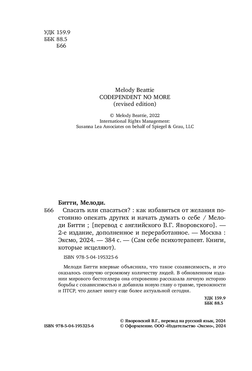 Мелоди Битти впервые объяснила, что такое созависимость, и это оказалось созвучно огромному количеству людей. В обновленном издании мирового бестселлера она откровенно рассказала личную историю борьбы с созависимостью и добавила новую главу о травме, тревожности и ПТСР, что делает книгу еще более актуальной сегодня.