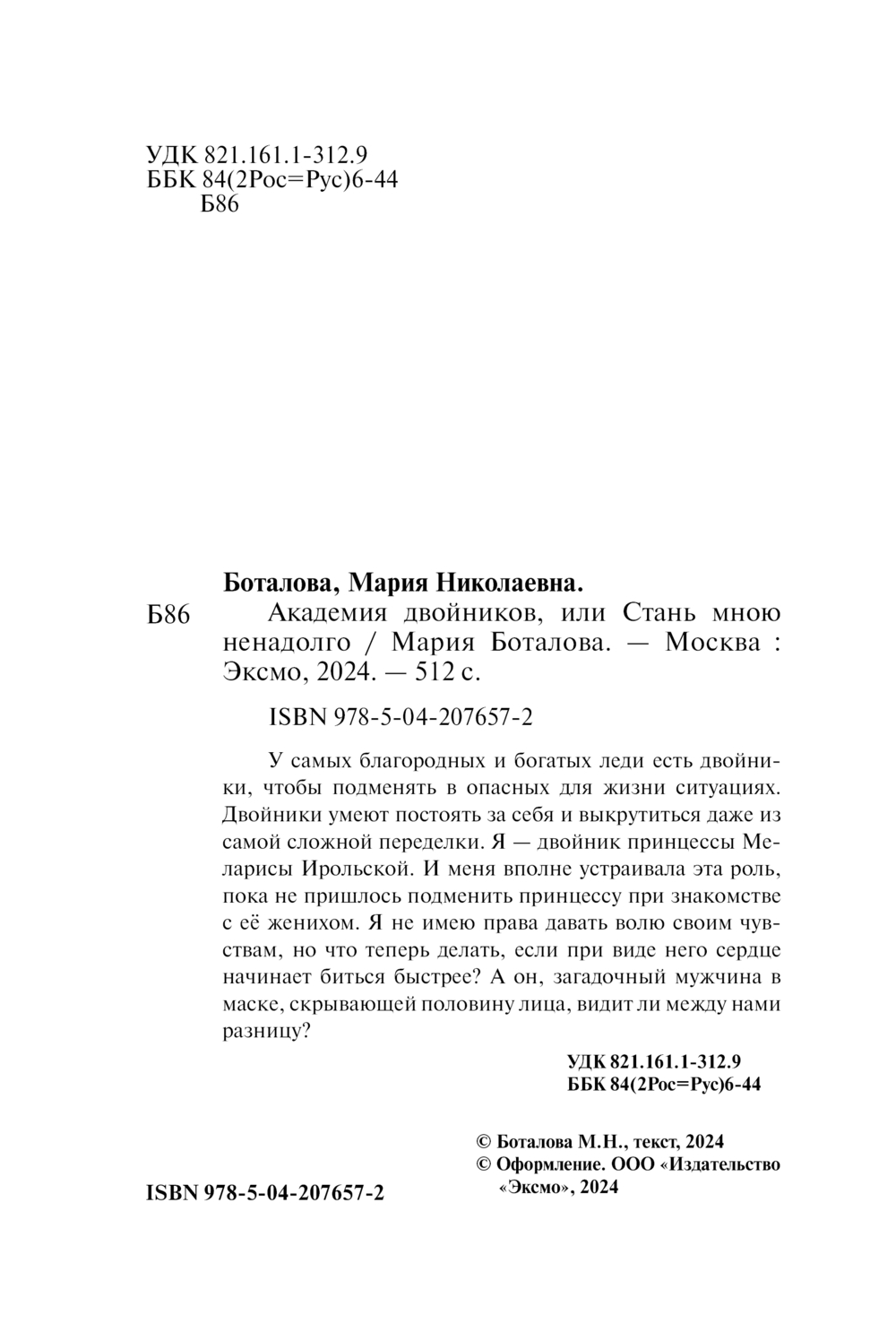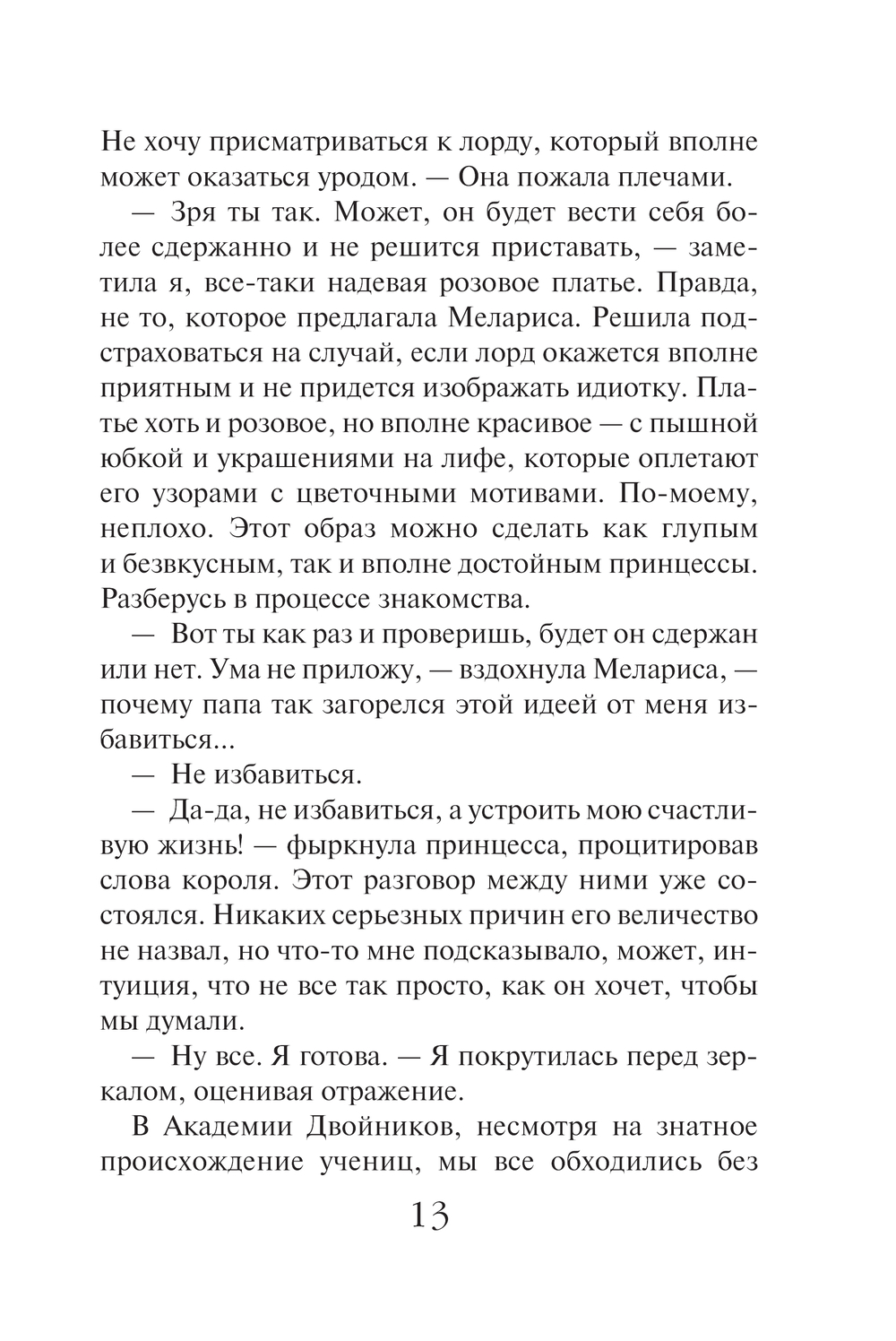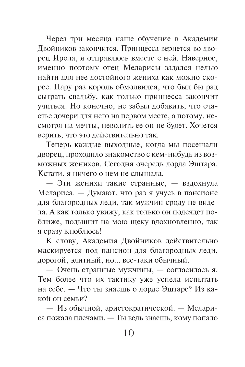 У самых благородных и богатых леди есть двойники, чтобы подменять в опасных для жизни ситуациях. Двойники умеют постоять за себя и выкрутиться даже из самой сложной переделки. Я – двойник принцессы Меларисы Ирольской. И меня вполне устраивала эта роль, пока не пришлось подменить принцессу при знакомстве с её женихом. Я не имею права давать волю своим чувствам, но что теперь делать, если при виде него сердце начинает биться быстрее? А он, загадочный мужчина в маске, скрывающей половину лица, видит ли между нами разницу?