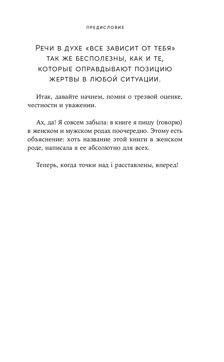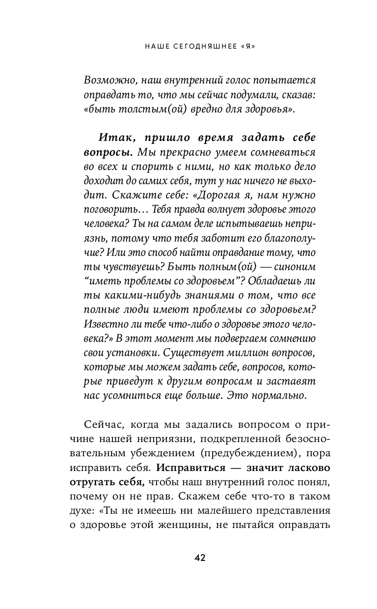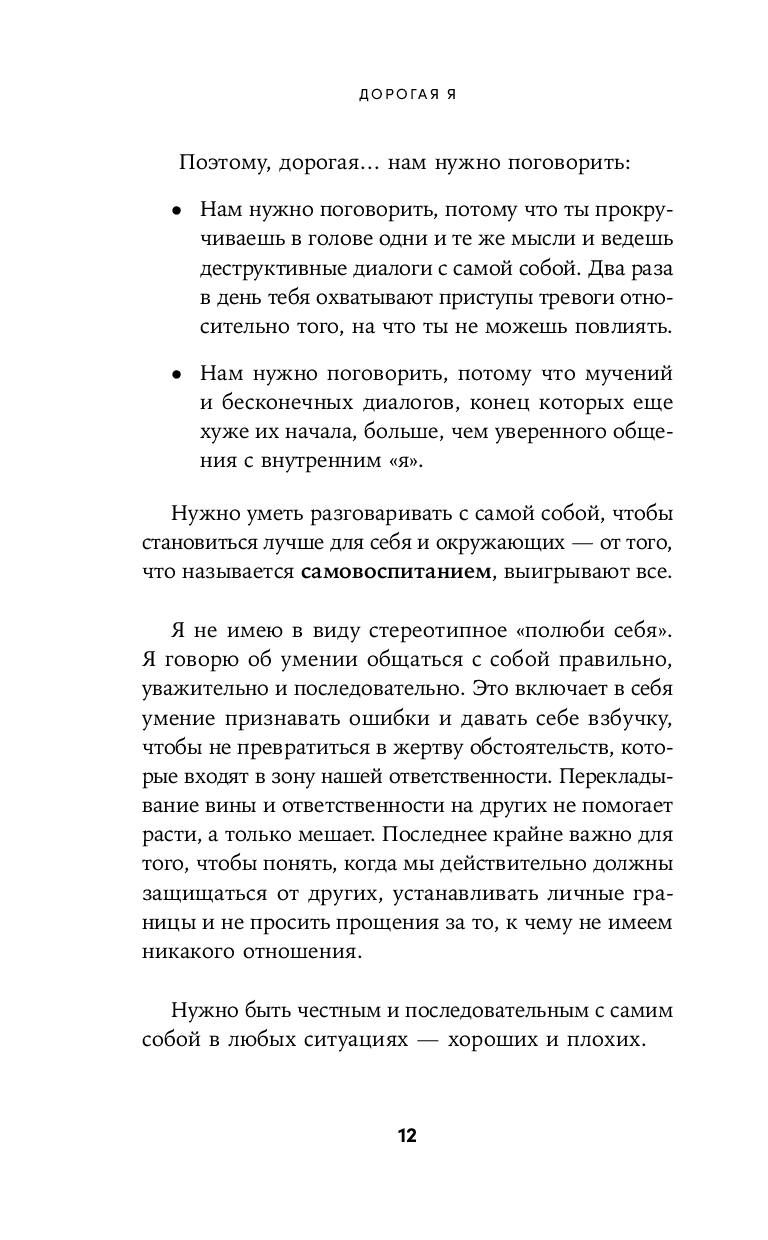 Разговору с самой собой посвящена книга Элизабет Клапес, одного из самых известных современных психологов в Испании. На собственном опыте она узнала, что путь к гармонии начинается с честного диалога с собой и осознания собственных чувств и потребностей. Принятие своей уязвимости, умение прислушиваться к себе и отказ от претензий на идеальность помогают избавиться от страха, обрести внутренний покой и жить счастливо. Выполняя практические упражнения из этой книги, вы научитесь устанавливать контакт с собственными эмоциями и строить здоровые отношения с собой и окружающими.