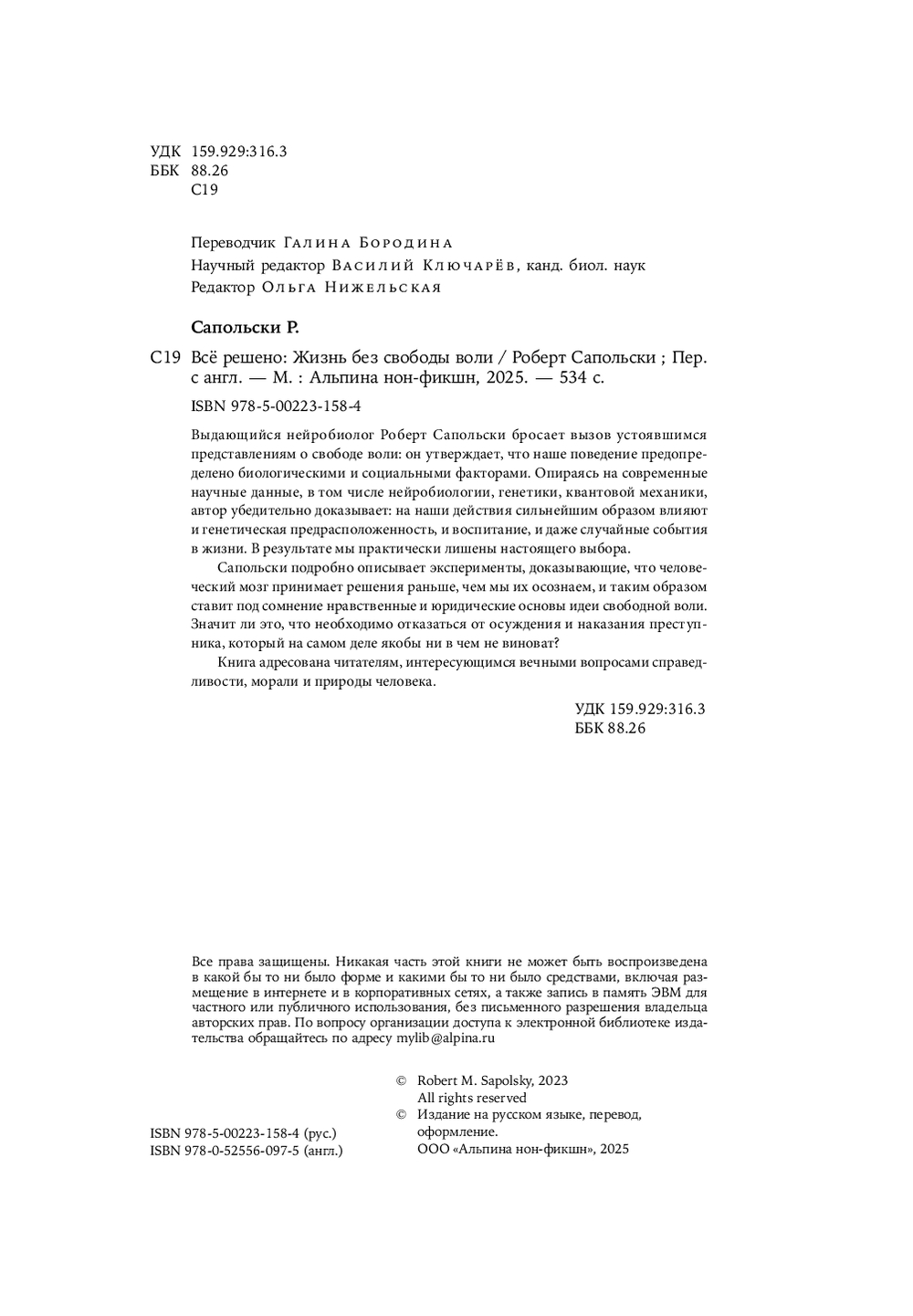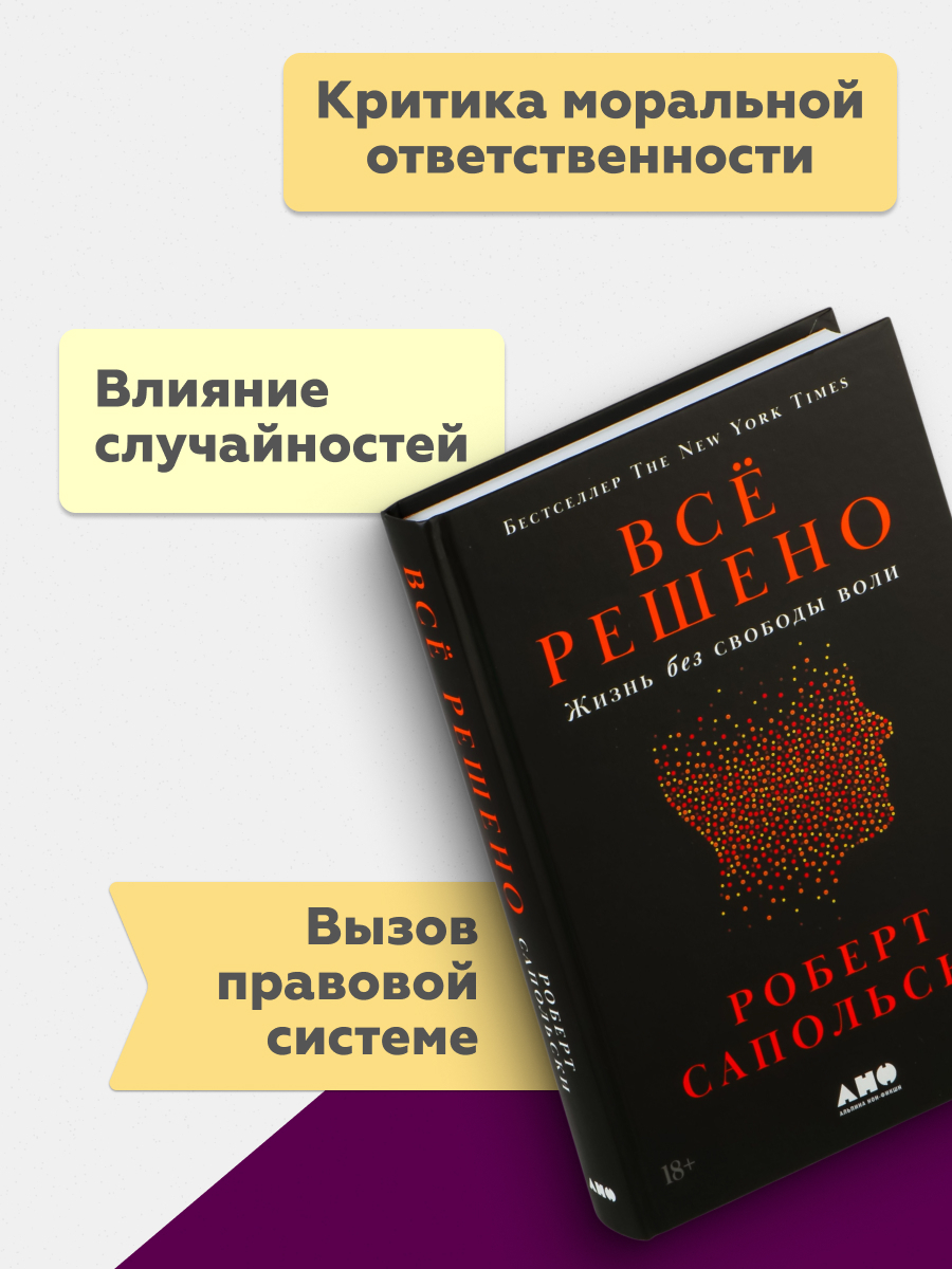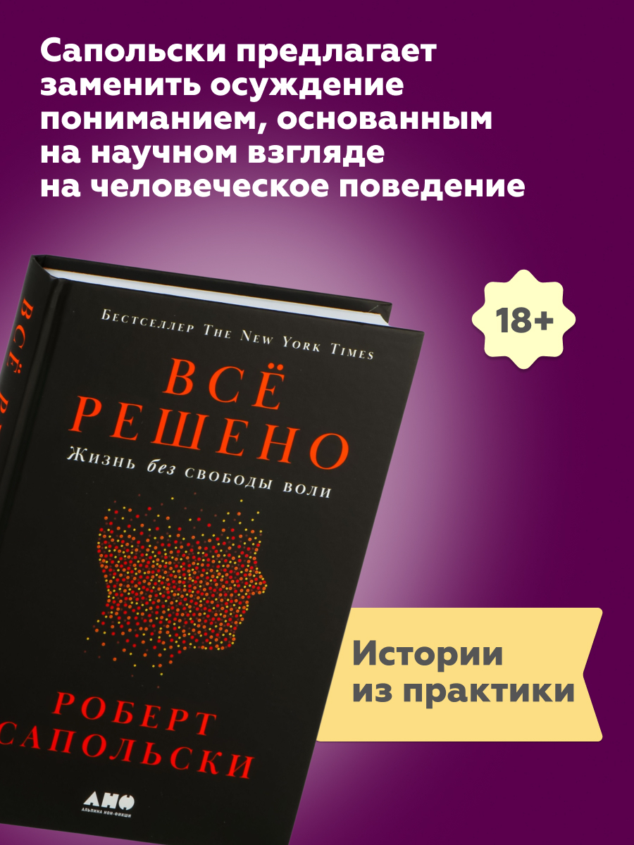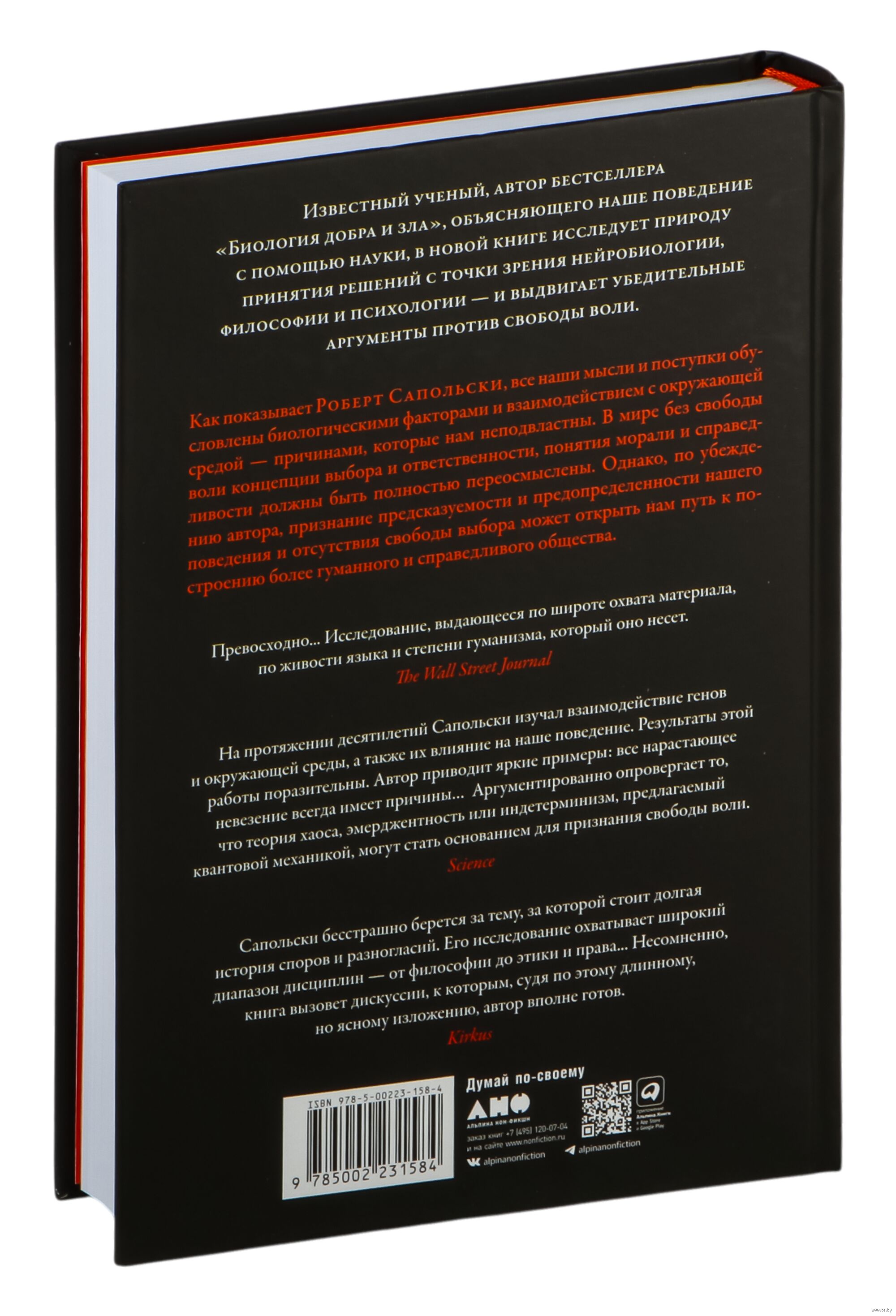 Выдающийся нейробиолог Роберт Сапольски бросает вызов устоявшимся представлениям о свободе воли: он утверждает, что наше поведение предопределено биологическими и социальными факторами. Опираясь на современные научные данные, в том числе нейробиологии, генетики, квантовой механики, автор убедительно доказывает: на наши действия сильнейшим образом влияют и генетическая предрасположенность, и воспитание, и даже случайные события в жизни. В результате мы практически лишены настоящего выбора.