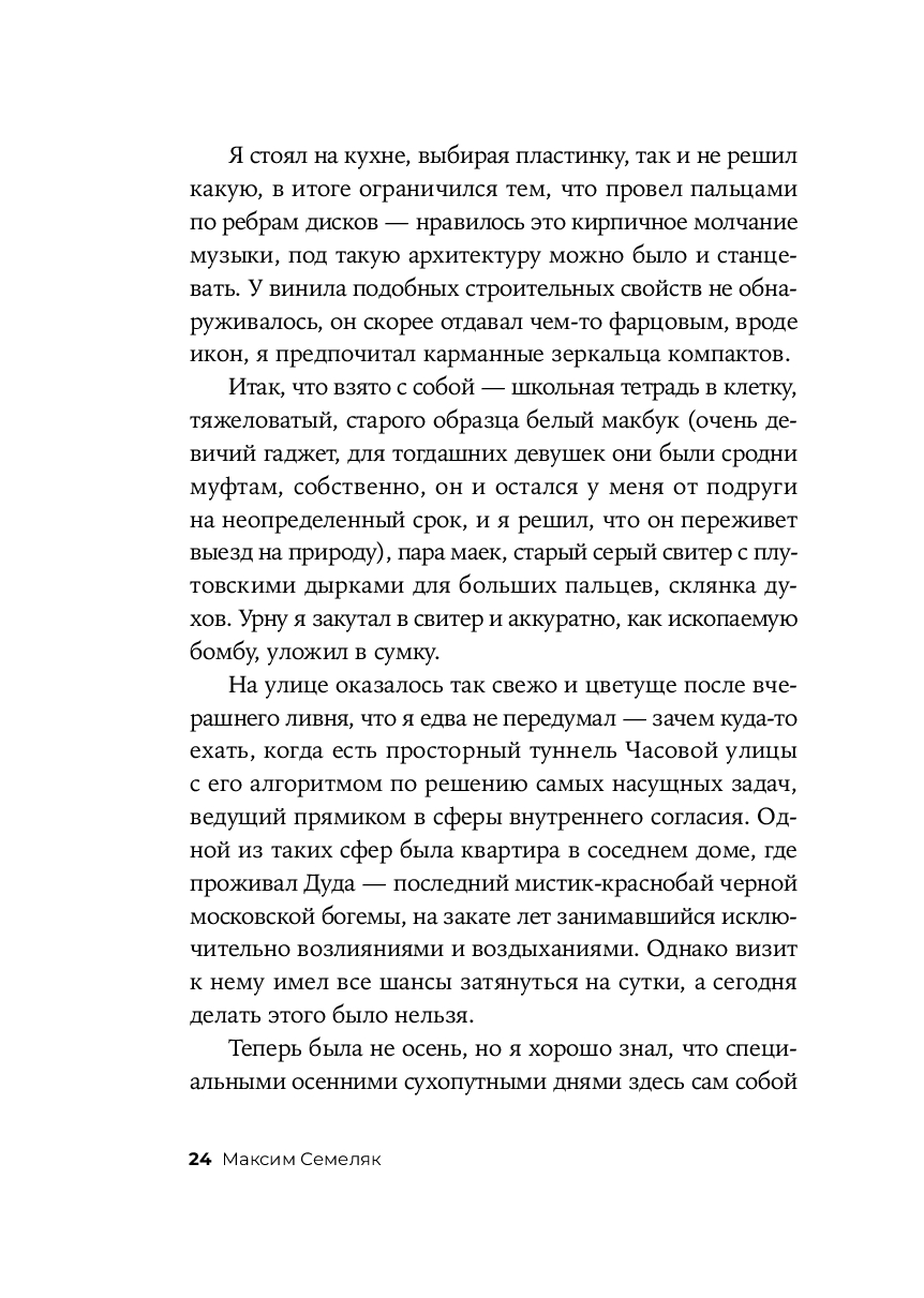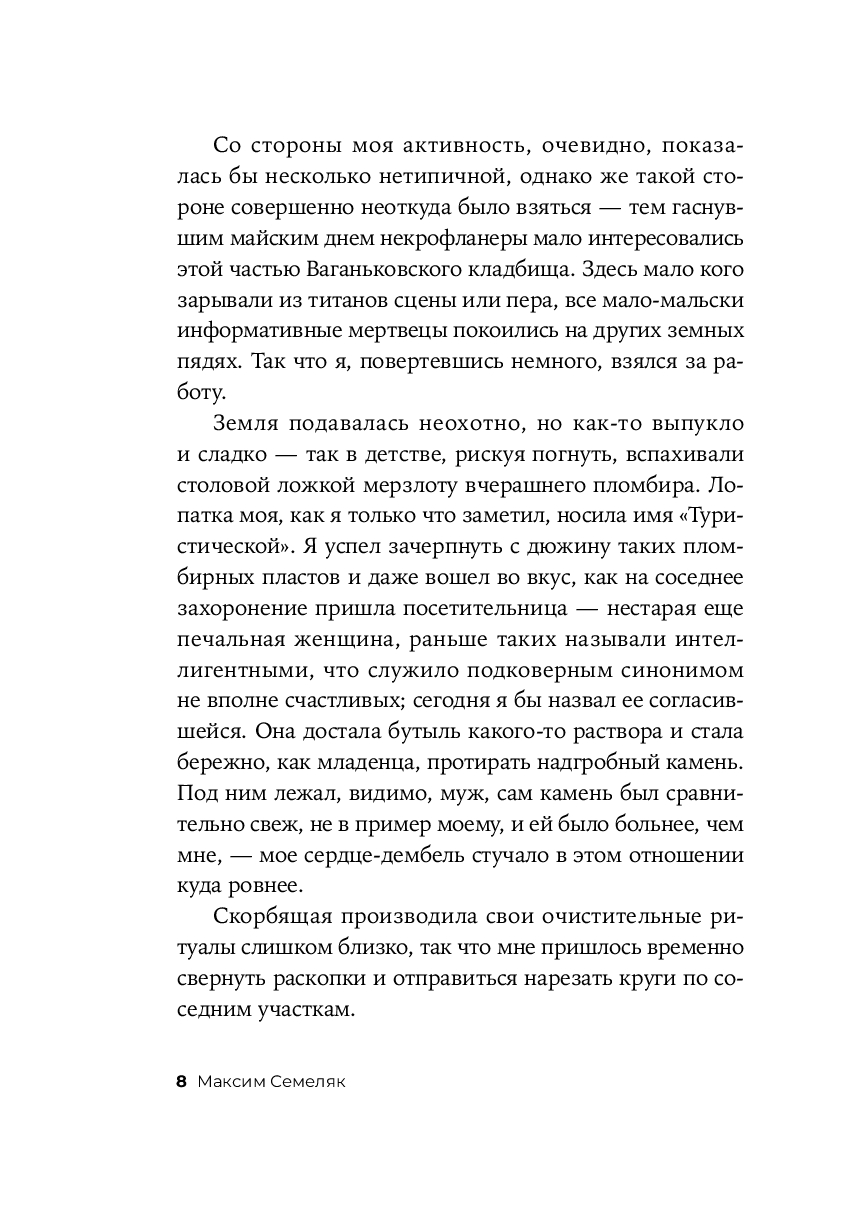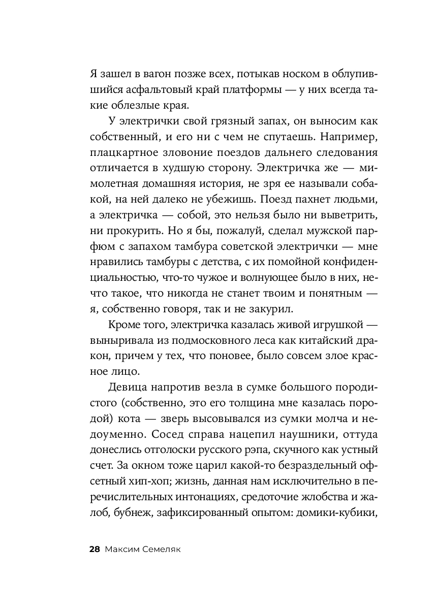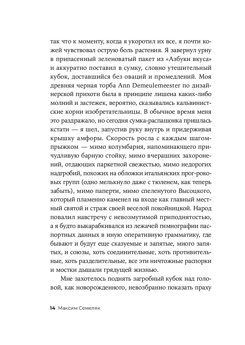 Максим Семеляк казался музыкальным критиком "Афиши", отцом-основателем "Prime Russian Magazine", главным редактором "Men's Health" – и отродясь не был евангелистом "автофикшна". Тем не менее, герой его первого романа – надежный, как весь гражданский флот рассказчик: один в один автор образца 2008 года. Нарцисс-мизантроп, он раскапывает могилу на Ваганьковском и, окружив себя свитой из эксцентричных существ, притворяется внуком Зощенко, изучает боевое искусство, практикует мирное варварство, торгует прошлогодним снегом, погружается в бытовую феноменологию, барахтается между юмореской и элегией и плавает в философии.