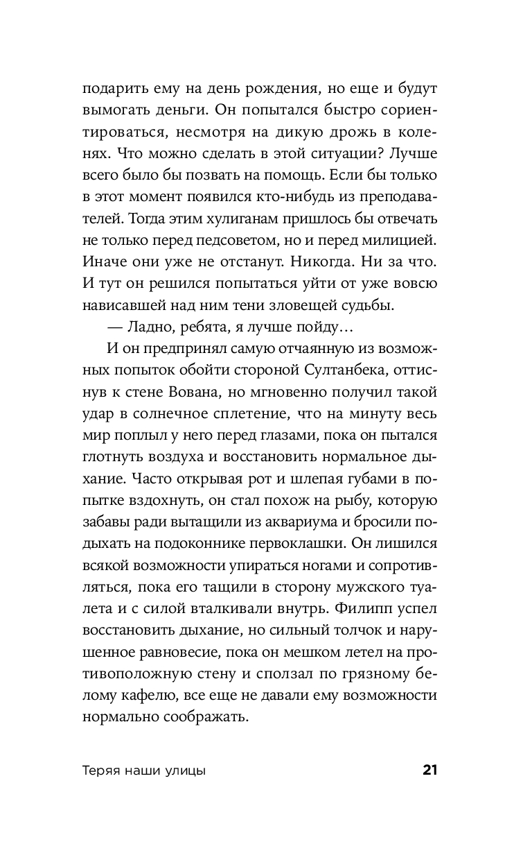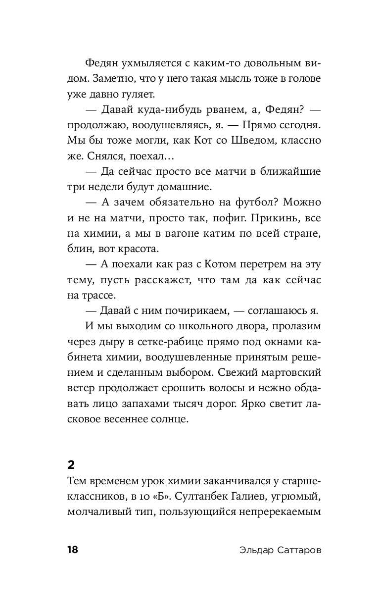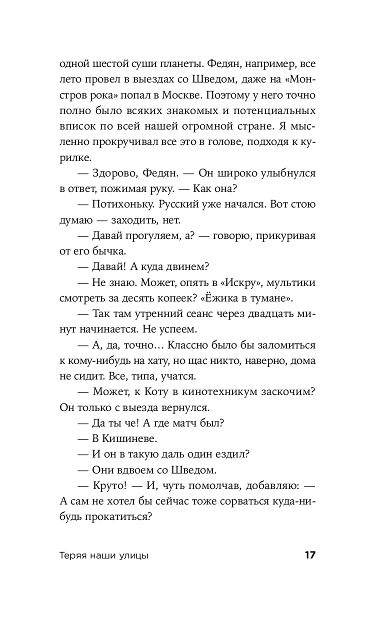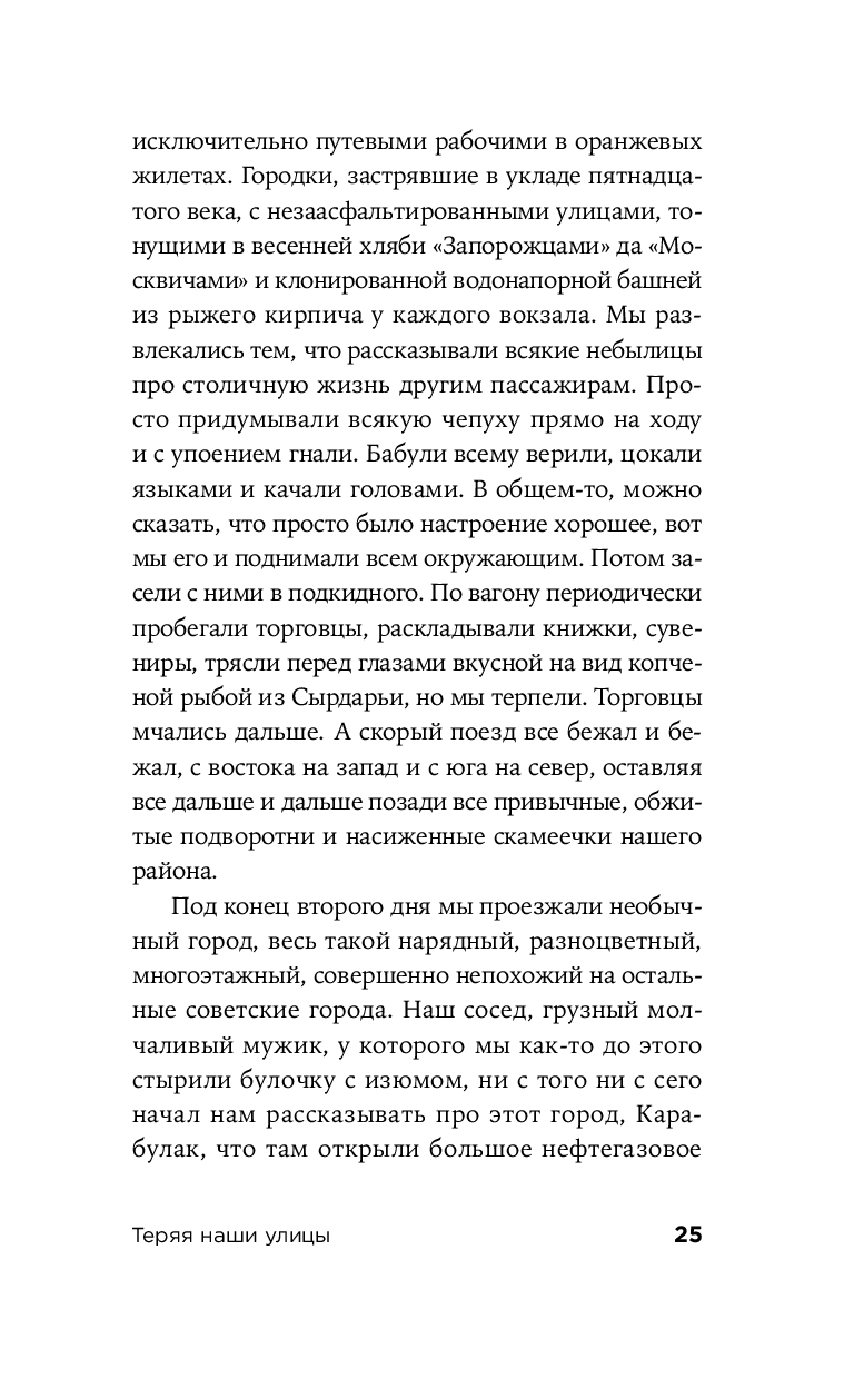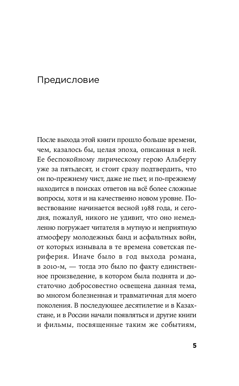 Многослойная, стремительная история, в которой герой проходит небезопасный квест в атмосферных локациях. Ее лирический герой – панк и анархист – взрослеет в лучших традициях своих ультралевых кумиров: пацанские разборки в Алма-Ате 1980-х; рок-н-ролл и тяжелые зависимости в Москве 1990-х, Европе 2000-х и далее везде; метания физические, душевные и географические. Все это для того, чтобы прийти к себе настоящему и увидеть свет в тот момент, когда в ретроспективе твоей жизни вот-вот запустят финальные титры.