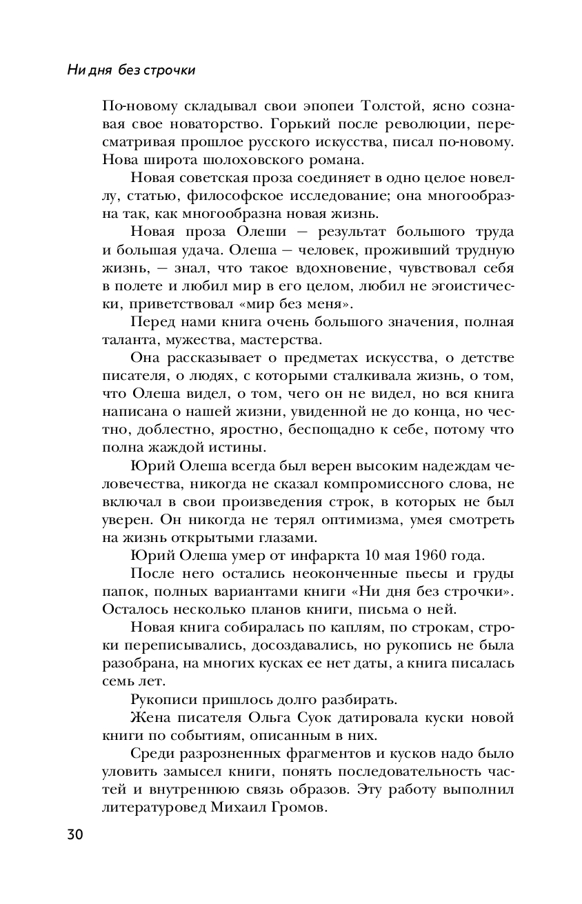 "Слова, слова, слова..." – так хотел назвать Олеша свою "повесть о самом себе", ведь слова... строчки, смыслы – самое дорогое для поэта. Он работал над ней в 1930-1950-е гг., в то время, когда обществу не были близки мысли писателя-интеллигента. Текст, задуманный Олешей как обрывки, "осколки" прожитого, был полностью опубликован под названием "Ни дня без строчки" в 1965 г. – уже после смерти автора. В этих фрагментах Олеша, чувствующий свою принадлежность сразу к двум эпохам, пишет через призму личных воспоминаний образ нового мира – с его революциями, войнами, техникой – и осмысляет свое место в нем.