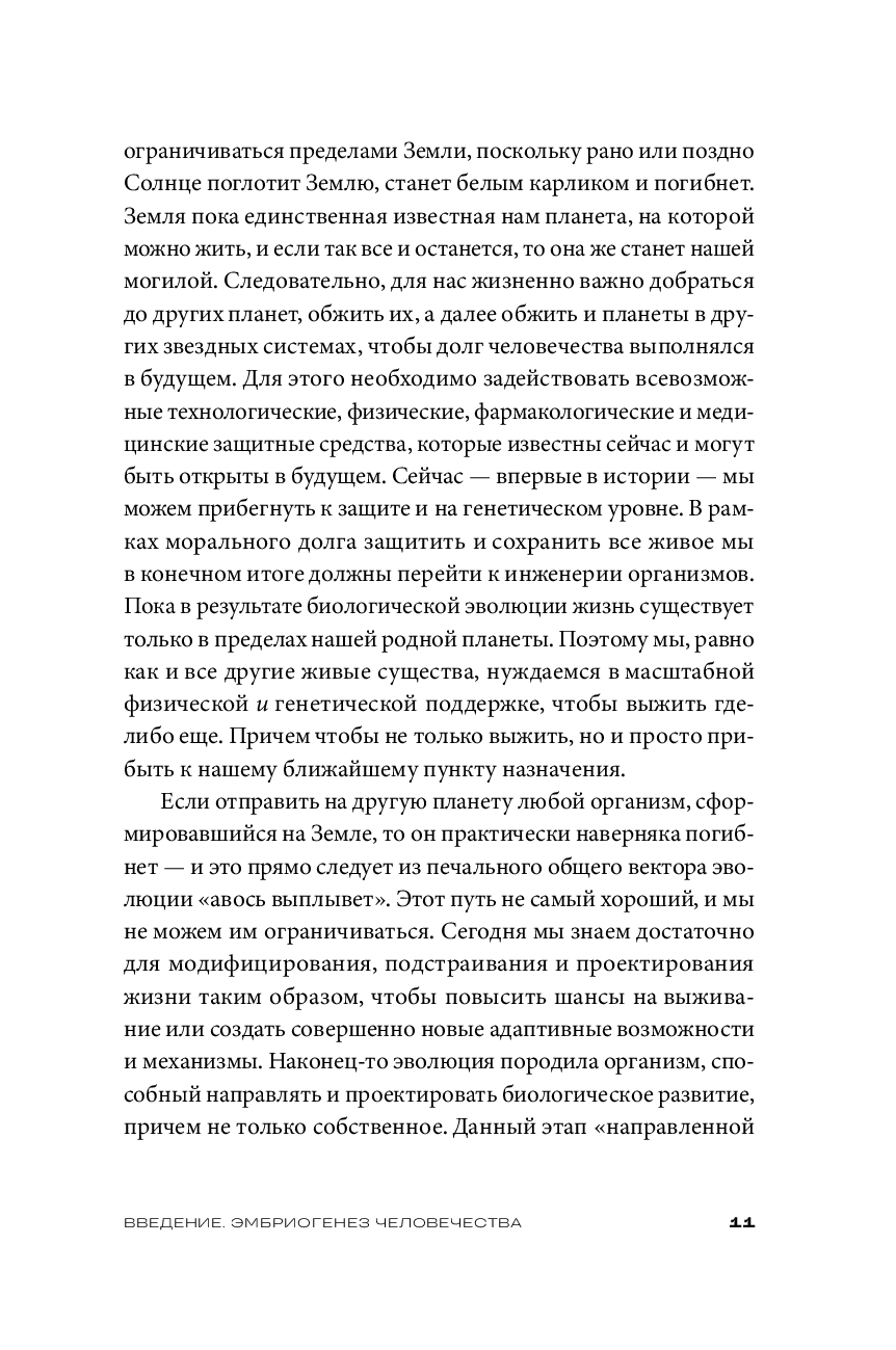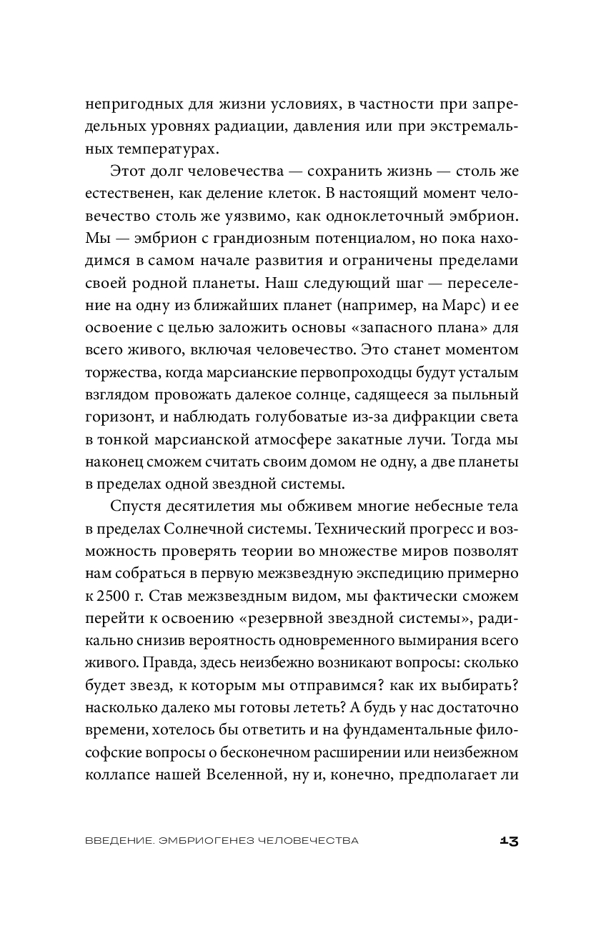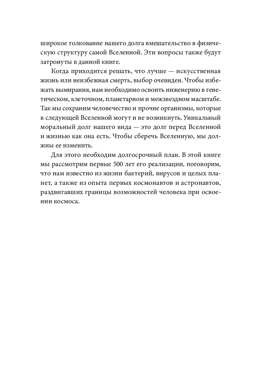 Жизнь на Земле неизбежно придет к концу – в результате климатической катастрофы, войны или гибели Солнца через несколько миллиардов лет. Чтобы избежать вымирания, нам придется найти новую планету, возможно, даже новую солнечную систему. Автор предлагает десятиэтапный план, который рассчитан на 500 лет. В нем он описывает, как длительные космические путешествия влияют на космонавтов и как изменить геном человека, чтобы тот мог переносить экстремальные условия космического пространства – с конечной целью заселения людьми новых солнечных систем. Он предлагает дорожную карту, по которой можно определить, какие солнечные системы следует посетить в первую очередь, и объединяет биотехнологии, философию и генетику, чтобы предложить беспрецедентное видение грядущей Вселенной.