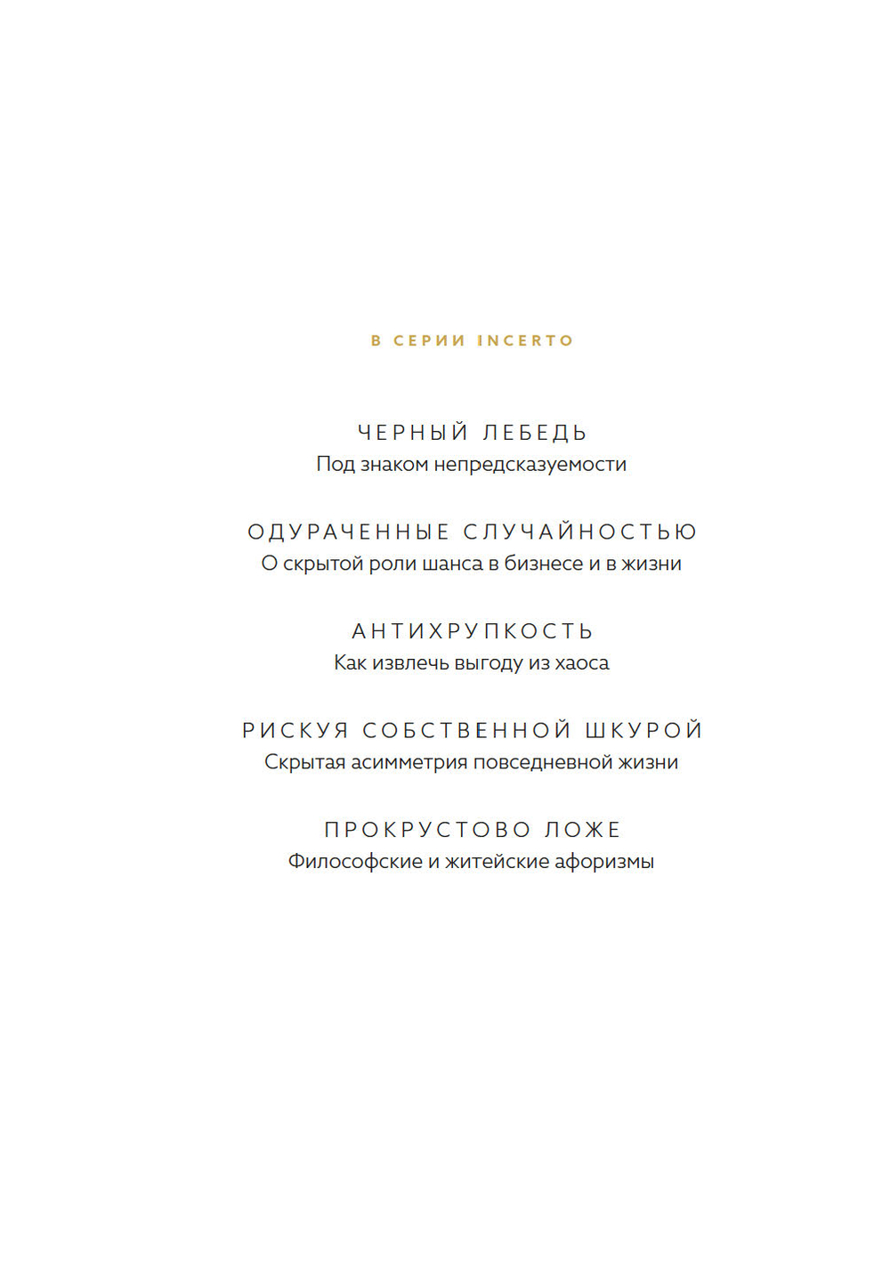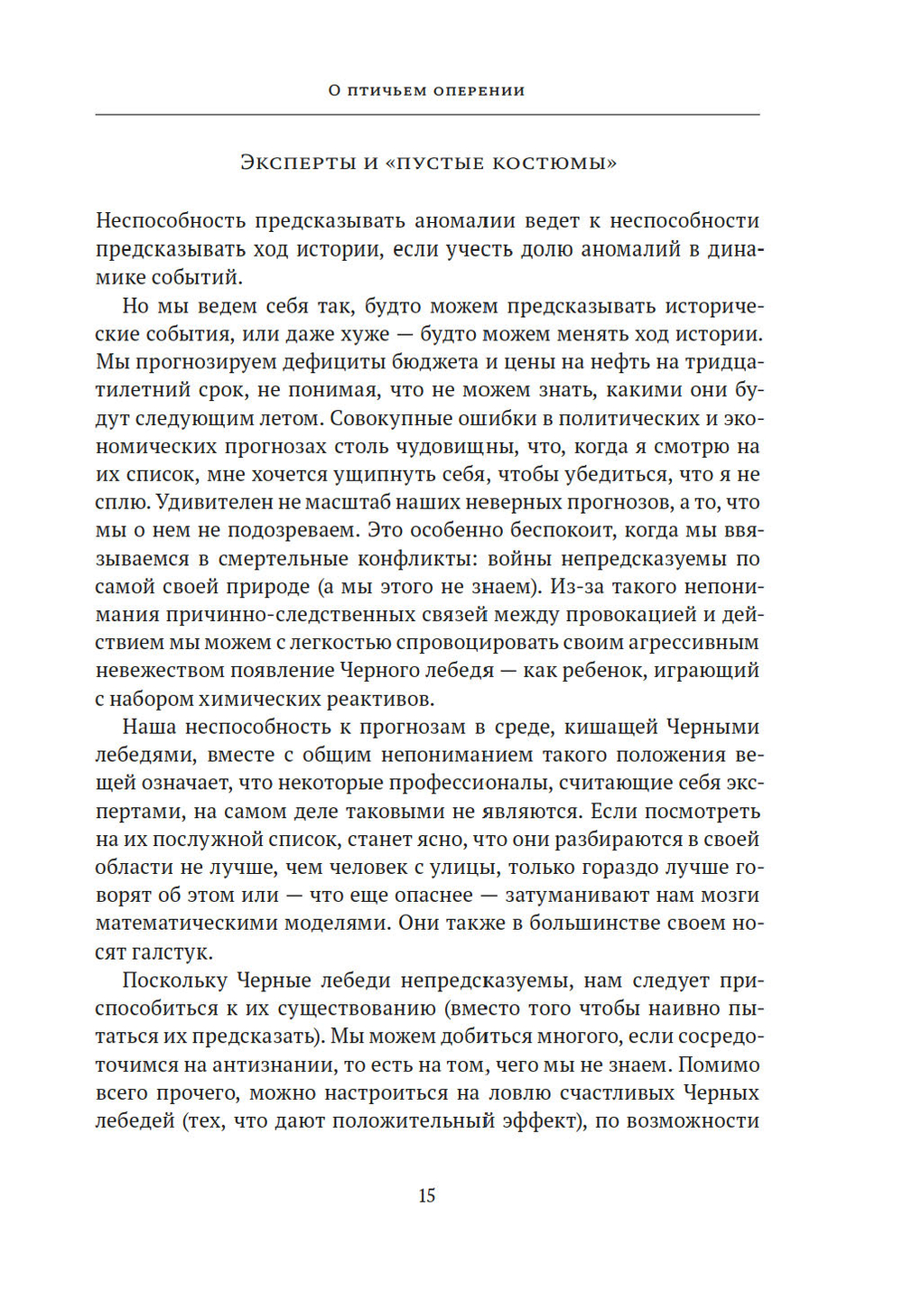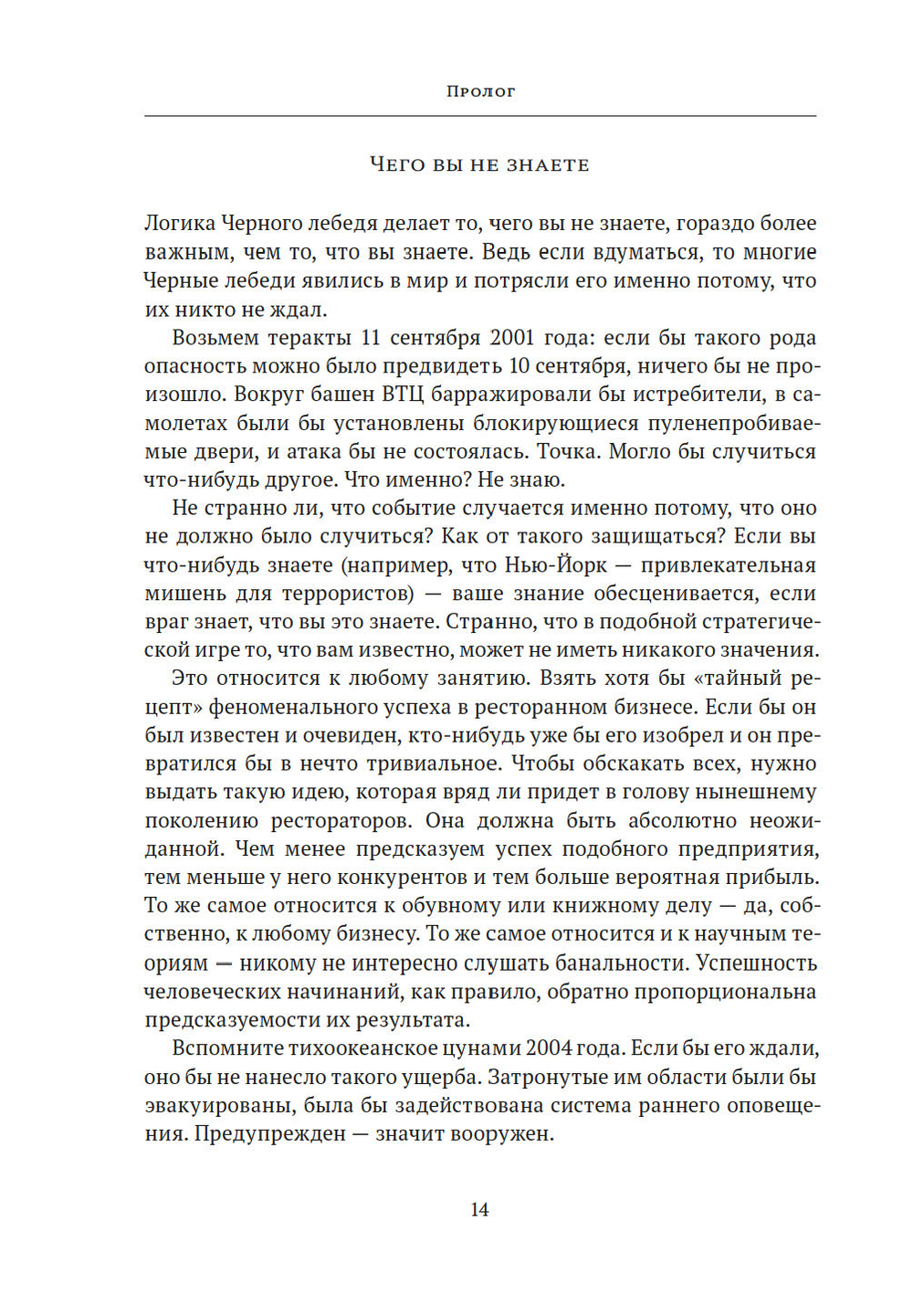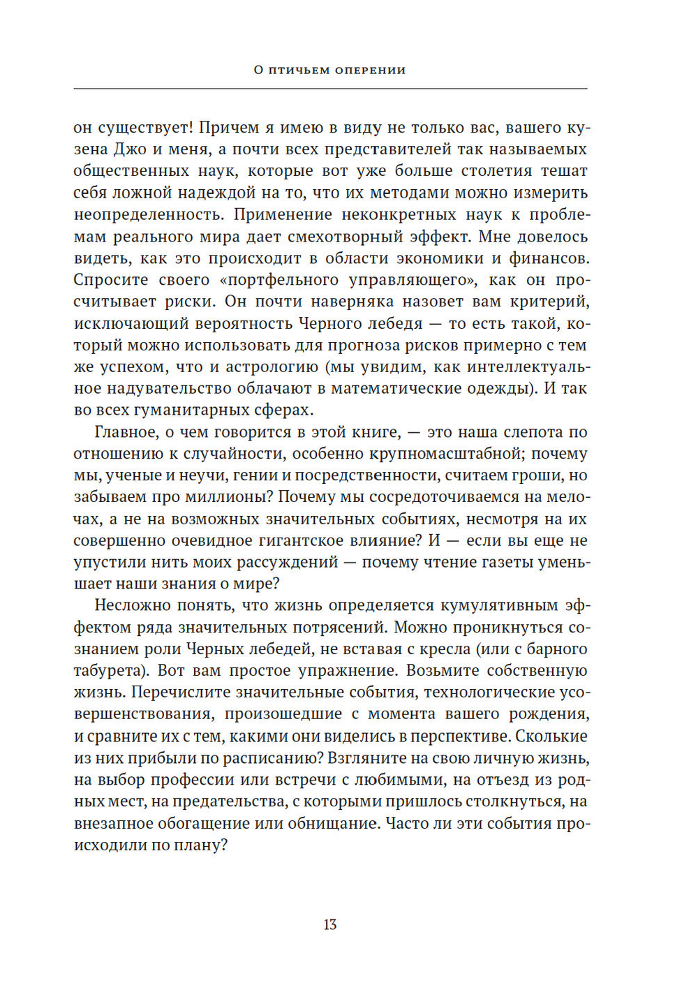 За одно только последнее десятилетие человечество пережило ряд тяжелейших катастроф, потрясений и катаклизмов, не укладывающихся в рамки самых фантастических предсказаний. Выпускник Сорбонны и нью-йоркский финансовый гуру Нассим Талеб называет такие непрогнозируемые события Черными лебедями. Он убежден: именно они дают толчок как истории в целом, так и существованию каждого отдельного человека. И чтобы преуспеть, надо быть к ним готовыми. Сразу после выхода "Черного лебедя" автор блестяще продемонстрировал свою "не-теорию" на практике: на фоне финансового кризиса компания Талеба заработала (а не потеряла!) для инвесторов полмиллиарда долларов. Но его труд – не учебник по экономике. Это размышления незаурядного человека о жизни и о том, как найти в ней свое место.