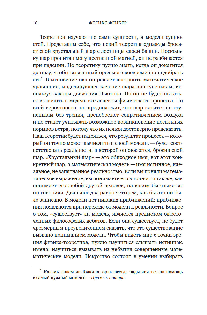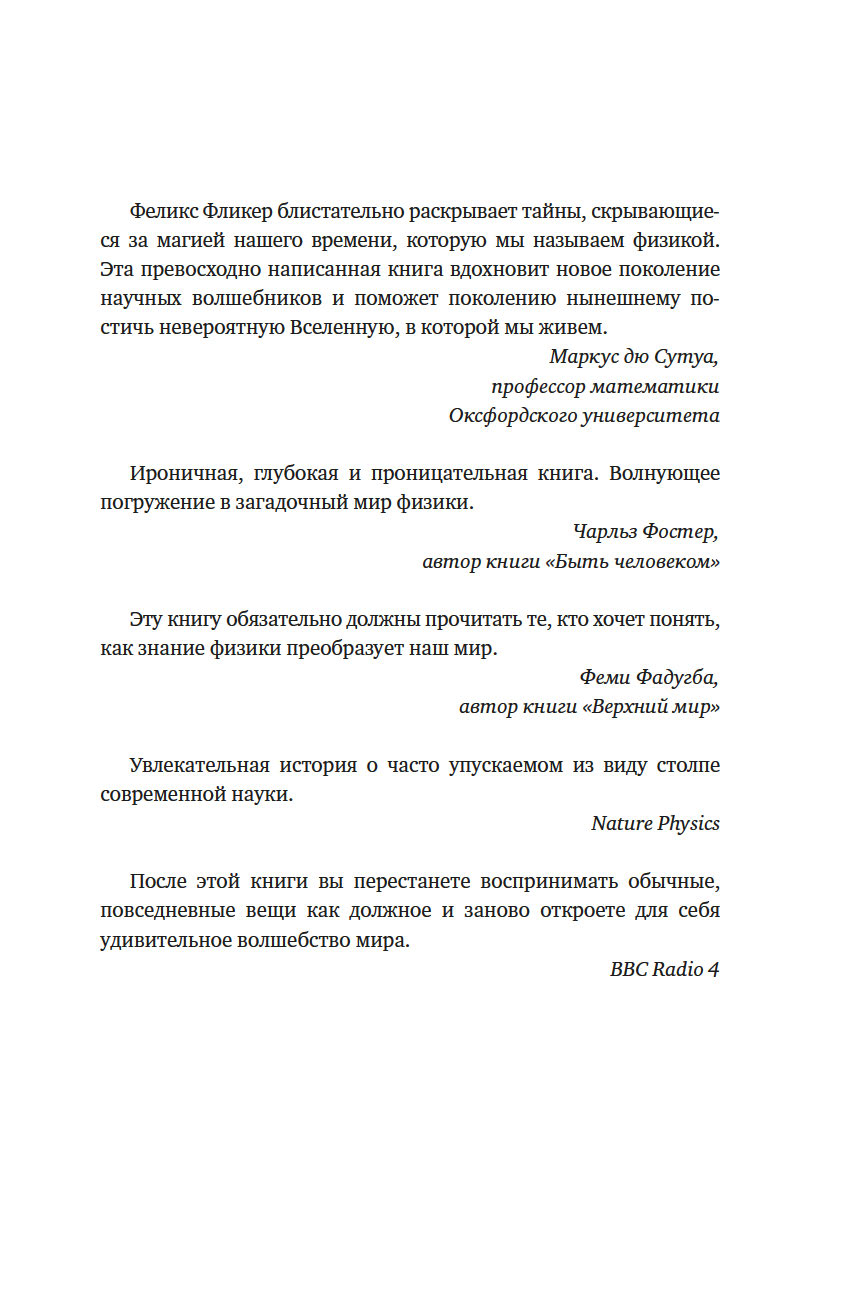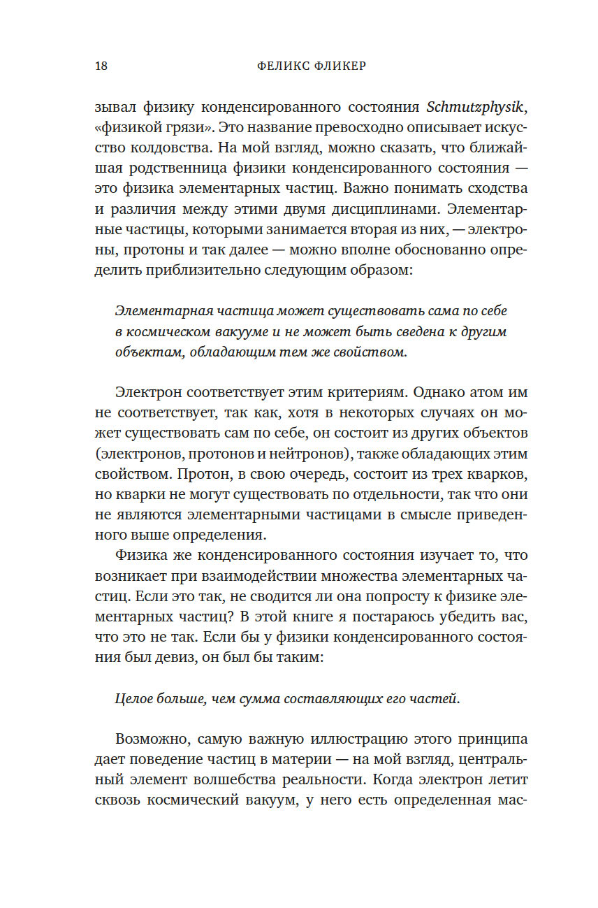 Нас завораживают далекие галактики, черные дыры и элементарные частицы, но давно ли мы задумывались о повседневной магии вокруг нас? Крошечные атомы сталкиваются, образуя снежинки, кристаллы и даже сов, которые для ученых не то, чем кажутся. Профессор Феликс Фликер считает, что нет ничего загадочнее физики, благодаря которой каждый может почувствовать себя волшебником. В этой удивительной книге соседствуют Шерлок Холмс, Терри Пратчетт и скандинавский бог грома Тор, увлекая читателя в магический мир физики. Что черные и белые овцы способны рассказать нам о магнитах? Почему нам сложно установить яйцо в равновесии? Как связаны Альберт Эйнштейн, Мэрилин Монро и кристаллическая решетка? И как не замерзнуть в космосе на ковре-самолете? Прочитав эту книгу, вы больше не сможете смотреть на мир как прежде.