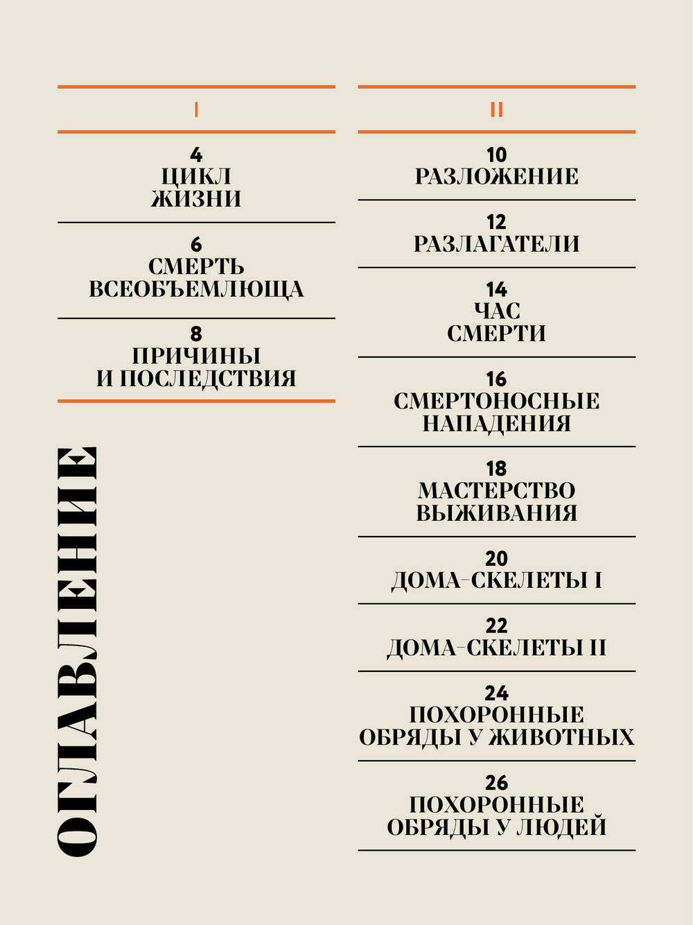 Почему мы умираем? Что происходит с нами после смерти и почему мы почти не говорим о ней? Какое животное самое опасное для человека? Какое чувство перед смертью мы теряем последним? Знаете ли вы, что некоторые медузы способны возвращаться в детство и тем самым обновлять цикл жизни? И что есть собаки, которые чуют запах смерти? Или что есть виды, которые размножаются лишь раз в жизни, а затем умирают?