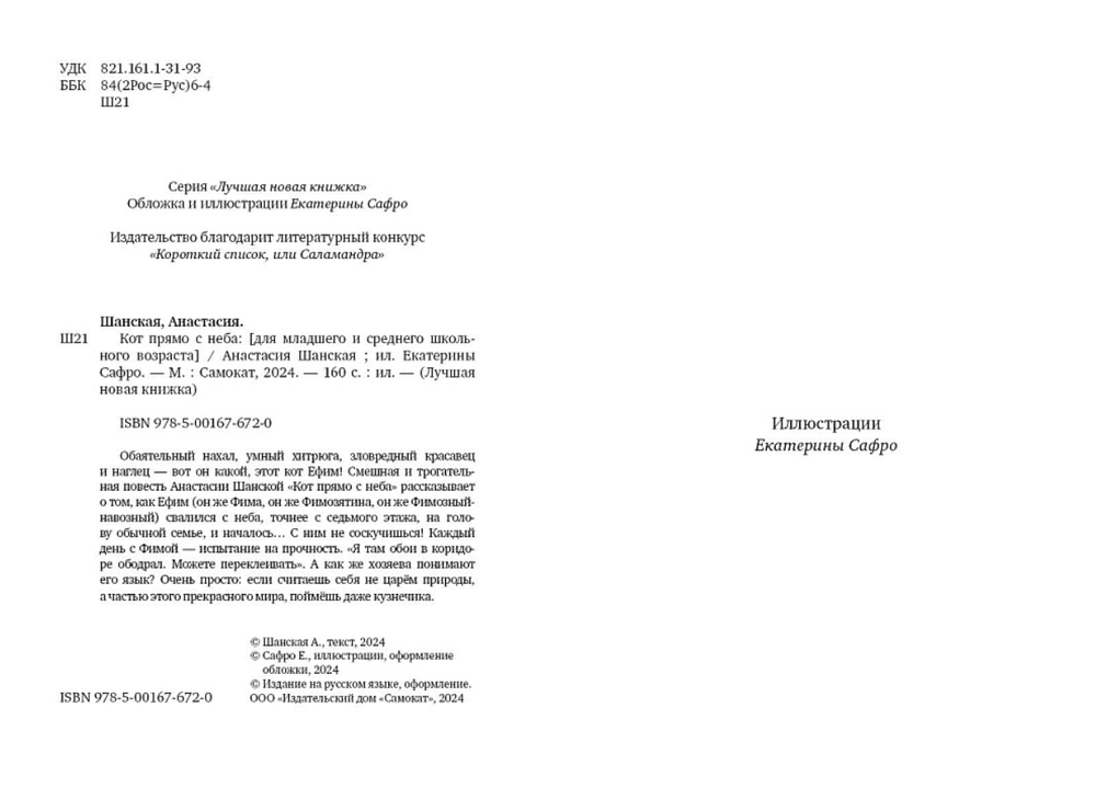 Обаятельный нахал, умный хитрюга, зловредный красавец и наглец – вот он какой, этот кот Ефим! Смешная и трогательная повесть Анастасии Шанской "Кот прямо с неба" рассказывает о том, как Ефим (он же Фима, он же Фимозятина, он Фимозный-навозный) свалился с неба, точнее с седьмого этажа, на голову обычной семье, и началось... С ним не соскучишься! Каждый день с Фимой – испытание на прочность. "Я там обои в коридоре ободрал. Можете переклеивать". А как же хозяева понимают его язык? Очень просто: если считаешь себя не царём природы, а частью этого прекрасного мира, поймёшь даже кузнечика.