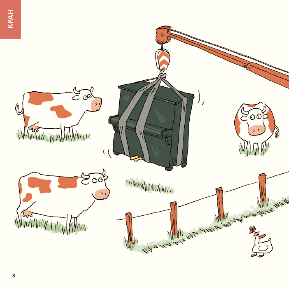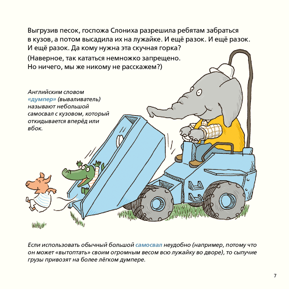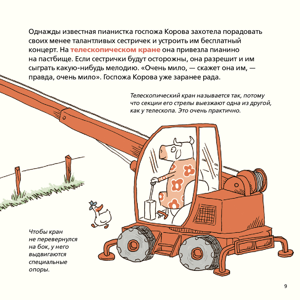 Познакомьтесь с госпожой Овечкой, которая отправляется за покупками на вилочном погрузчике, и с госпожой Коровой, привёзшей пианино на телескопическом кране, чтобы устроить концерт прямо на поле. А как насчёт носорогов, которые замешивают тесто для оладьев исключительно в бетономешалке? Каждая история не только заставит улыбнуться, но и познакомит вашего ребёнка с миром строительных машин!