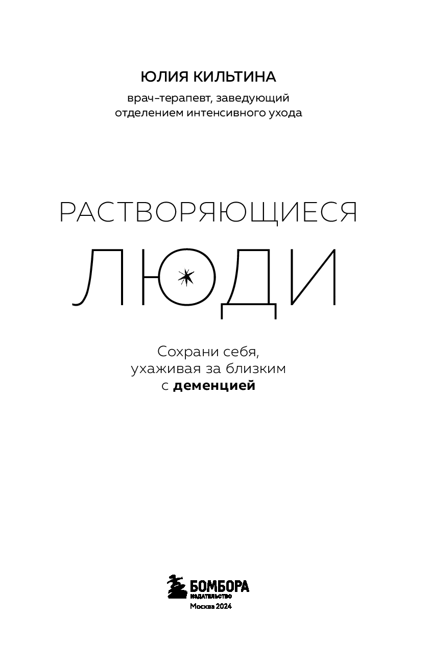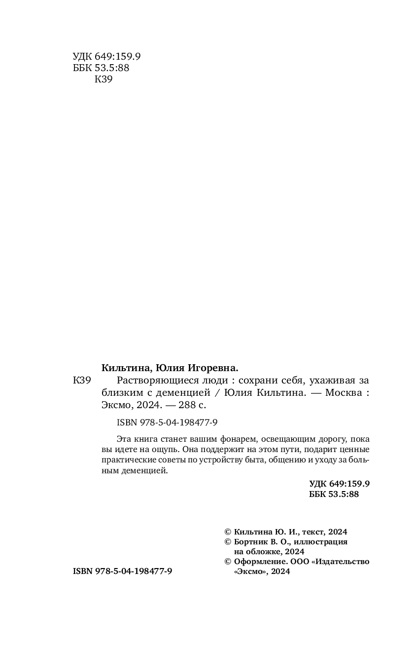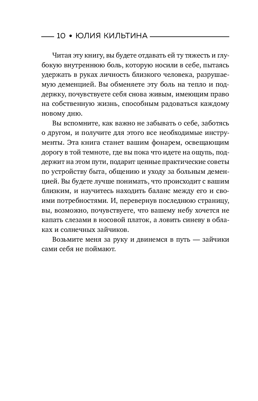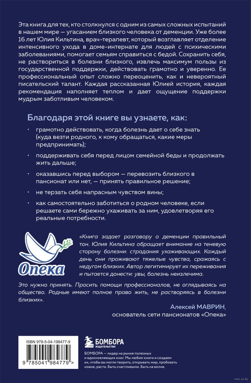 Эта книга для тех, кто столкнулся с одним из самых сложных испытаний в нашем мире – угасанием близкого человека от деменции. Уже более 16 лет Юлия Кильтина, врач-терапевт, который возглавляет отделение интенсивного ухода в доме-интернате для людей с психическими заболеваниями, помогает семьям справиться с бедой. Сохранить себя, не раствориться в болезни близкого, извлечь максимум пользы из государственной поддержки, действовать грамотно и уверенно. Ее профессиональный опыт сложно переоценить, как и невероятный писательский талант. Каждая рассказанная Юлией история, каждая рекомендация наполняет теплом и дает ощущение поддержки мудрым заботливым человеком.