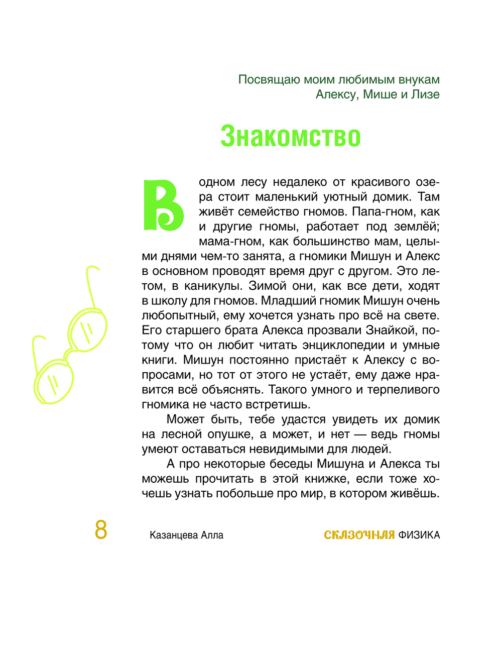 Познакомьтесь с гномиками Алексом и Мишуном! Любознательные братья вместе с юными читателями отправятся в увлекательное путешествие и изучат, что такое фундаментальные силы Вселенной, космос, звук, свет, энергия и теплота. С помощью красочных иллюстраций и интересных историй вы узнаете многое и об окружающем мире: как видят и слышат разные животные, как водомерке удаётся бегать по воде, как рождаются и умирают звёзды и как развивалась жизнь на Земле. Полюбите физику и совершайте новые открытия одно за другим!