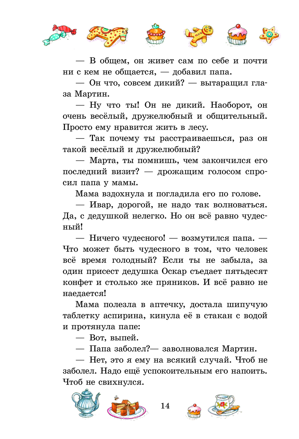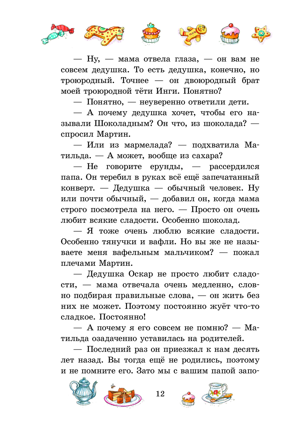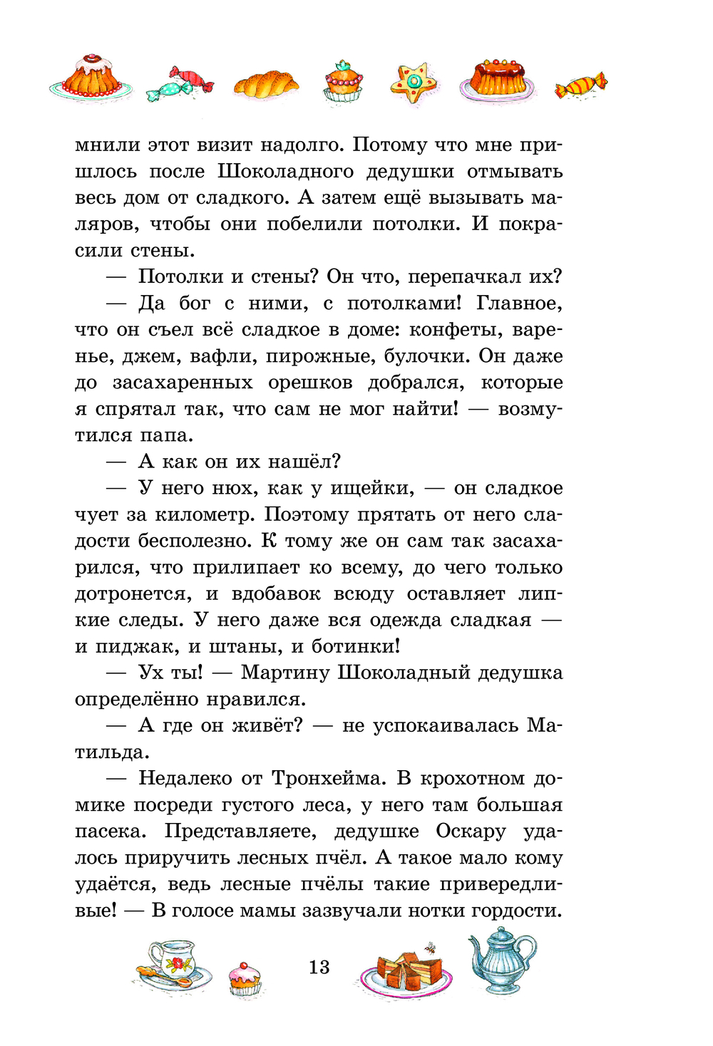 Оскара недаром прозвали Шоколадным дедушкой, ведь он страшный сластёна и жить не может без конфет и шоколада. А ещё он – хотите верьте, а хотите нет – умеет ходить по потолку, вот такой необычный дедушка! Одновременно с Оскаром в Берген прибывают и сёстры Паульсен, три довольно вредных дамочки, которые, наоборот, терпеть не могут сладкого и мечтают, чтобы все торты и пирожные в городе стали горькими или солёными. Зачем им это нужно и удастся ли им сорвать ежегодную городскую ярмарку сладостей, или кто-то помешает их коварным планам? Чем закончилась эта захватывающая детективная история? Читай книгу – и узнаешь.