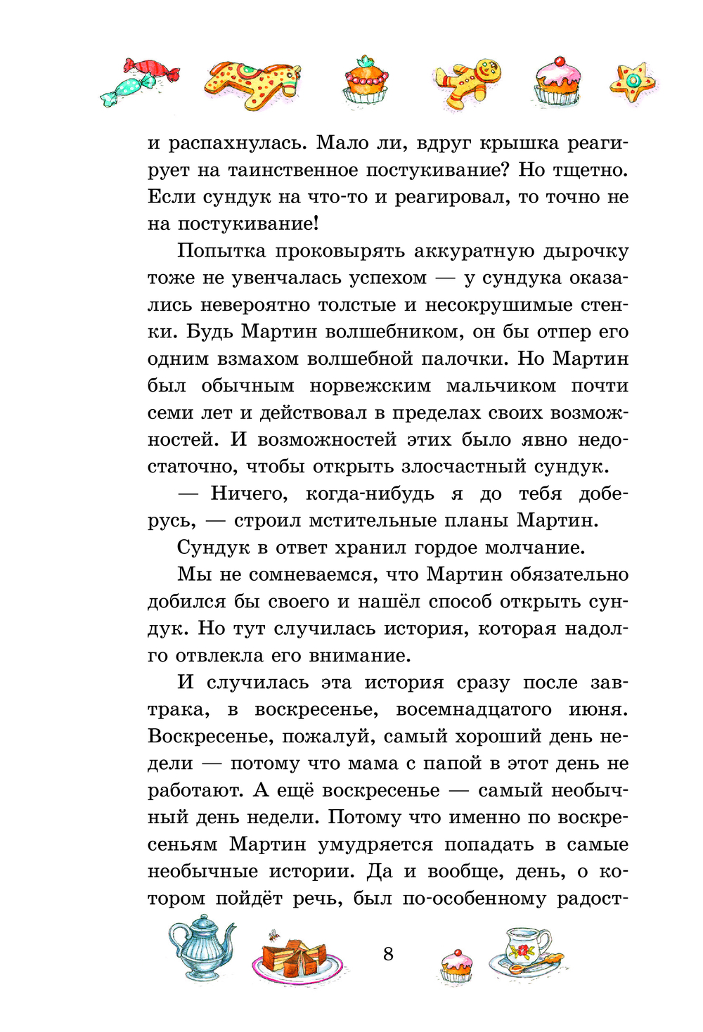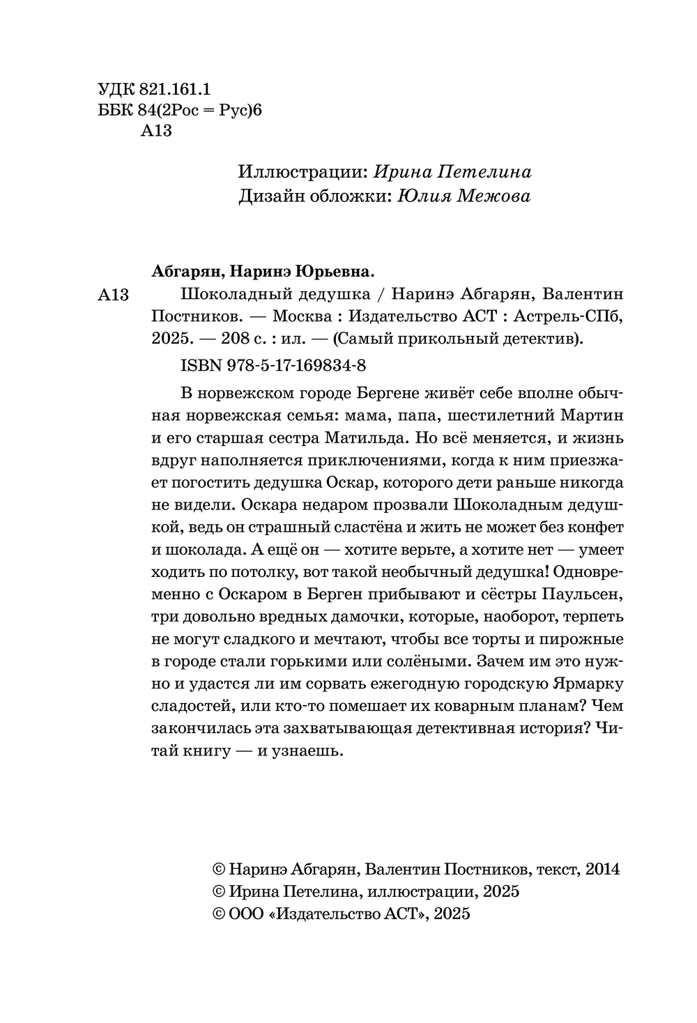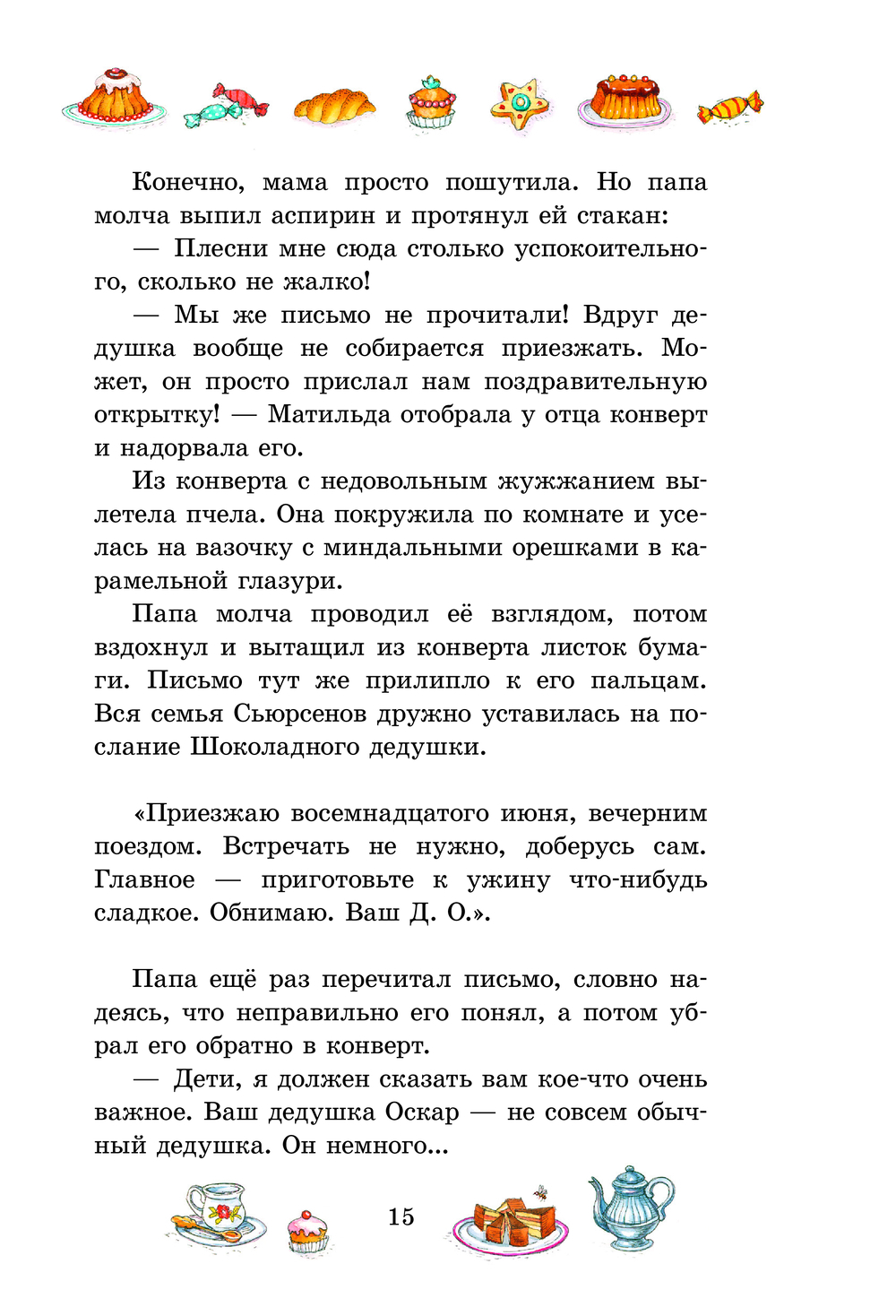 Оскара недаром прозвали Шоколадным дедушкой, ведь он страшный сластёна и жить не может без конфет и шоколада. А ещё он – хотите верьте, а хотите нет – умеет ходить по потолку, вот такой необычный дедушка! Одновременно с Оскаром в Берген прибывают и сёстры Паульсен, три довольно вредных дамочки, которые, наоборот, терпеть не могут сладкого и мечтают, чтобы все торты и пирожные в городе стали горькими или солёными. Зачем им это нужно и удастся ли им сорвать ежегодную городскую ярмарку сладостей, или кто-то помешает их коварным планам? Чем закончилась эта захватывающая детективная история? Читай книгу – и узнаешь.