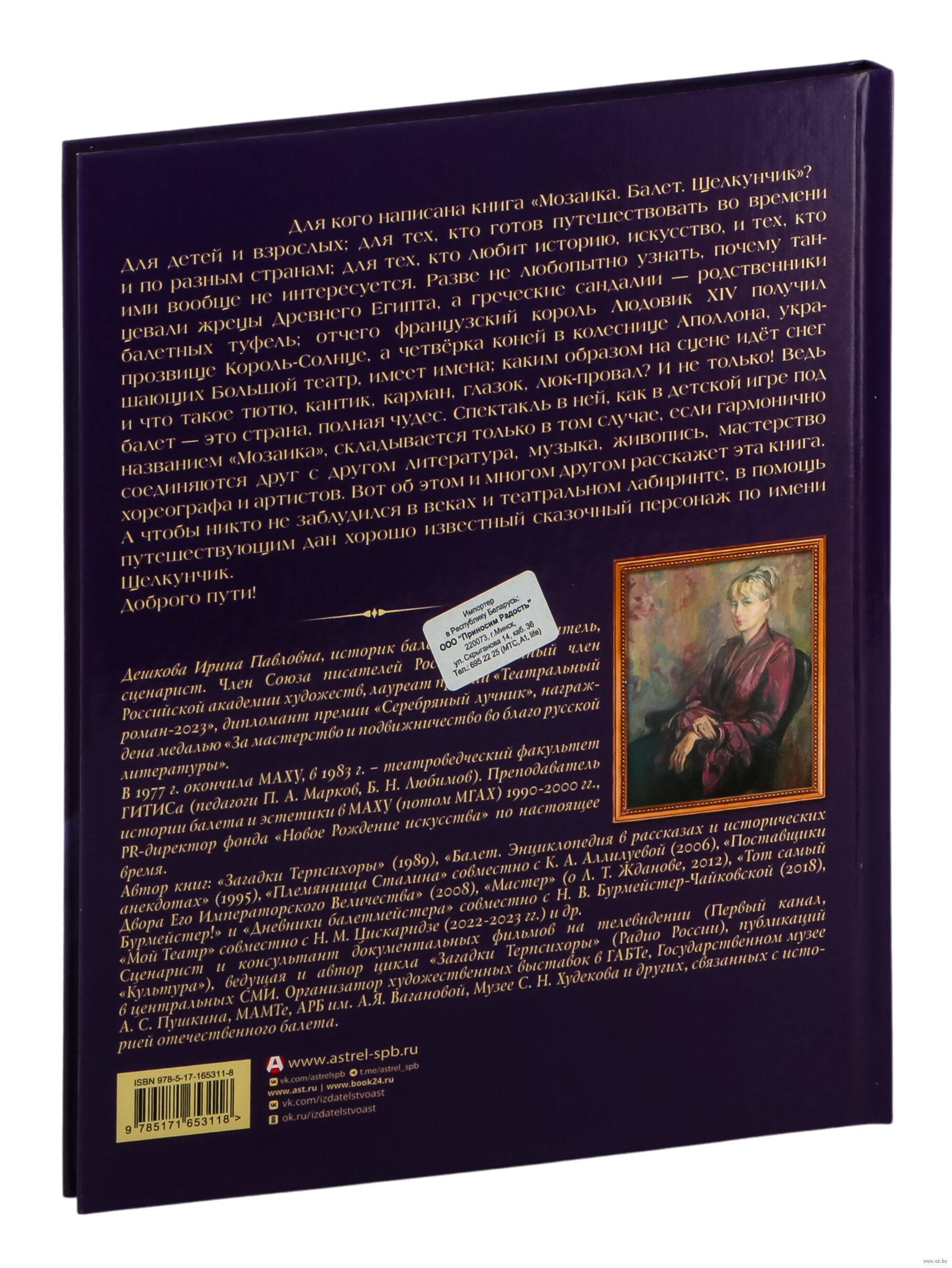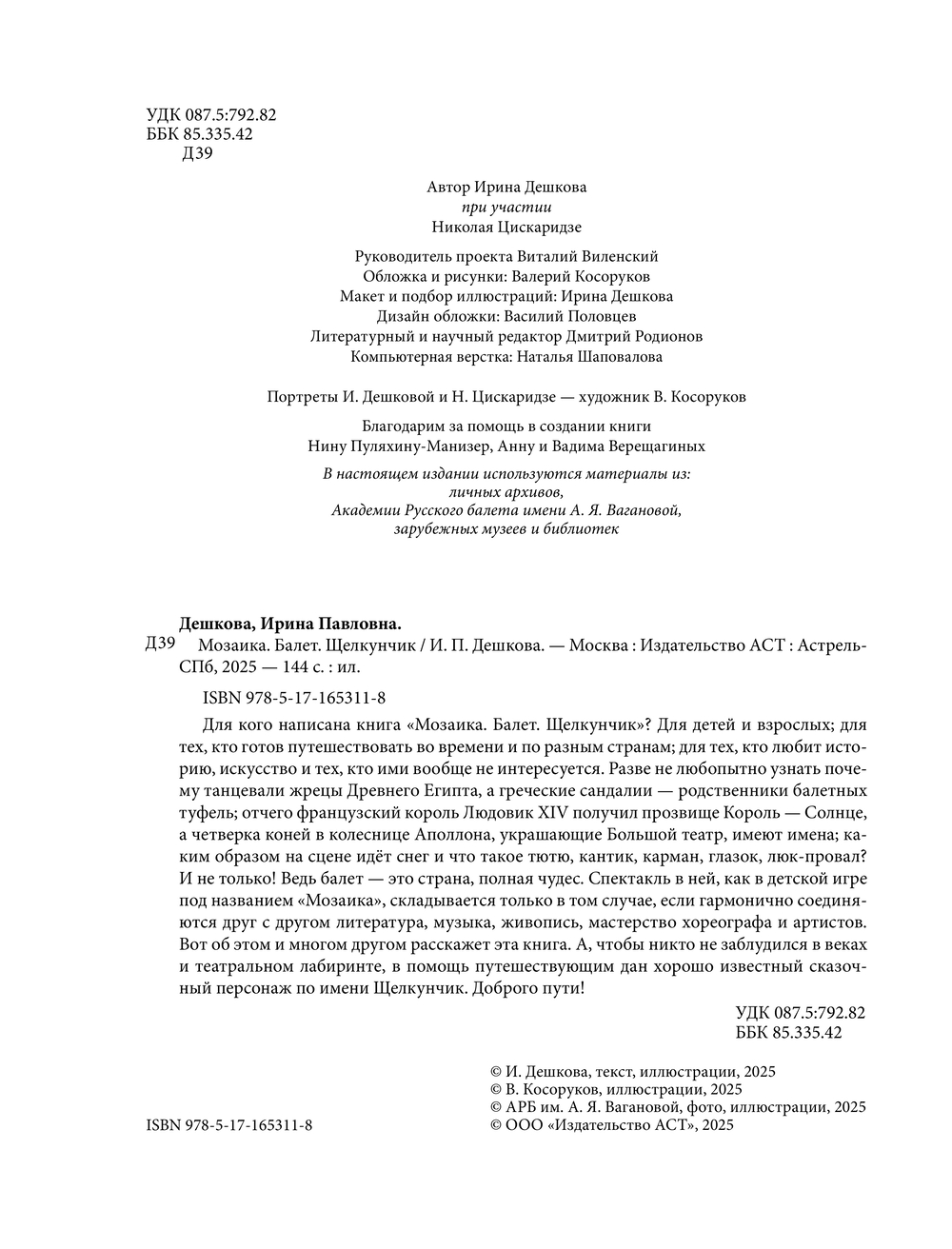 Для кого написана книга "Мозаика. Балет. Щелкунчик"? Для детей и взрослых; для тех, кто готов путешествовать во времени и по разным странам; для тех, кто любит историю, искусство и тех, кто ими вообще не интересуется. Разве не любопытно узнать, почему танцевали жрецы Древнего Египта, а греческие сандалии – родственники балетных туфель; отчего французский король Людовик XIV получил прозвище Король-Солнце, а четверка коней в колеснице Аполлона, украшающие Большой театр, имеют имена; каким образом на сцене идёт снег и что такое тютю, кантик, карман, глазок, люк-провал? И не только! Ведь балет – это страна, полная чудес.
