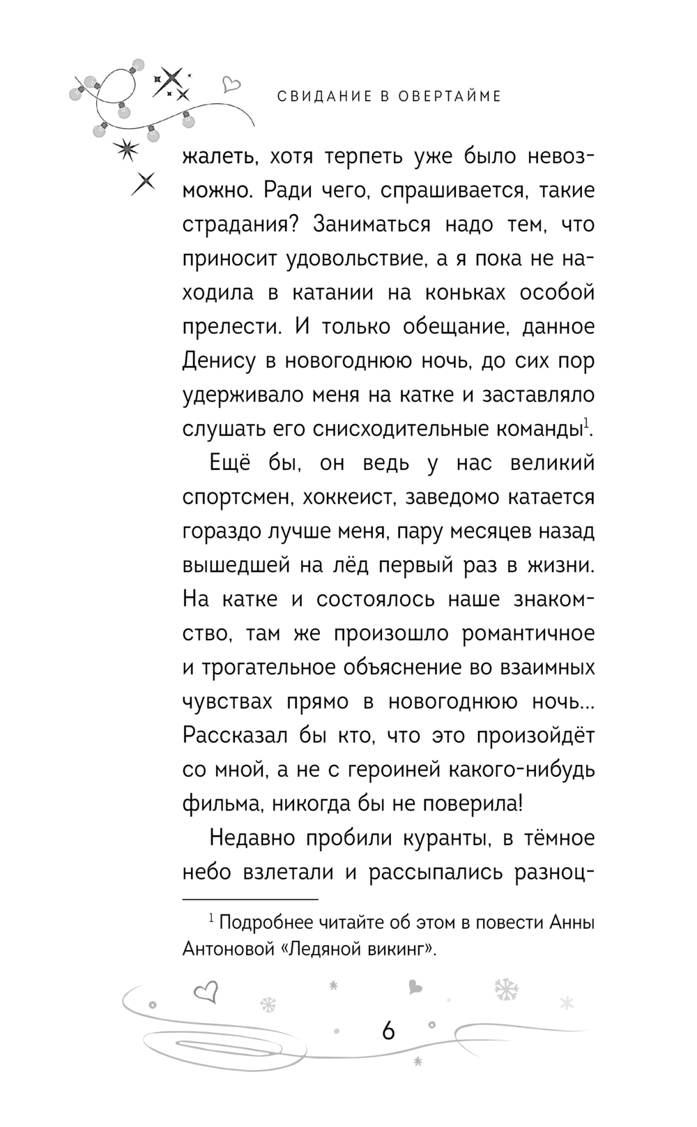 Ира жалела, что бросила народные танцы. Как у нее здорово получалось с партнером Федей! Но ушла она из-за совсем другого парня – Дениса, с которым познакомилась на катке... Это он посеял в её душе сомнения, предложив заниматься фигурным катанием. И тренироваться в паре с ним, разумеется! Девушка ничего не имела против, наоборот, с радостью окунулась в новое увлечение. Но она даже не представляла, как тяжело ей придется! А Денис – тот, ради кого она сменила танцевальные туфли на остро заточенные коньки, – сам, оказывается, по-прежнему занимается хоккеем! Разве об этом они договаривались?! Ира всерьёз обиделась на парня. Сумеют ли молодые люди разобраться в своих чувствах, используя овертайм?