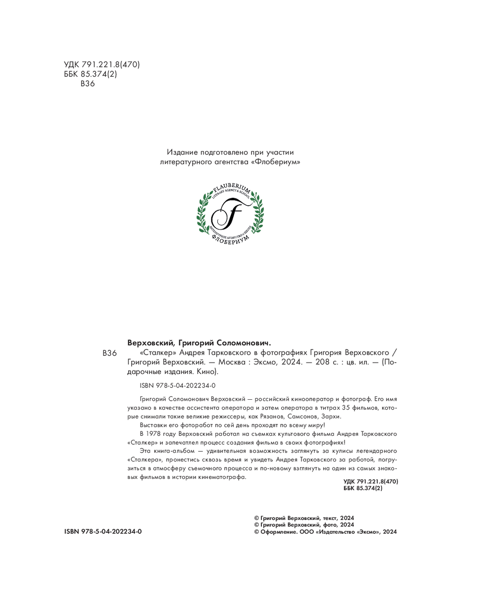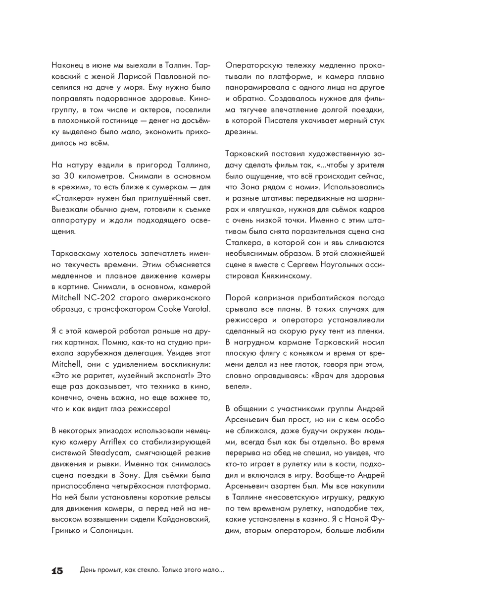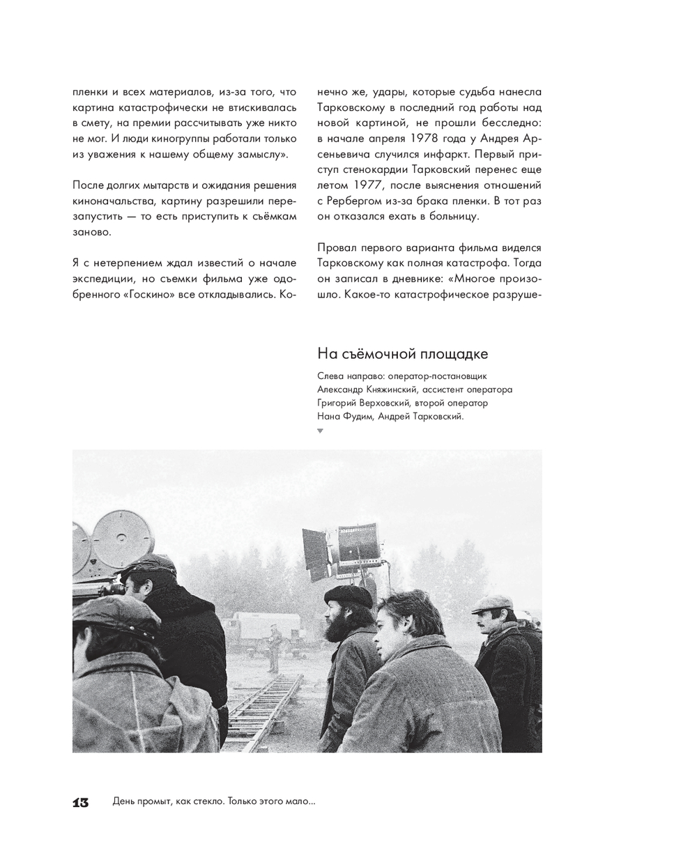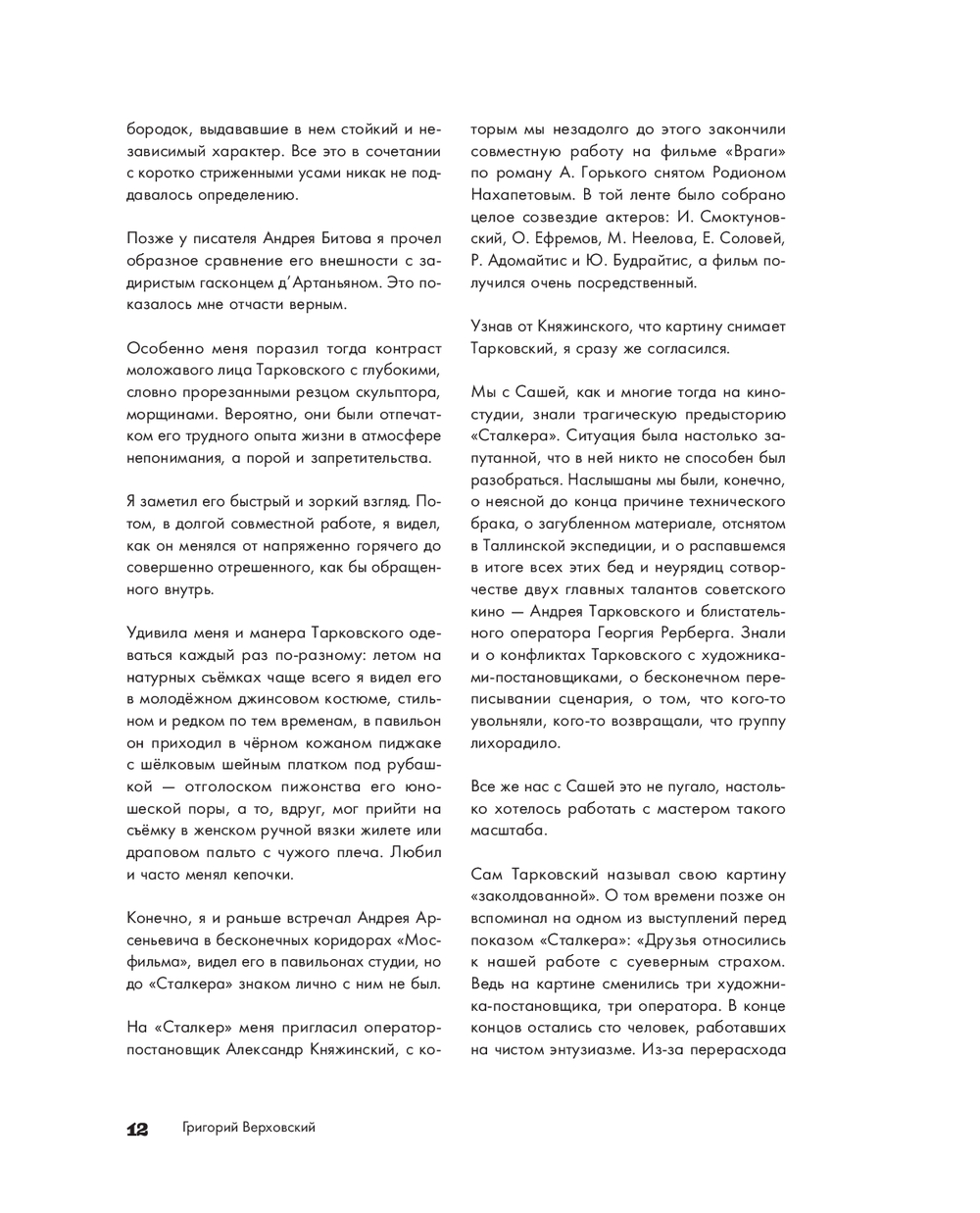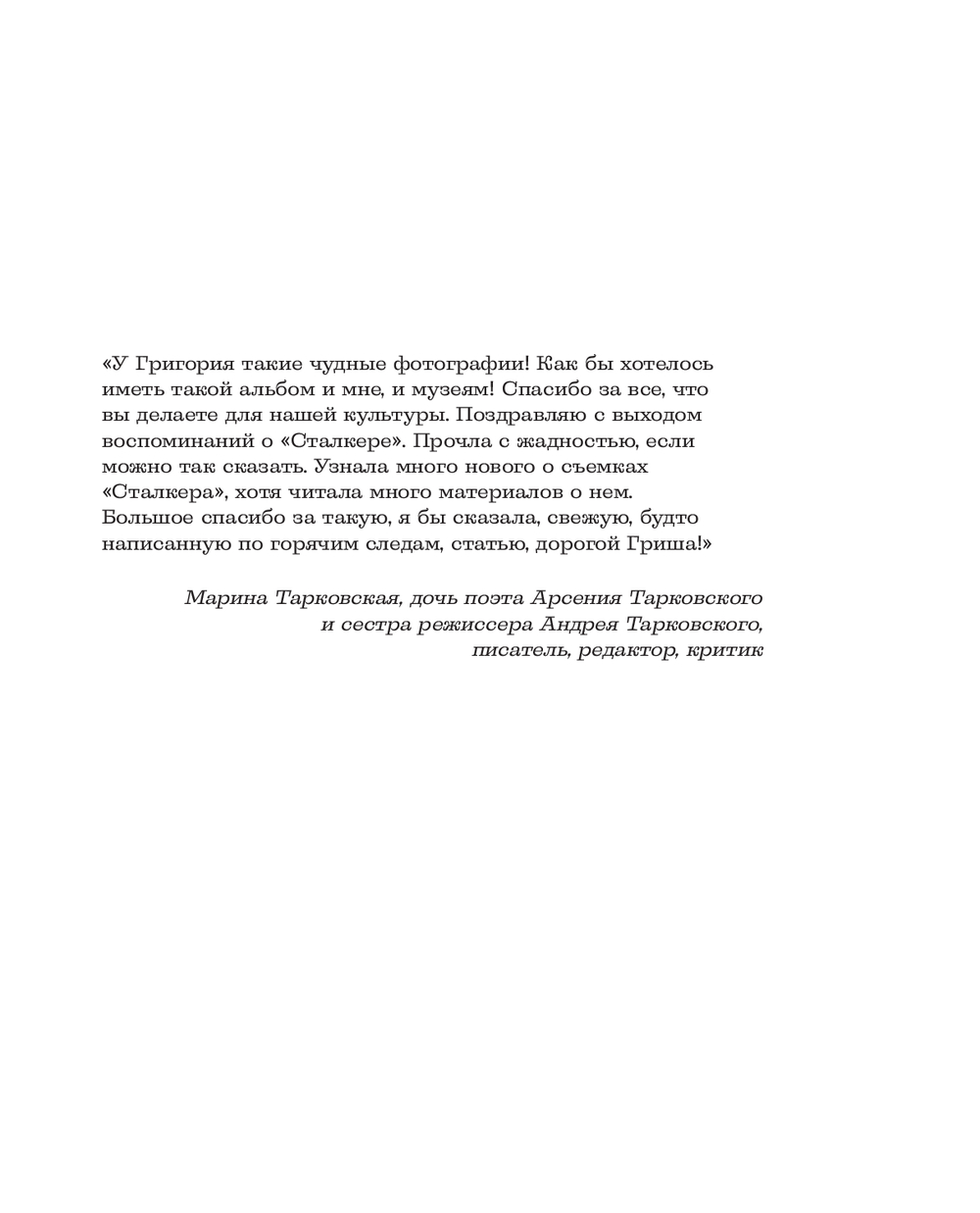 Фильм переснимали трижды (!!!). Каждый раз "Сталкера" поджидала очередная роковая случайность: то производственный брак, то испорченная пленка, то конфликт между режиссером и оператором. В 1978 году Андрей Тарковский перенес инфаркт, но это не помешало ему начать все заново с новой командой. И лишь с третьего раза Тарковскому удалось закончить свой шедевр. Эта книга перенесет вас туда, на съемочную площадку фильма "Сталкер", 1978 года, где помощником оператора трудился Григорий Верховский. Ему не просто посчастливилось увидеть своими глазами, как творит великий мастер, но и запечатлеть это на фото. И теперь, спустя почти полвека, он готов поделиться с миром своими воспоминаниями!