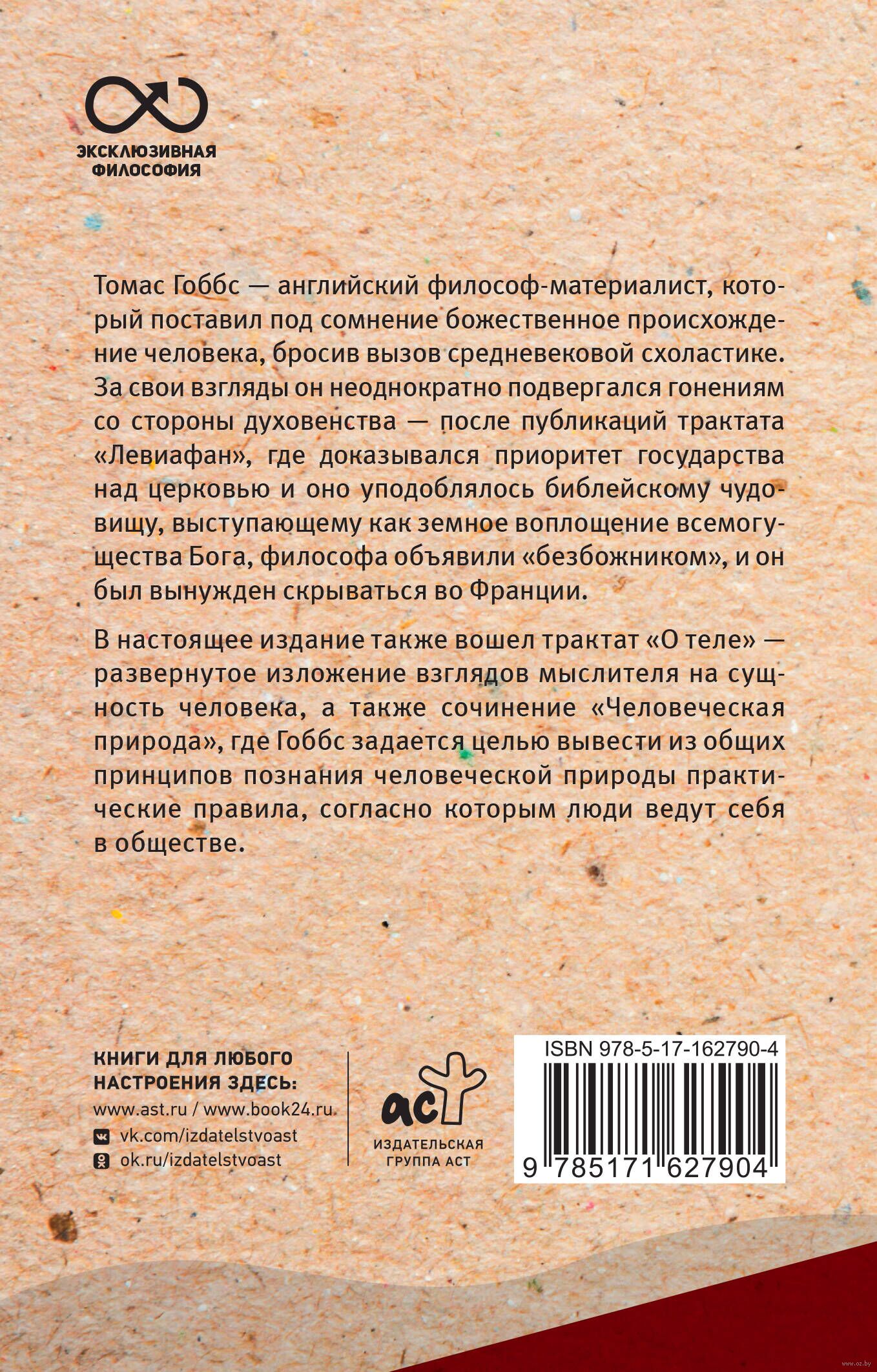 Томас Гоббс – английский философ-материалист, который поставил под сомнение божественное происхождение человека, бросив вызов средневековой схоластике. За свои взгляды он неоднократно подвергался гонениям со стороны духовенства – после публикации трактата "Левиафан", где доказывался приоритет государства над церковью, и оно уподоблялось библейскому чудовищу, выступающему как земное воплощение всемогущества Бога, философа объявили "безбожником", и он был вынужден скрываться во Франции.В настоящее издание также вошел трактат "О теле" – развернутое изложение взглядов мыслителя насущность человека, а также сочинение "Человеческая природа", где Гоббс задается целью вывести из общих принципов познания человеческой природы практические правила, согласно которым люди ведут себя в обществе.