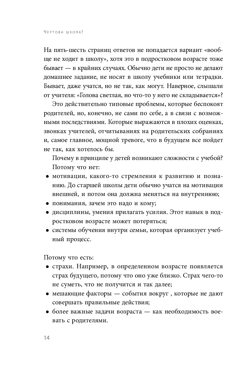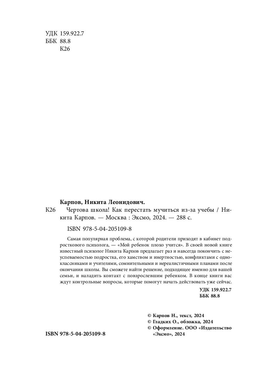 Самая популярная проблема, с которой родители приходят в кабинет подросткового психолога, – "Мой ребенок плохо учится". В своей новой книге известный психолог Никита Карпов предлагает раз и навсегда покончить с неуспеваемостью подростка, его хамством и инертностью, конфликтами с одноклассниками и учителями, сомнительными и нереалистичными планами после окончания школы. Вы сможете найти решение, подходящее именно для вашей семьи, и наладить контакт с повзрослевшим ребенком. В конце книги вас ждут контрольные вопросы, которые помогут начать действовать уже сейчас.