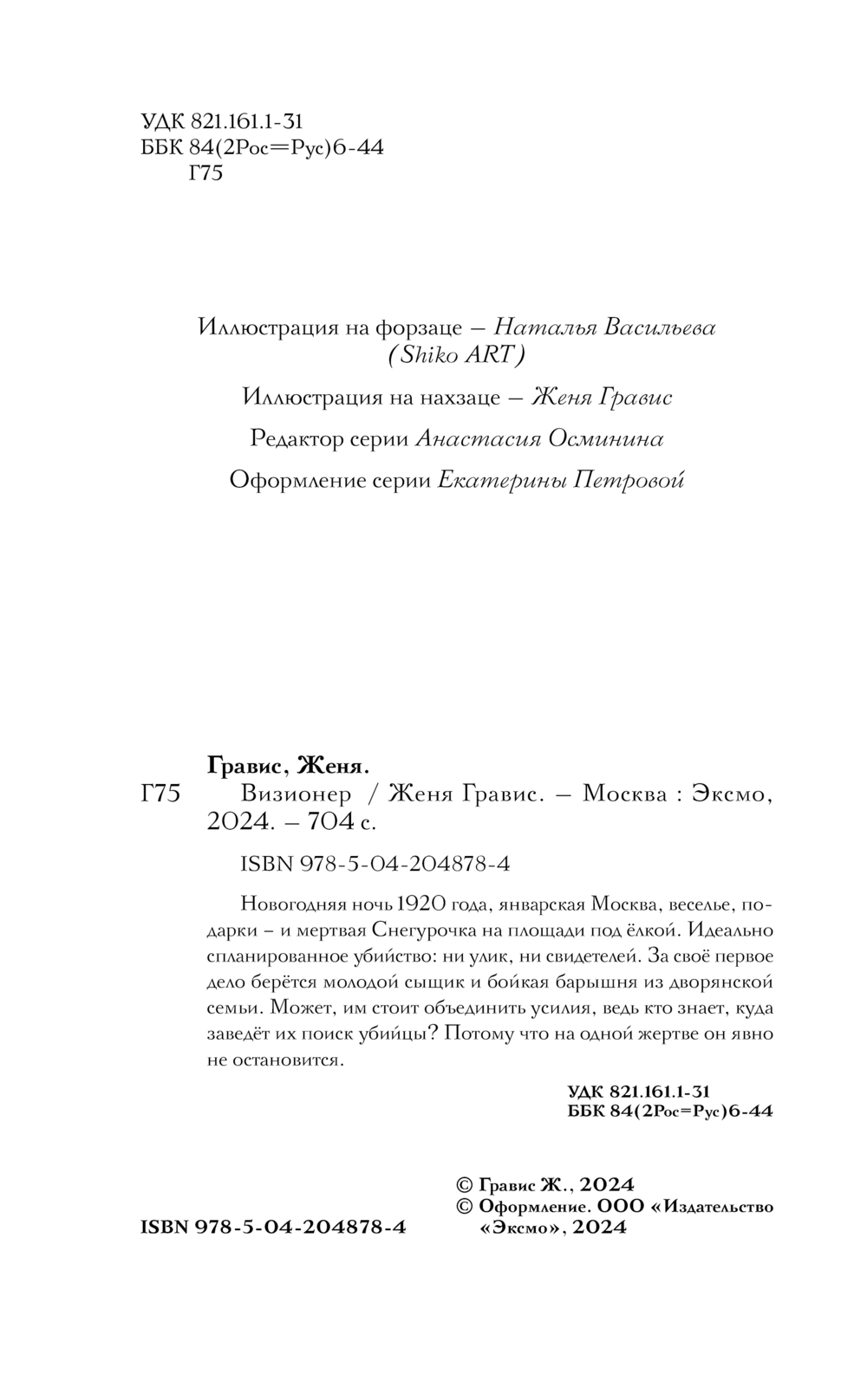 Новогодняя ночь 1920 года, январская Москва, веселье, подарки – и мертвая Снегурочка на площади под ёлкой. Идеально спланированное убийство: ни улик, ни свидетелей. За своё первое дело берётся молодой сыщик и бойкая барышня из дворянской семьи. Может, им стоит объединить усилия, ведь кто знает, куда заведёт их поиск убийцы? Потому что на одной жертве он явно не остановится.