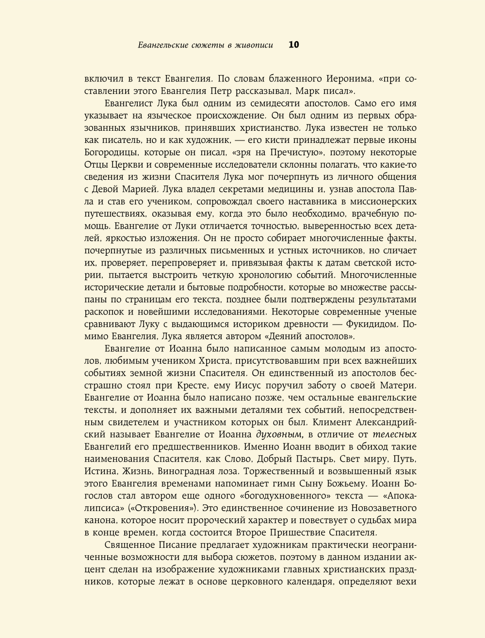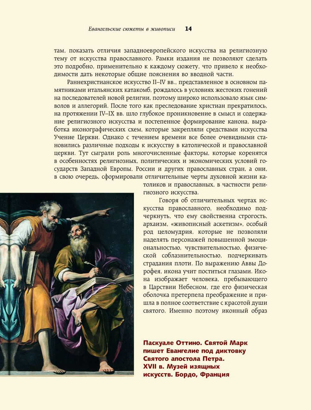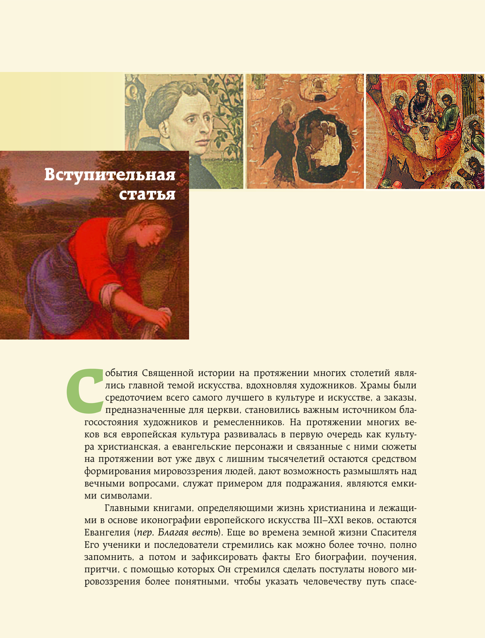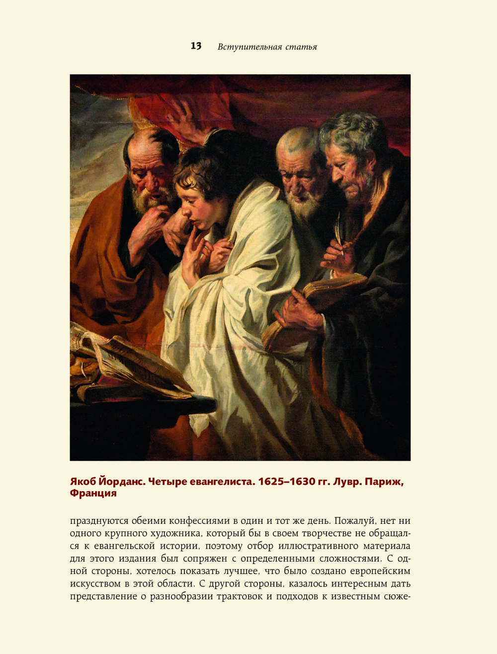 Предлагаемое издание облегчит знакомство с основными сюжетами и действующими лицами Евангелия, а произведения искусства известных и анонимных художников сделают этот процесс более интересным. Приступая к работе над евангельским сюжетом, художник стремится не только предать общий смысл происходящего, но подчеркнуть, выделить ту мысль, которая ему представляется наиболее важной, существенной. Художник может сделать это прямо, непосредственно, а может выразить свою мысль в завуалированной форме. Для этого существует широкий спектр художественных приемов: используя особенности композиции и колорита, символы и аллегории можно привнести в произведение искусства дополнительные смыслы, направить мысль пытливого зрителя в нужную сторону.