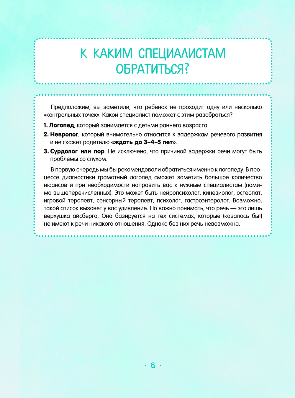 Эта книга подойдёт вам, если вашему ребёнку 1-3 года, но он не говорит или говорит мало, его речь состоит только из слогов или лепета, а также если вы просто заинтересованы во всестороннем развитии малыша. На страницах пособия теоретический материал для родителей чередуется с заданиями для детей, которые можно выполнять прямо в книге. Материал расположен от простого к сложному. В конце находится приложение, которое можно вырезать и играть в развивающие игры так, как вам захочется.