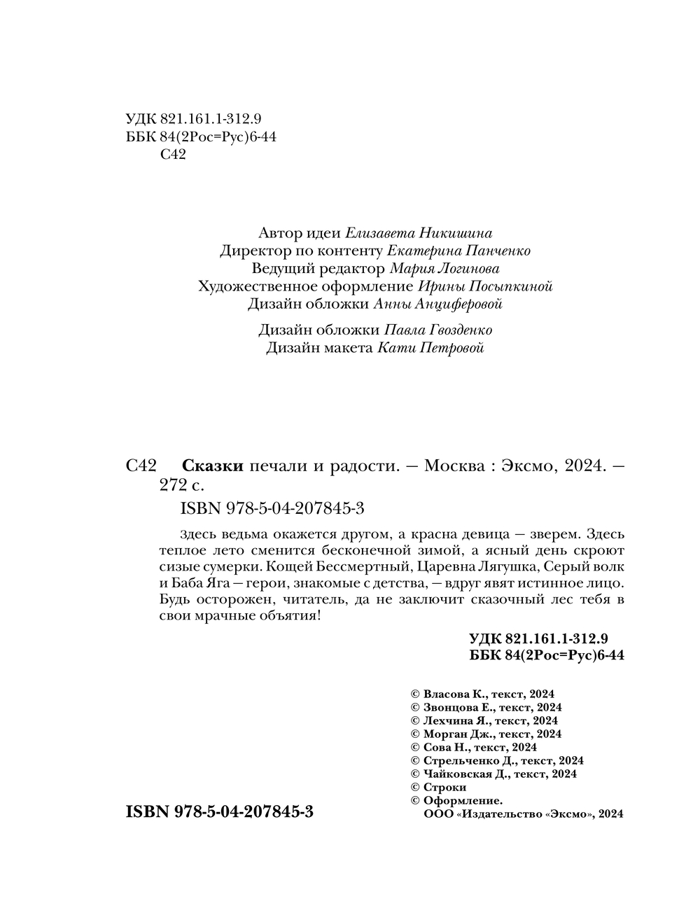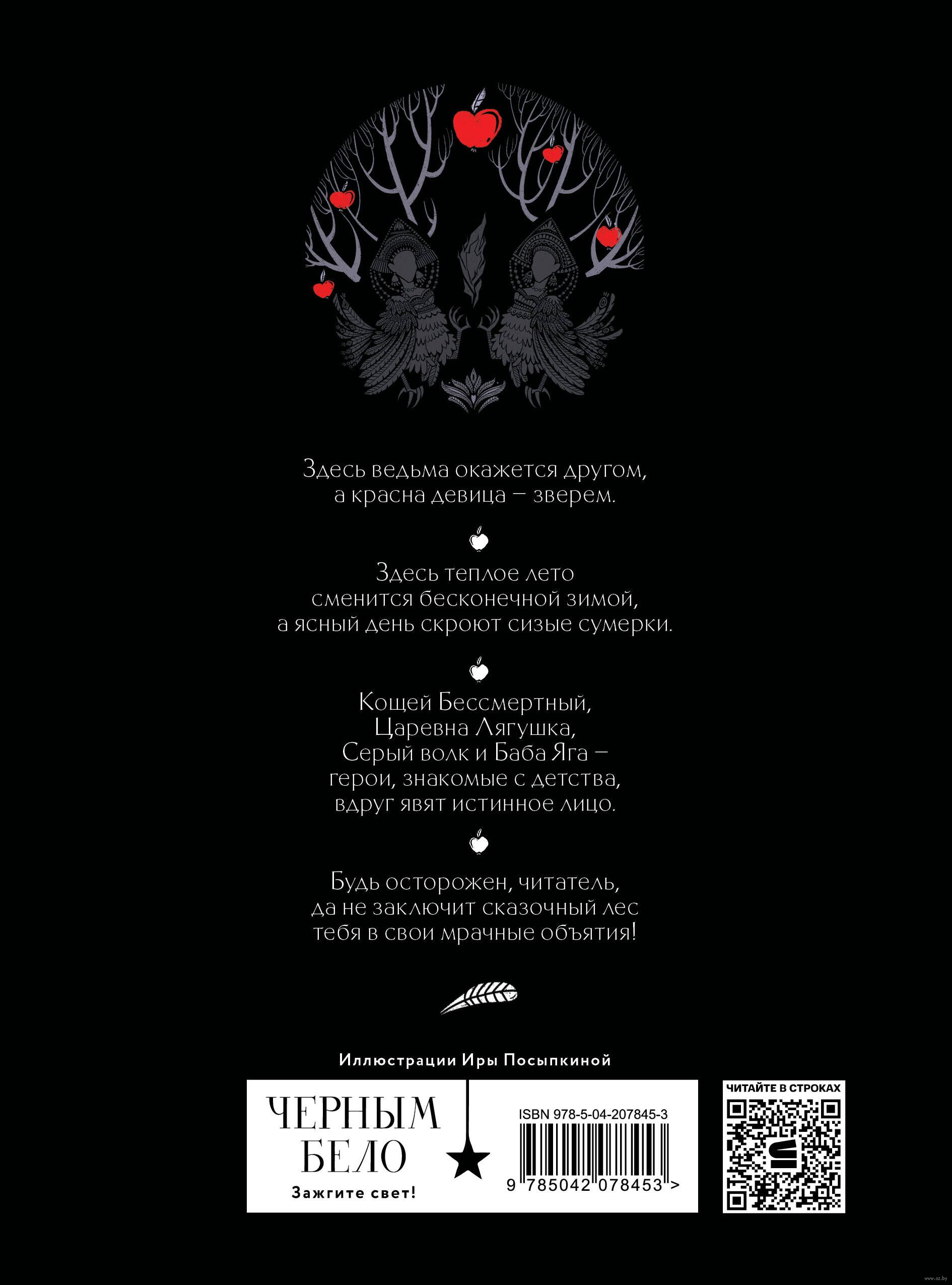 Здесь ведьма окажется другом, а красна девица – зверем. Здесь теплое лето сменится бесконечной зимой, а ясный день скроют сизые сумерки. Кощей Бессмертный, Царевна Лягушка, Серый волк и Баба Яга – герои, знакомые с детства, вдруг явят истинное лицо. Будь осторожен, читатель, да не заключит сказочный лес тебя в свои мрачные объятия!