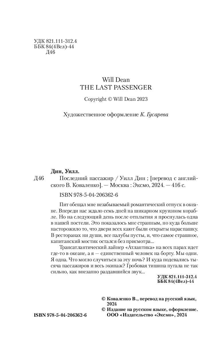Трансатлантический лайнер "Атлантика" на всех парах идет где-то в океане, а я – единственный человек на борту. Мы одни. Я одна. Что могло случится за эту ночь? И куда подевалась тысяча пассажиров и весь экипаж? Гробовая тишина пугала не так сильно, как внезапно раздавшийся звук...