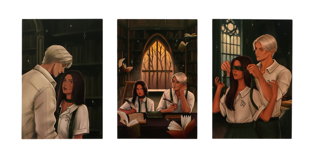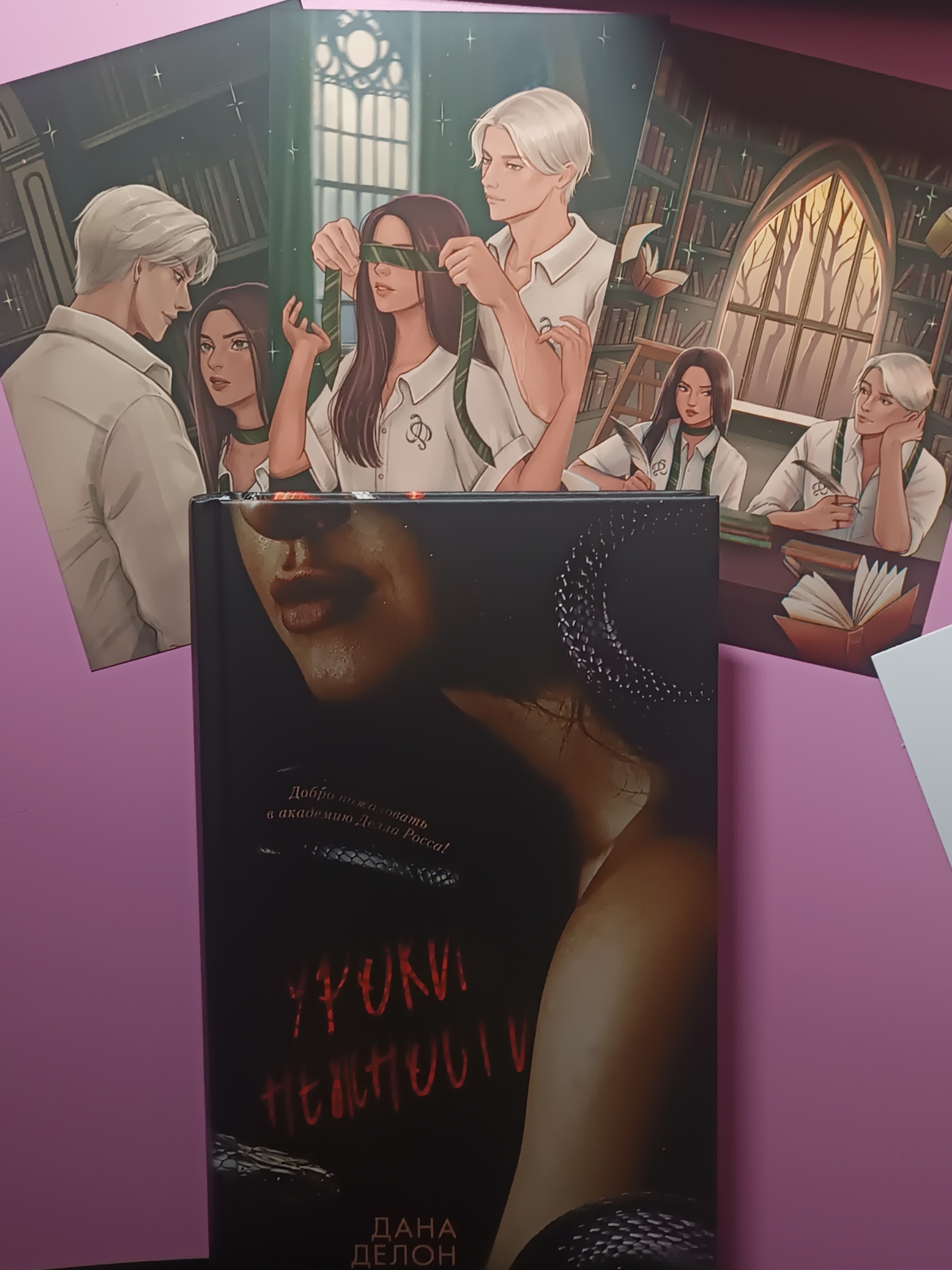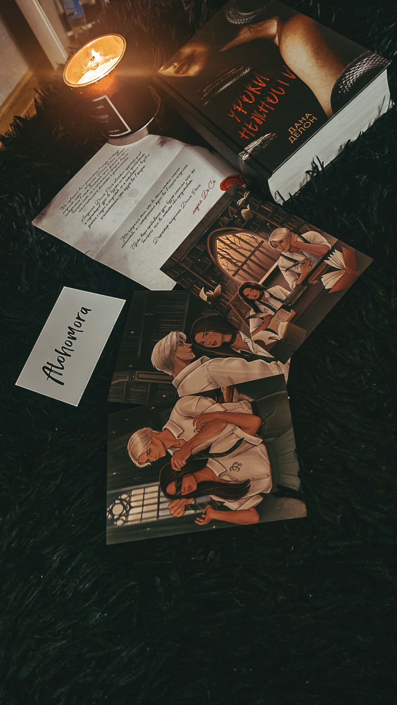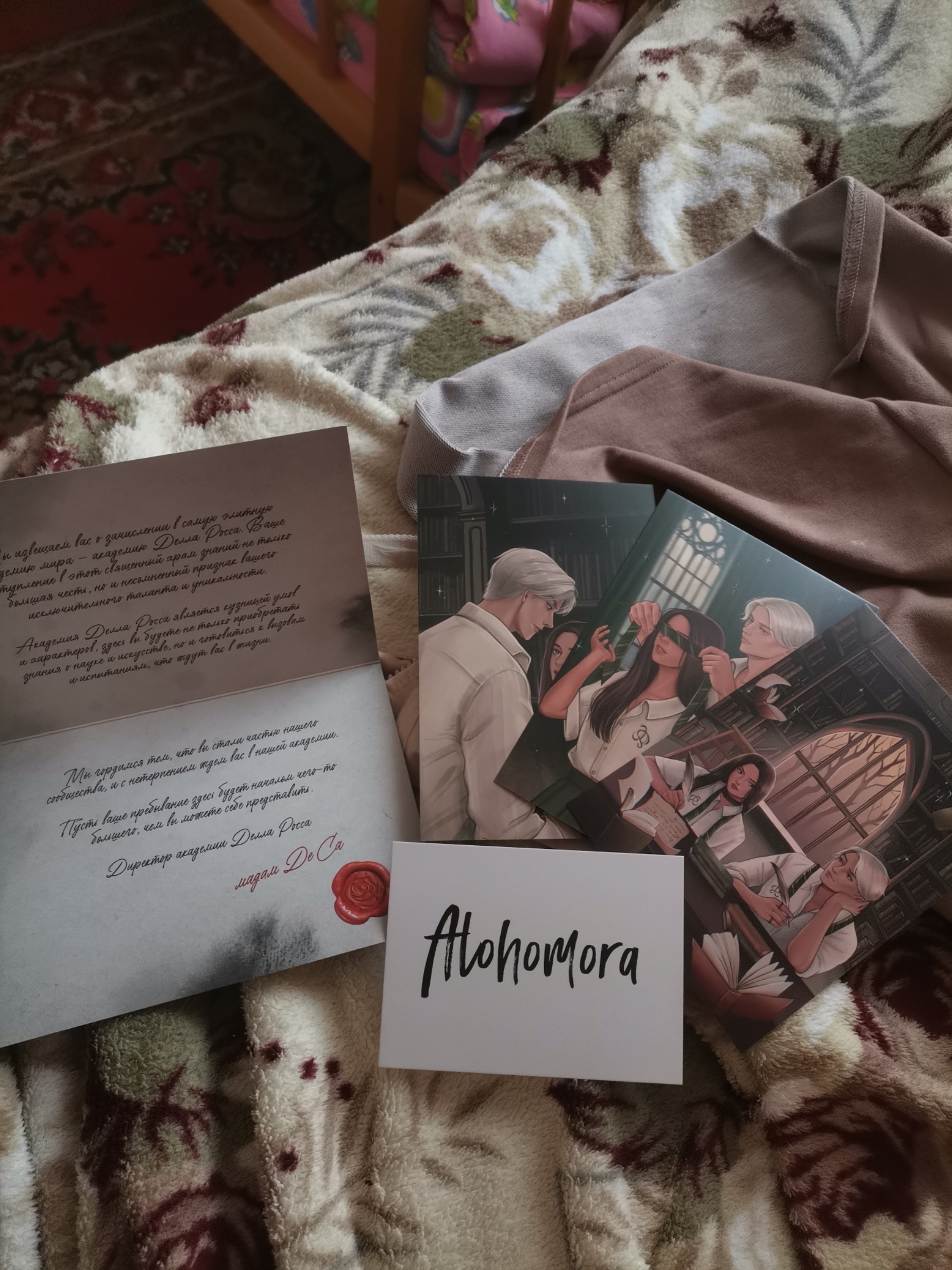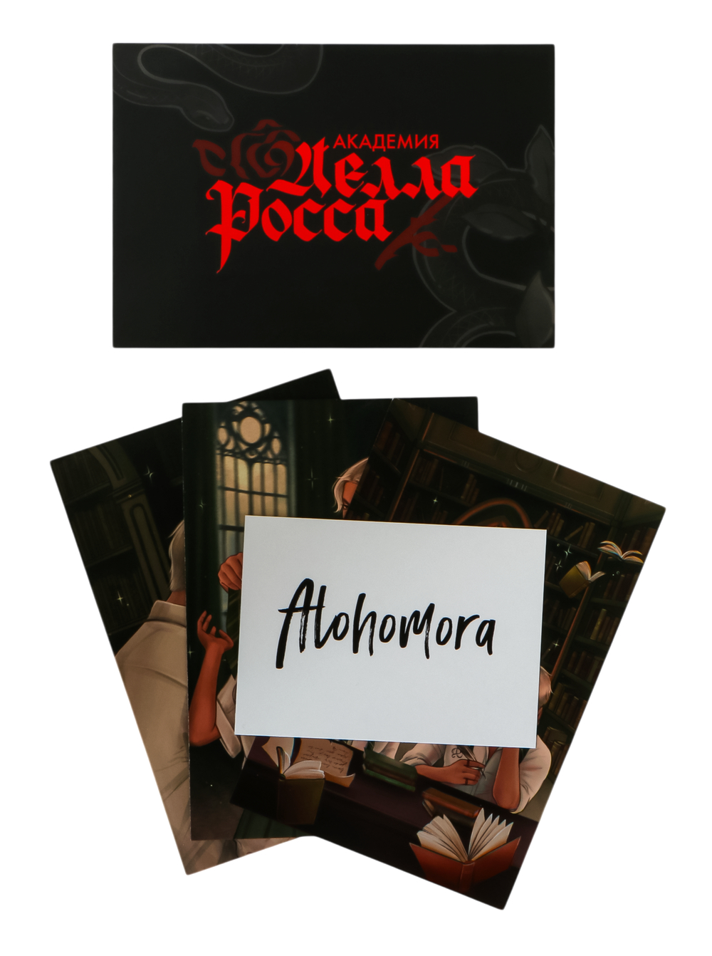 С книгой из первого тиража – тематический мерч от Trendbooks: приглашение в академиюоткрытки с цветными иллюстрациями от Xenychanкарта-ключ Alohomora, как у одного из героев романа.