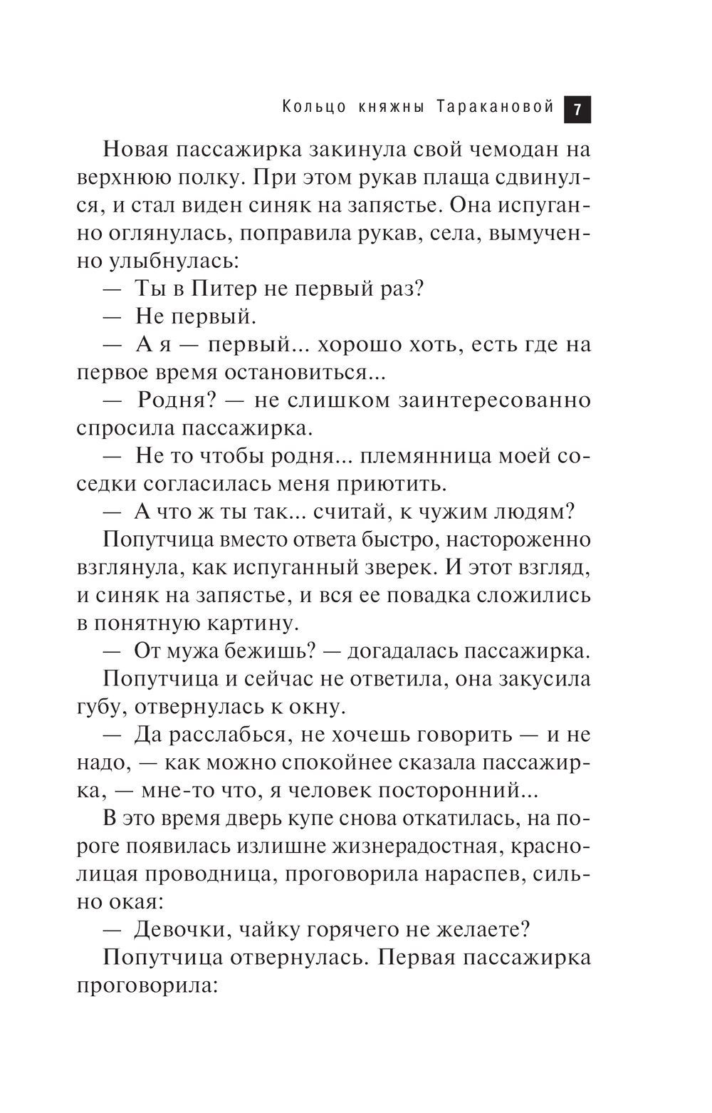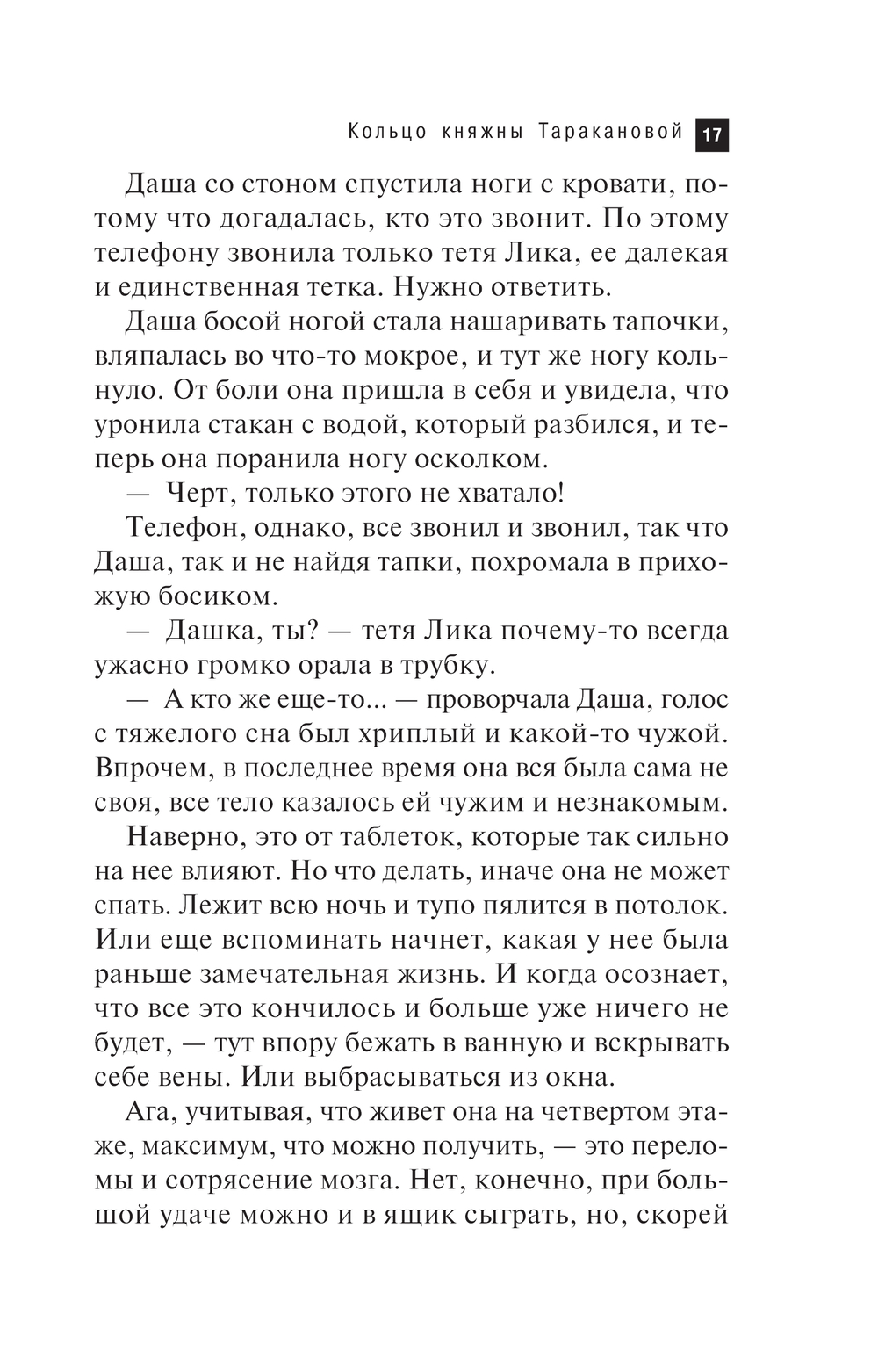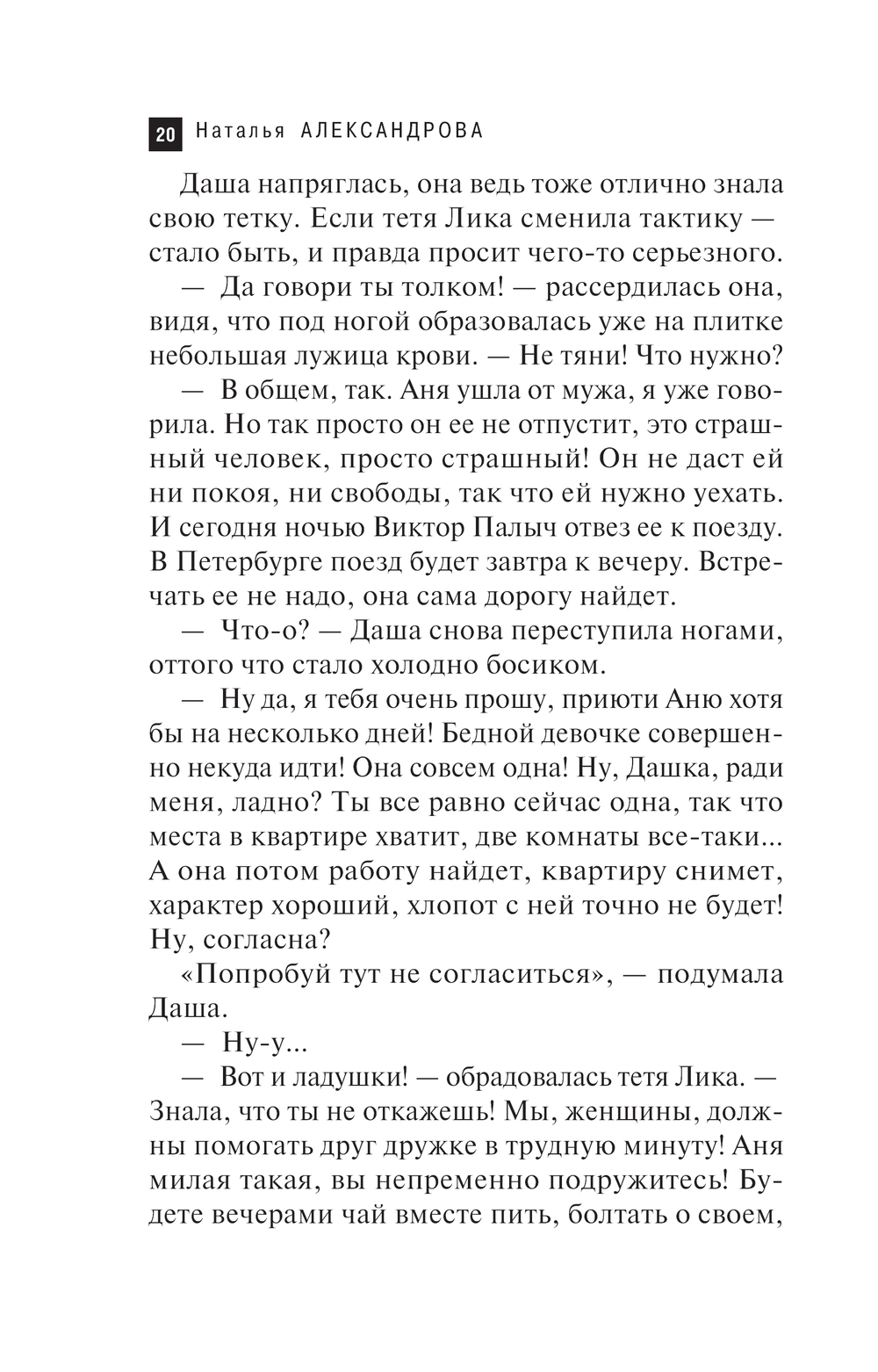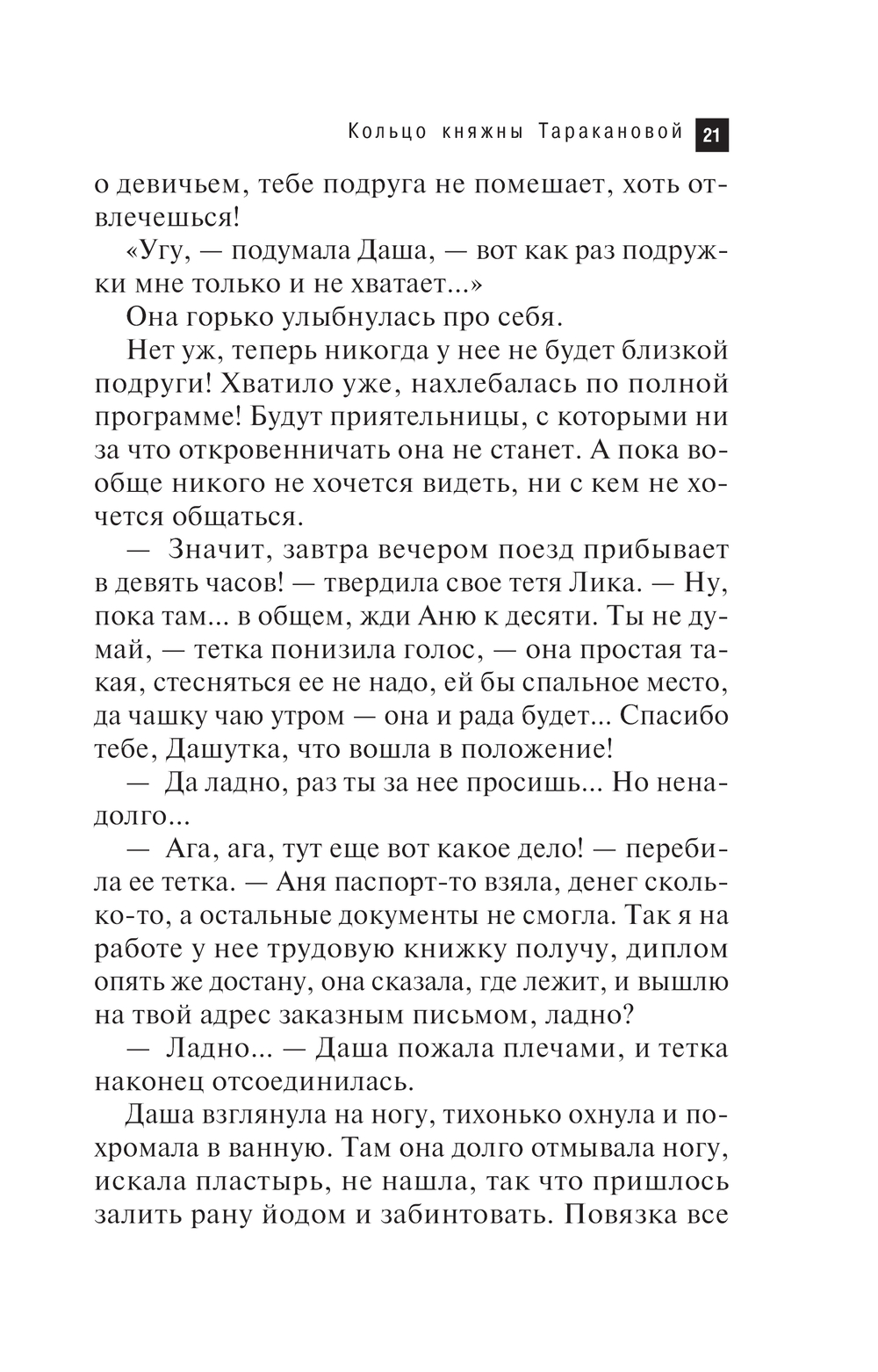 В наше время старинное кольцо попадает в руки робкой учительницы Ани, которая решается укрыться от жестокого мужа у Даши, племянницы ее доброжелательной соседки. Однако приезжает к Даше совсем не застенчивая девушка, а весьма смелая дама. И странности на этом не заканчиваются! Однажды Даша возвращается домой и находит в шкафу убитого Аниного мужа! А таинственной гостьи и след простыл. Кто убил мужа и что он делал в Дашиной квартире? Девушка отправляется на поиски и выясняет, что гостьей была вовсе не Аня, а выдававшая себя за нее незнакомка...