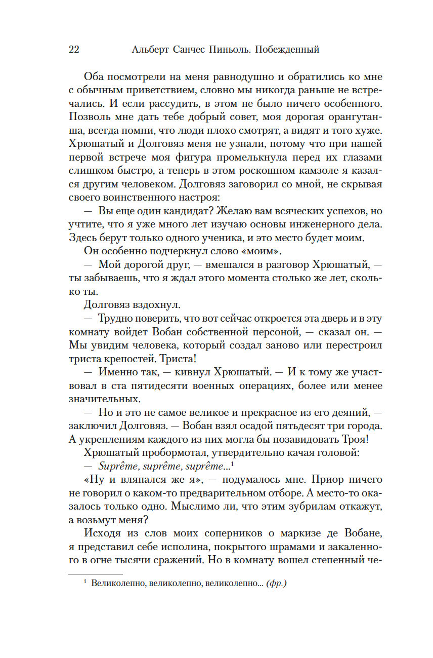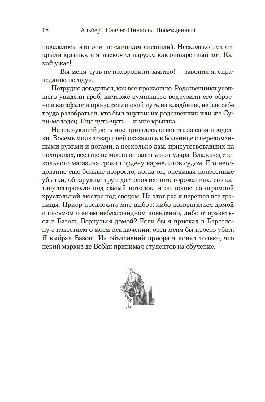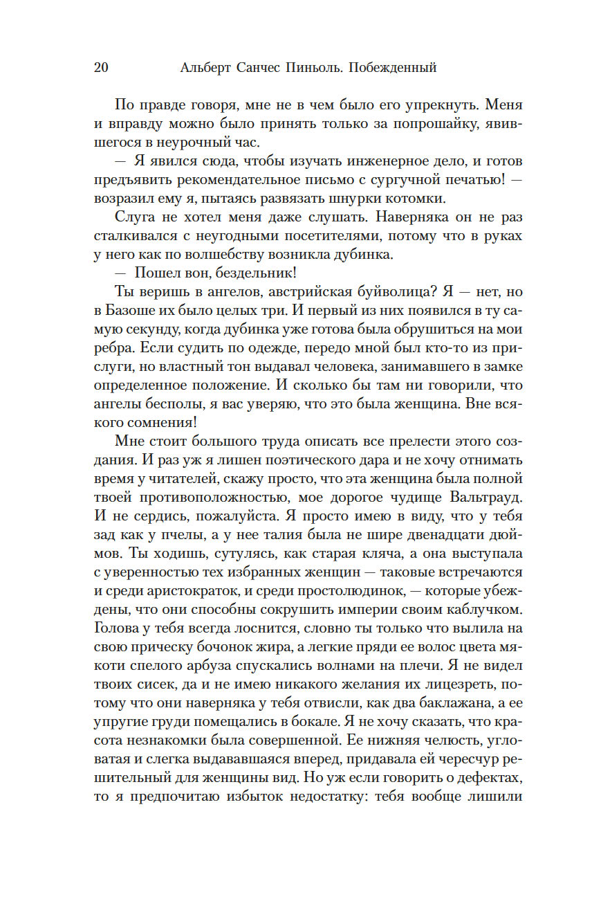 Альберт Санчес Пиньоль – одна из крупнейших звезд каталанской литературы; оригинальностью и популярностью он не уступает Жауме Кабре. Его "Побежденный", авантюрный роман, военный эпик и высокая трагедия, отчасти отсылает нас к "Симплициссимусу" Гриммельсгаузена и "Похождениям бравого солдата Швейка" Ярослава Гашека, "Дуэли" Джозефа Конрада и "Запискам Флэшмена" Джорджа Макдоналда Фрейзера, которыми автор особенно вдохновлялся. В Испании роман разошелся тиражом более 250 тысяч экземпляров, был переведен на 16 языков, вызвал безудержные восторги, спровоцировал яростные споры, получил премию газеты El Periódico за лучший роман 2012 года, стал основой для комикса и вдобавок вдохновил серию концертов барочной музыки (а такое с современными романами случается редко). В "Побежденном" будут героизм и трусость, стойкость и разгром, бесплодные поиски и ослепительные откровения, язвительная усмешка и безмолвная нежность. Любая война способна только убивать и калечить, а в качестве запоздалого и решительно несоразмерного утешения разве что подарить нам "Войну и мир", и "Побежденный" – это "Война и мир" Барселоны.