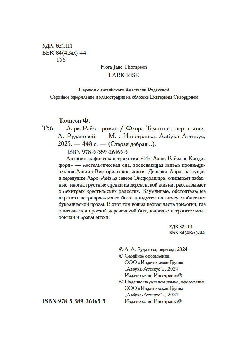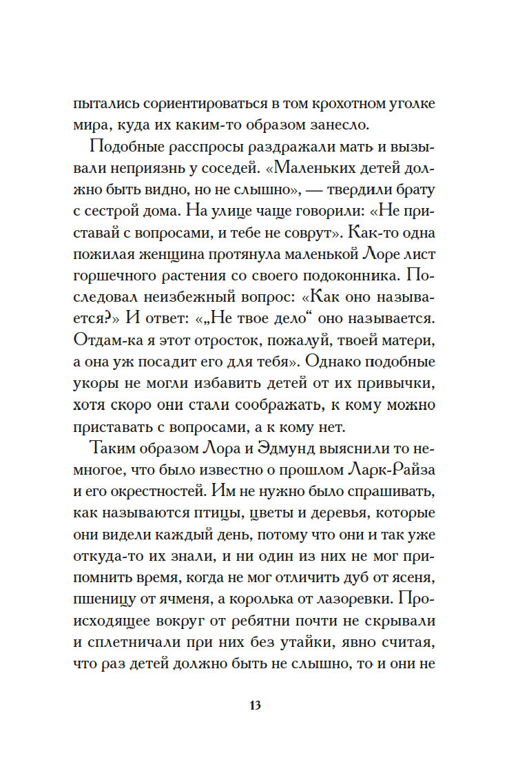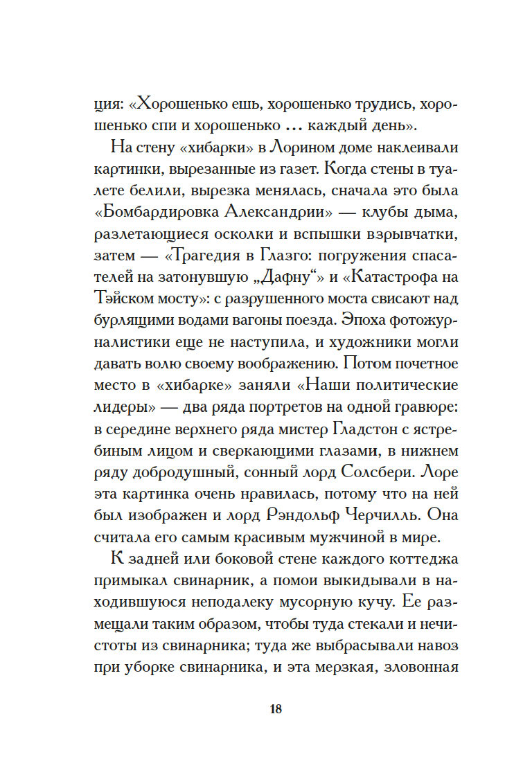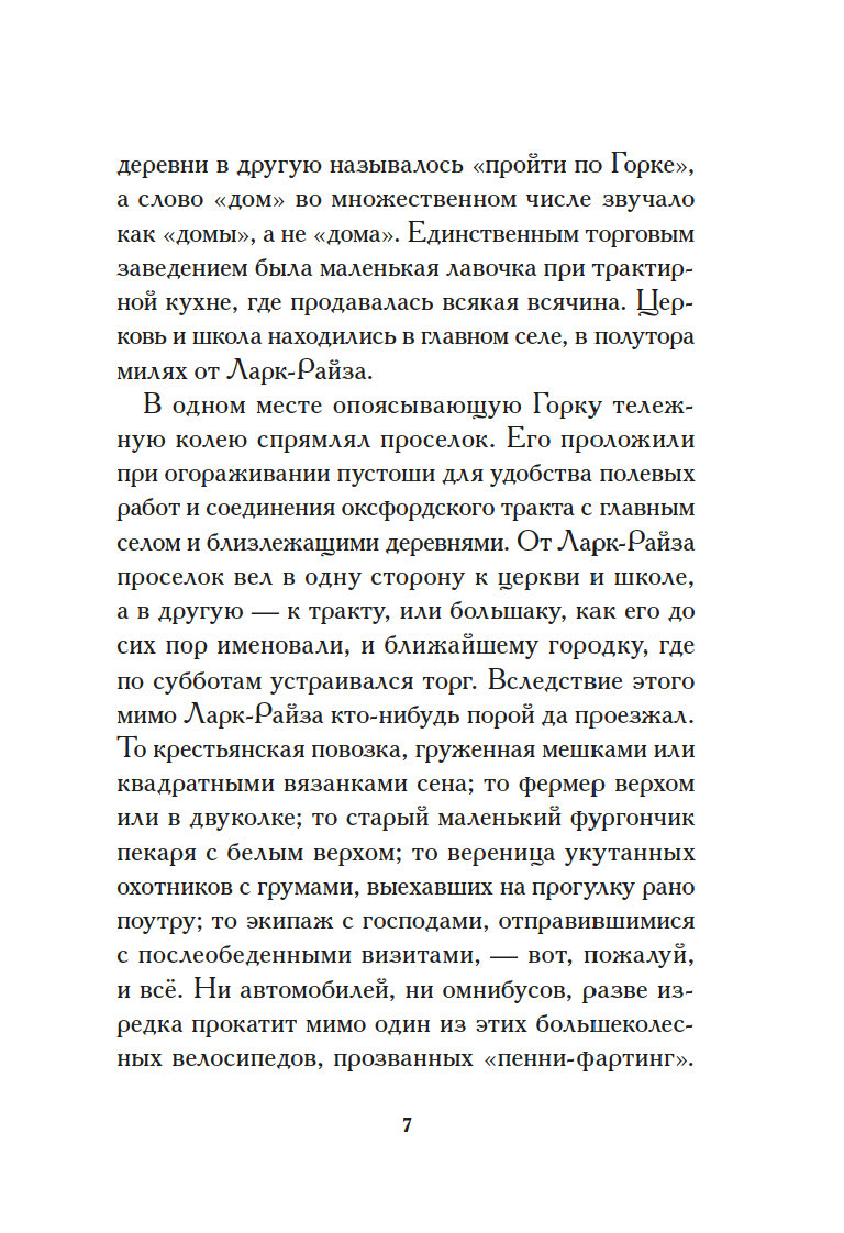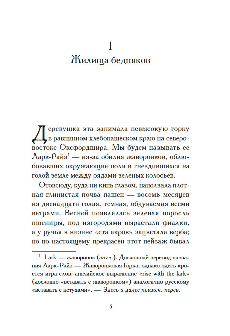 Автобиографическая трилогия "Из Ларк-Райза в Кэндлфорд" – ностальгическая ода, воспевающая жизнь провинциальной Англии Викторианской эпохи. Девочка Лора, растущая в деревушке Ларк-Райз на севере Оксфордшира, описывает забавные, иногда грустные сценки из деревенской жизни, рассказывает о нехитрых крестьянских радостях. Вдумчивые, обстоятельные картины патриархального быта придутся по вкусу любителям буколической прозы. В этот том вошла первая часть трилогии, где описывается простой деревенский быт, наивные и трогательные обычаи и нравы эпохи.