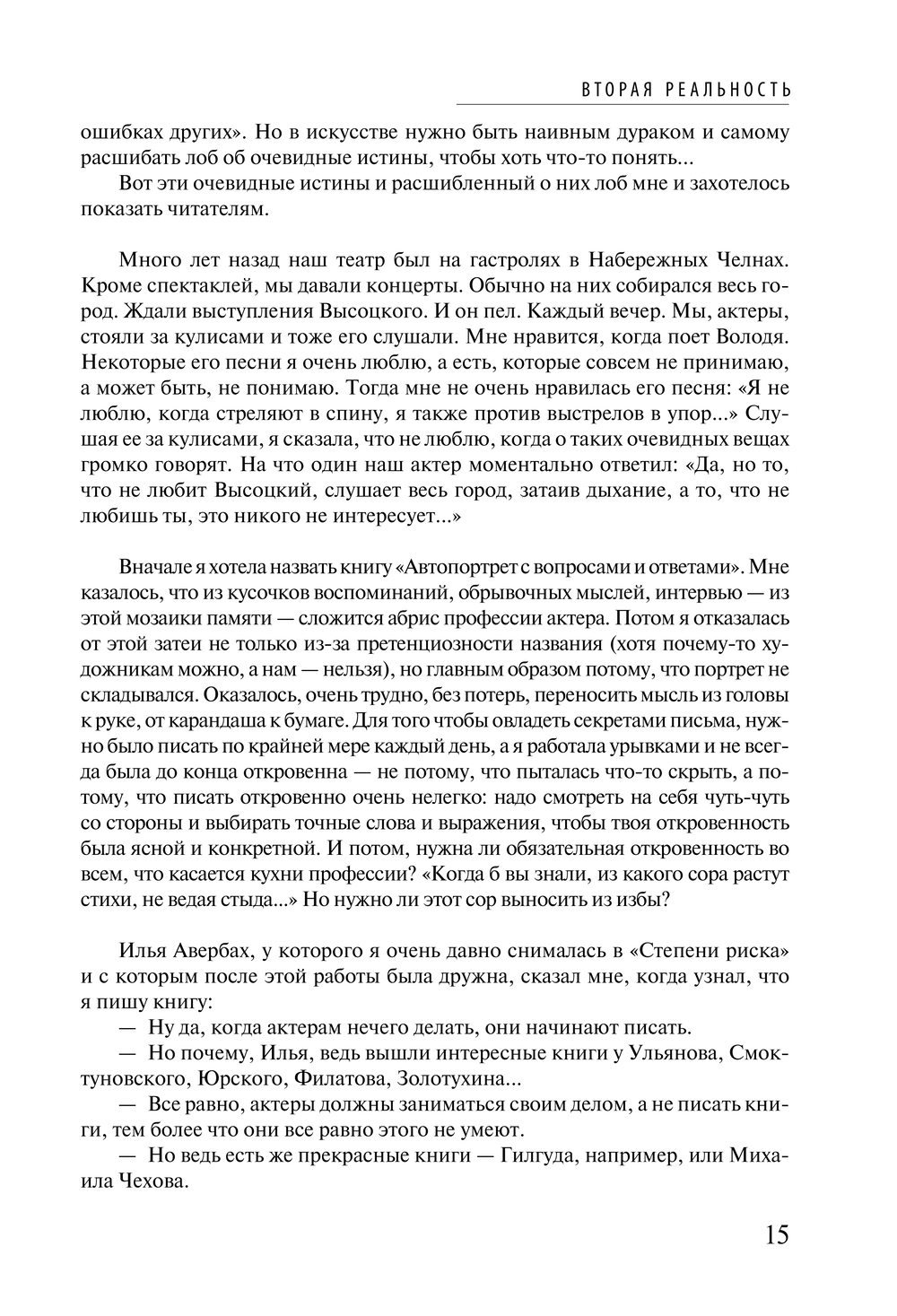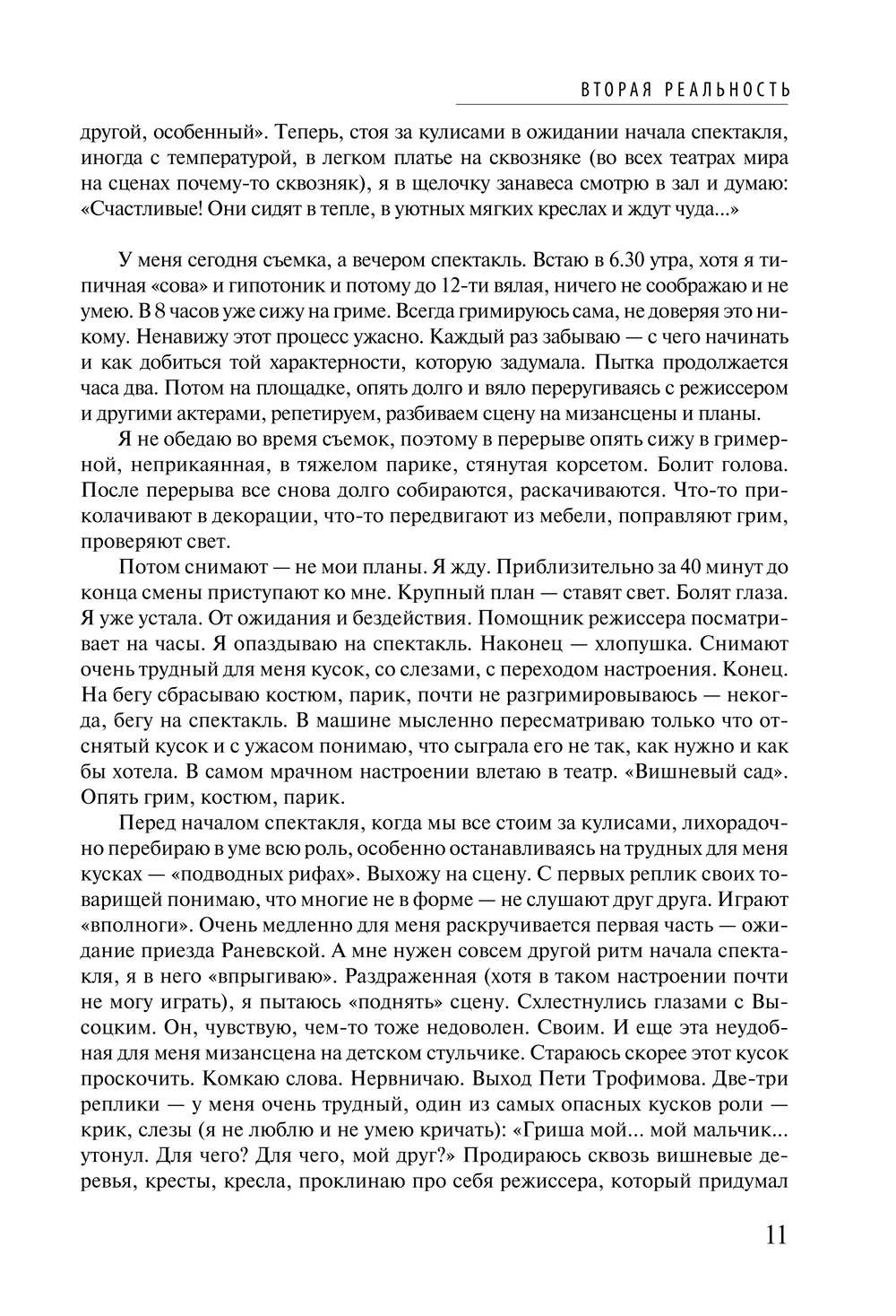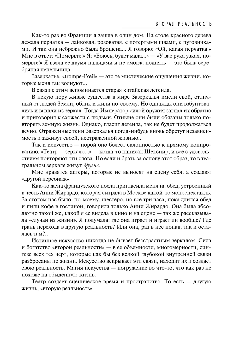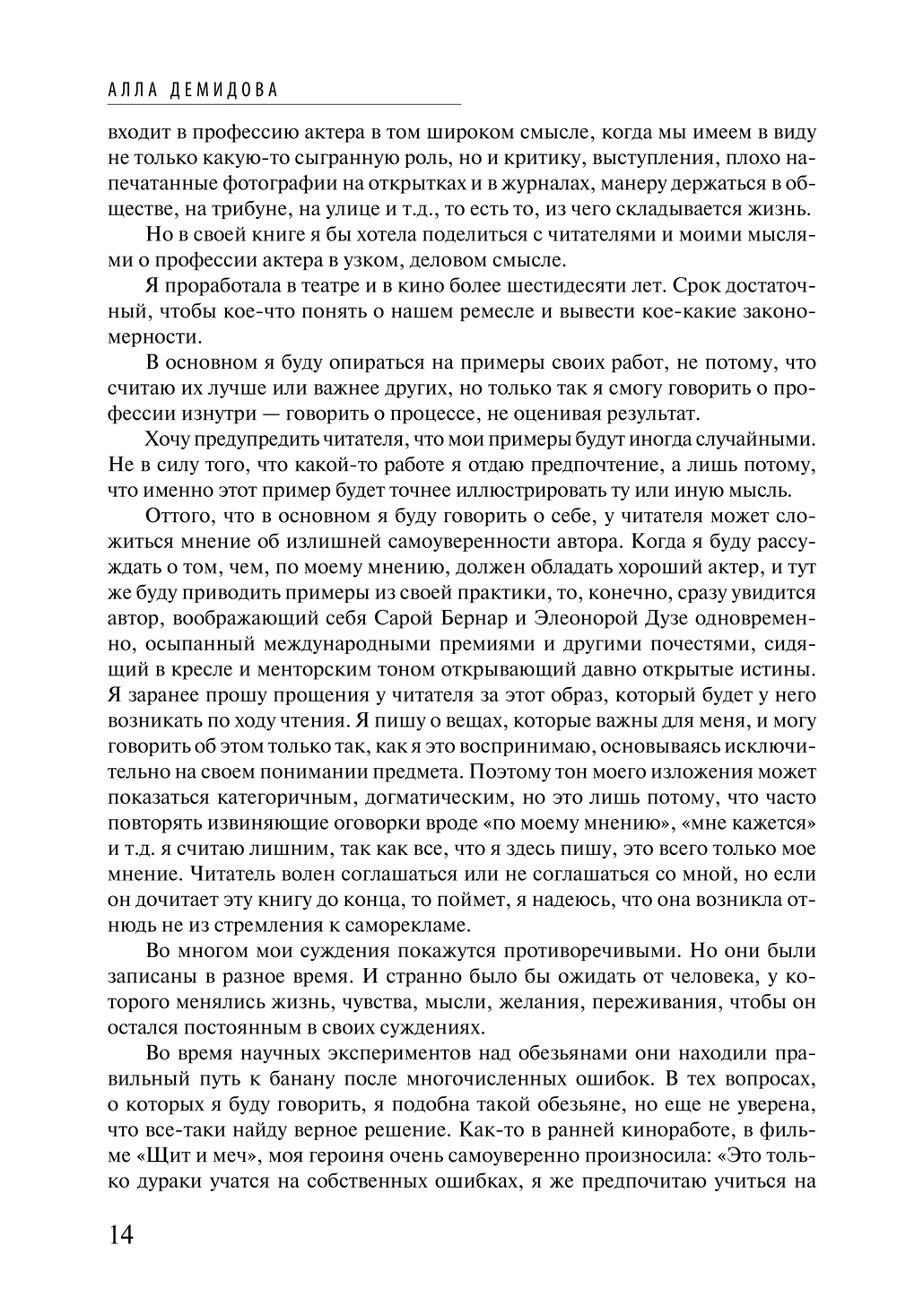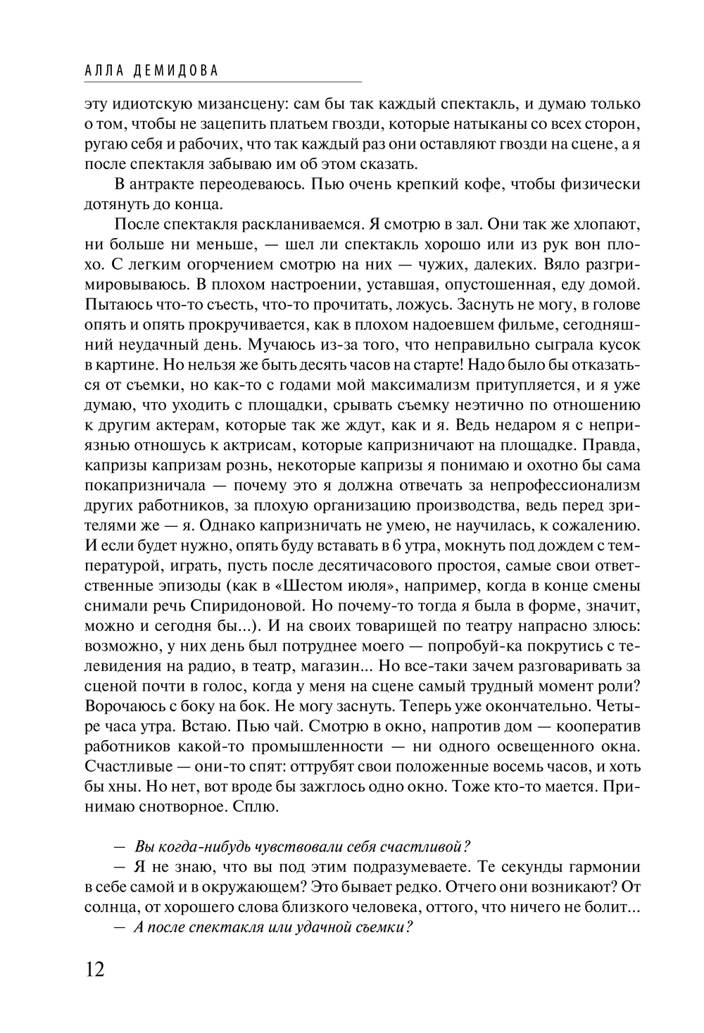 Блуждая по лабиринтам памяти, известная актриса, уникальная женщина Алла Демидова вспоминает яркие страницы своей творческой биографии и щедро делится ими с читателем. Вместе с автором мы переносимся в Театр на Таганке и попадаем на репетиции и спектакли Юрия Любимова и Анатолия Эфроса, как живого видим Владимира Высоцкого, затем окунаемся в атмосферу кипучей деятельности таких режиссеров, как Роман Виктюк, Лариса Шепитько, Кира Муратова, Андрей Тарковский, Сергей Параджанов, и рядом наблюдаем прекрасных актеров – Иннокентия Смоктуновского, Георгия Жженова, Дмитрия Певцова... А вот мы уже оказываемся в квартире Лили Брик, овеянной тайной и загадкой. Или следуем за актрисой в ее зарубежных поездках и знакомимся с деятелями западного искусства – Антуаном Витезом, Теодором Терзопулосом, Бобом Уилсоном, Жоржем Сименоном... И конечно, везде мы видим Аллу Демидову, в самых разных театральных и киноролях.