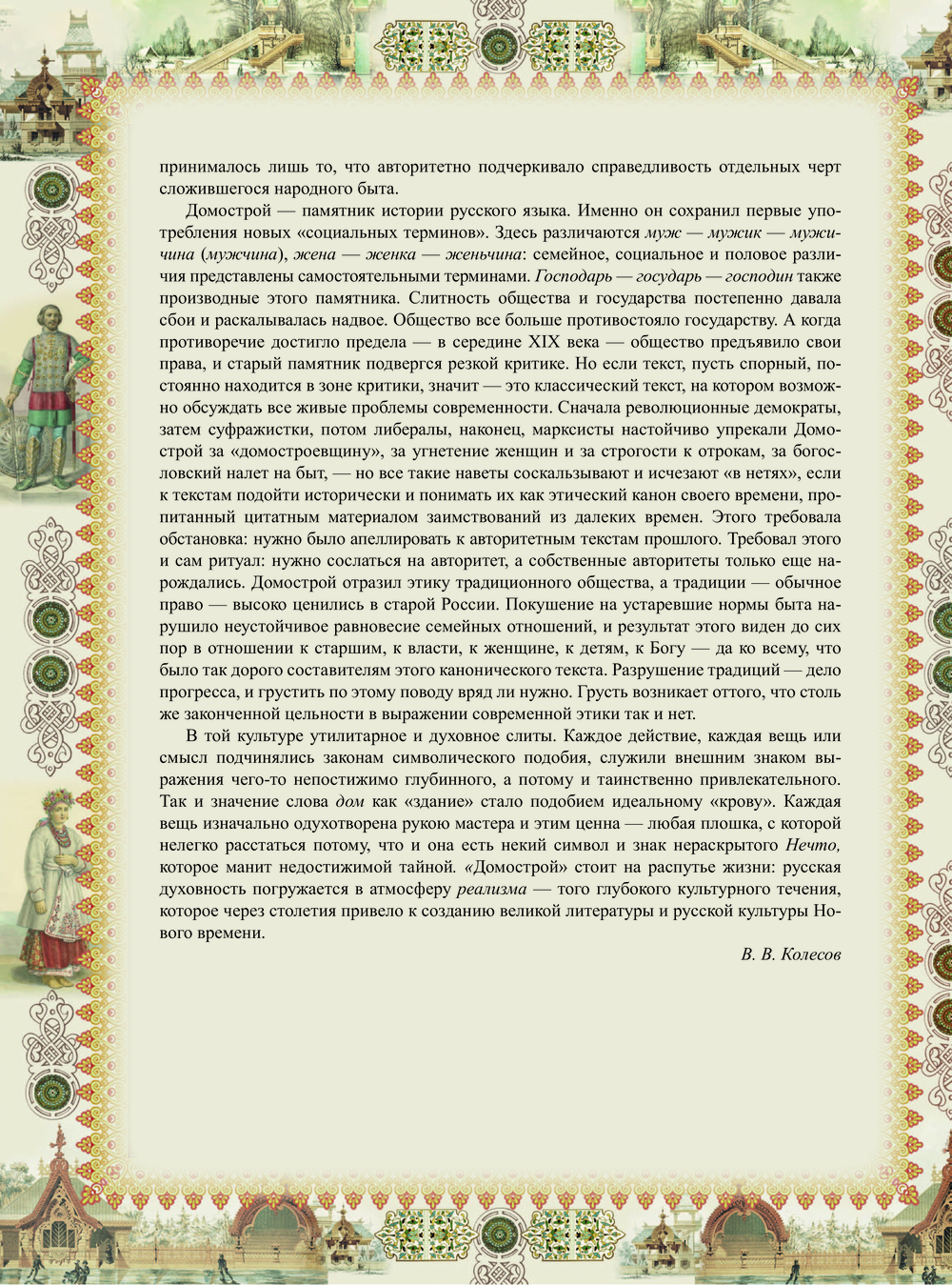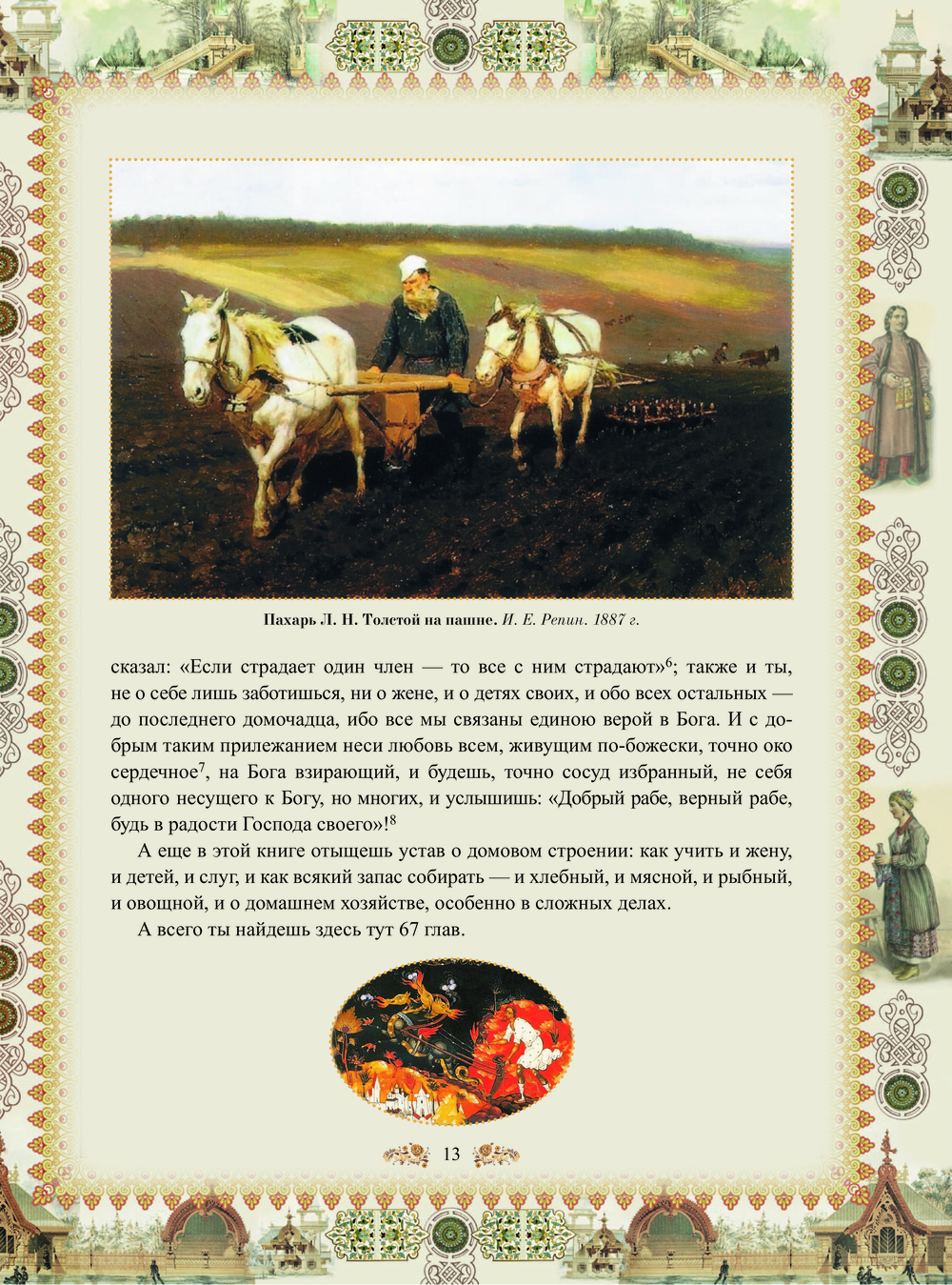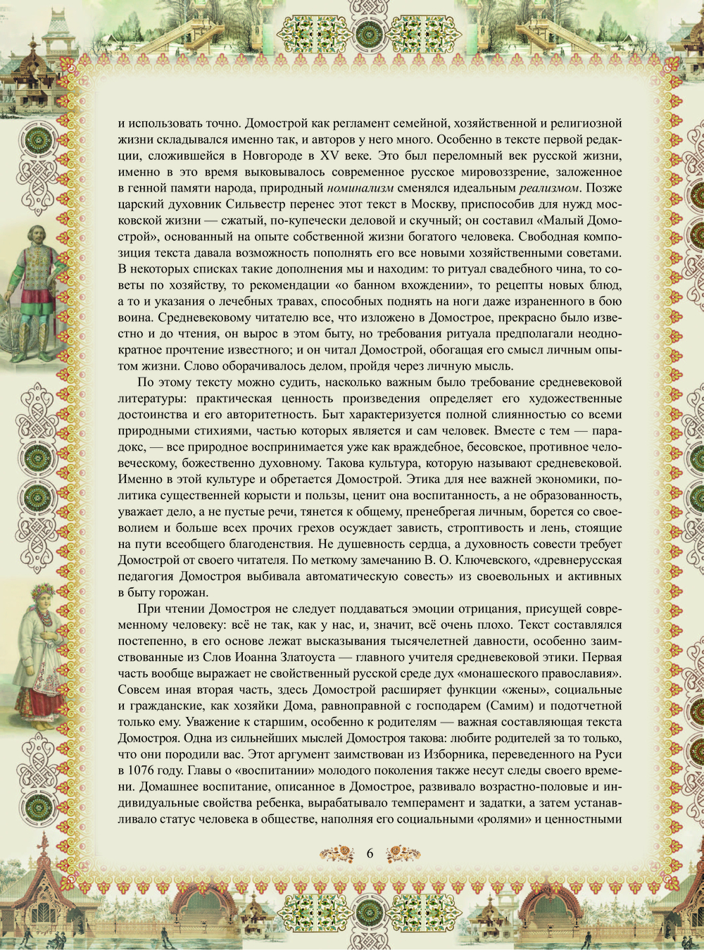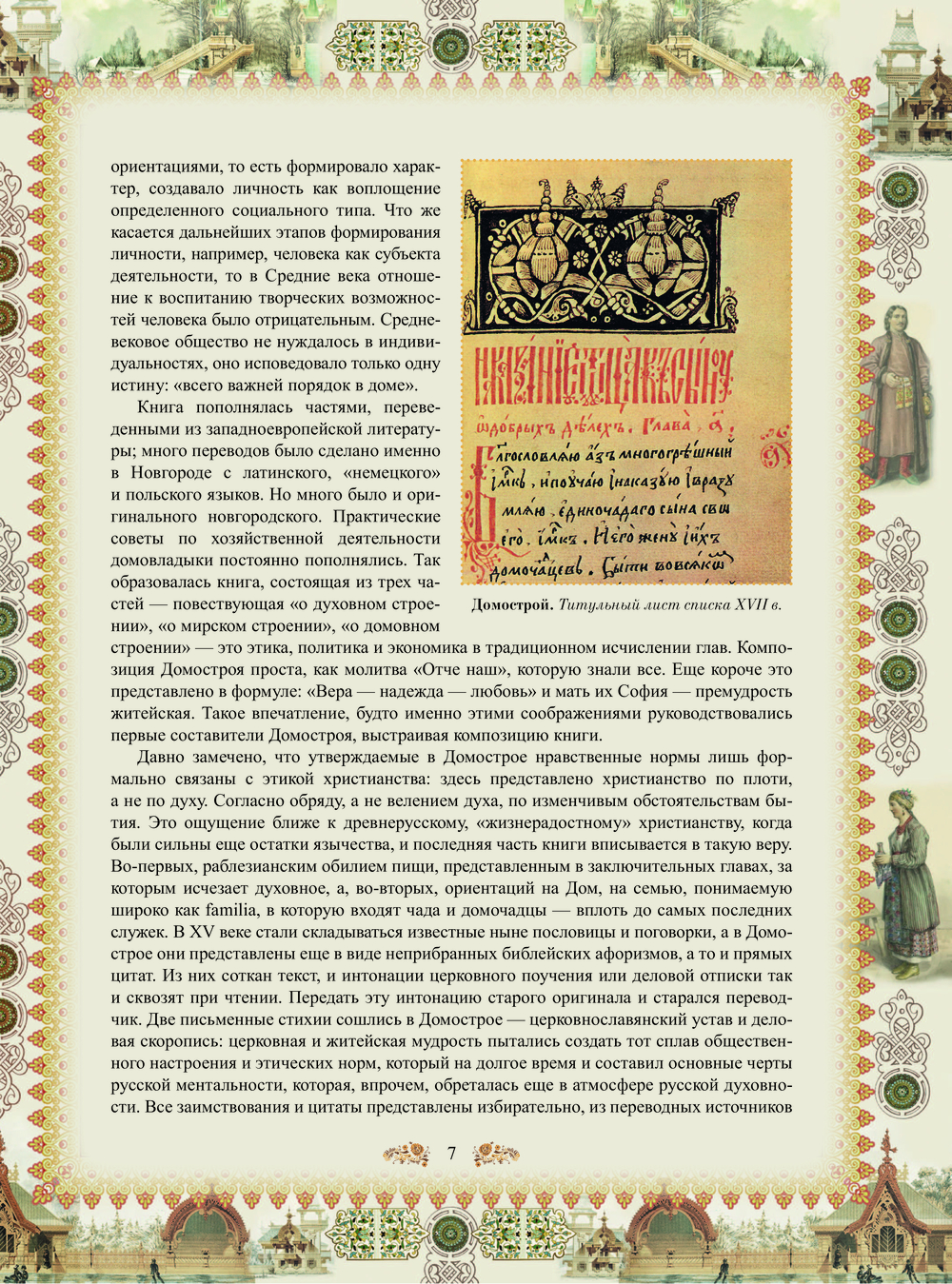 Предлагаемое издание богато иллюстрировано произведениями классической русской живописи, что позволит читателю полнее погрузиться в атмосферу традиционного уклада "России, которую мы потеряли", но которая тем не менее присутствует в жизни каждого из нас во многом благодаря и дошедшему к нам из глубины веков тексту "Домостроя".