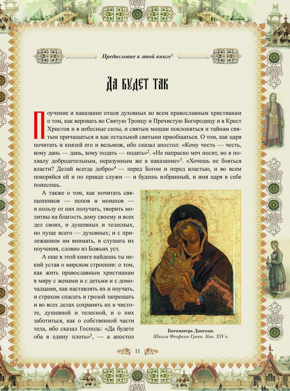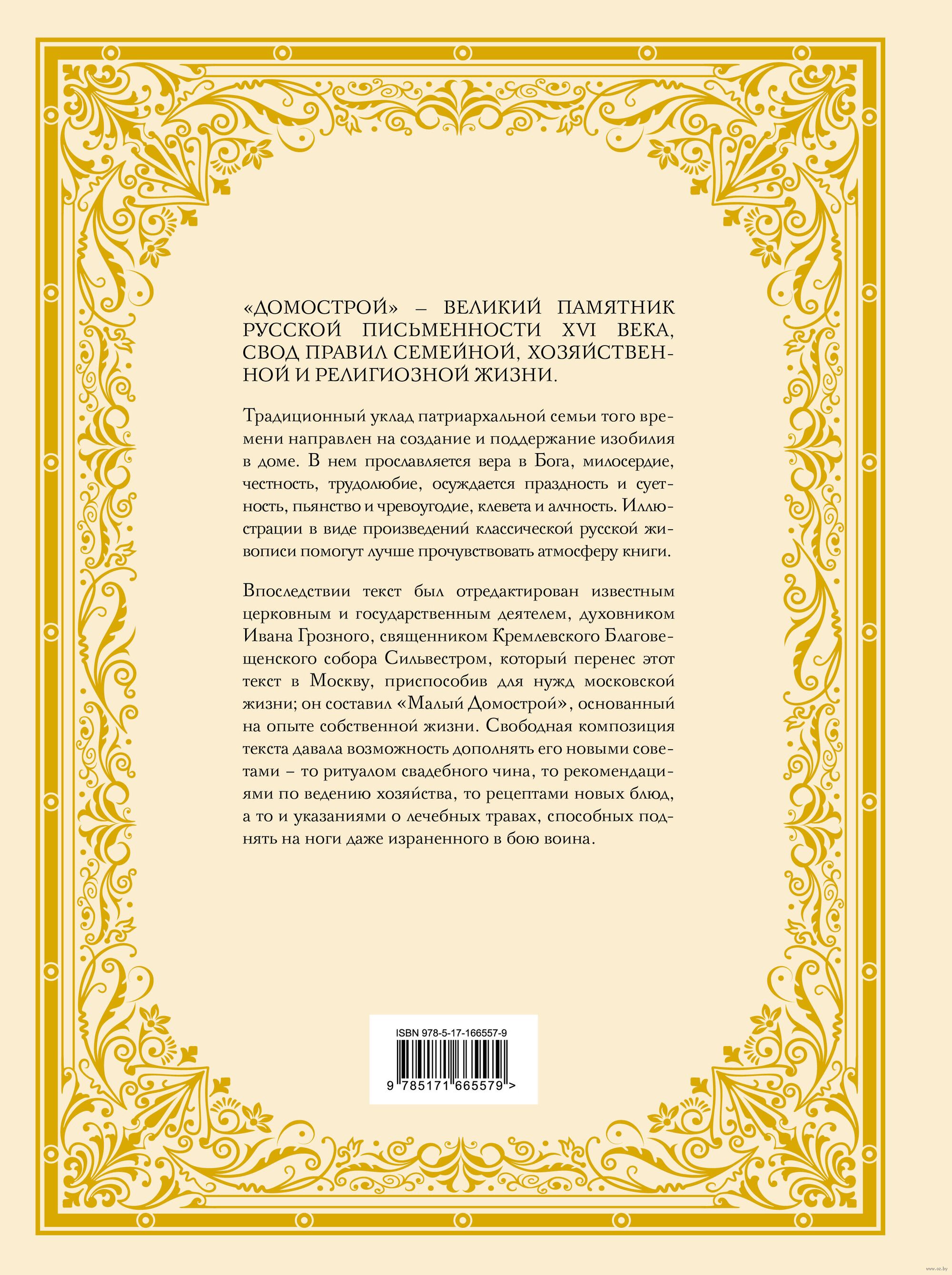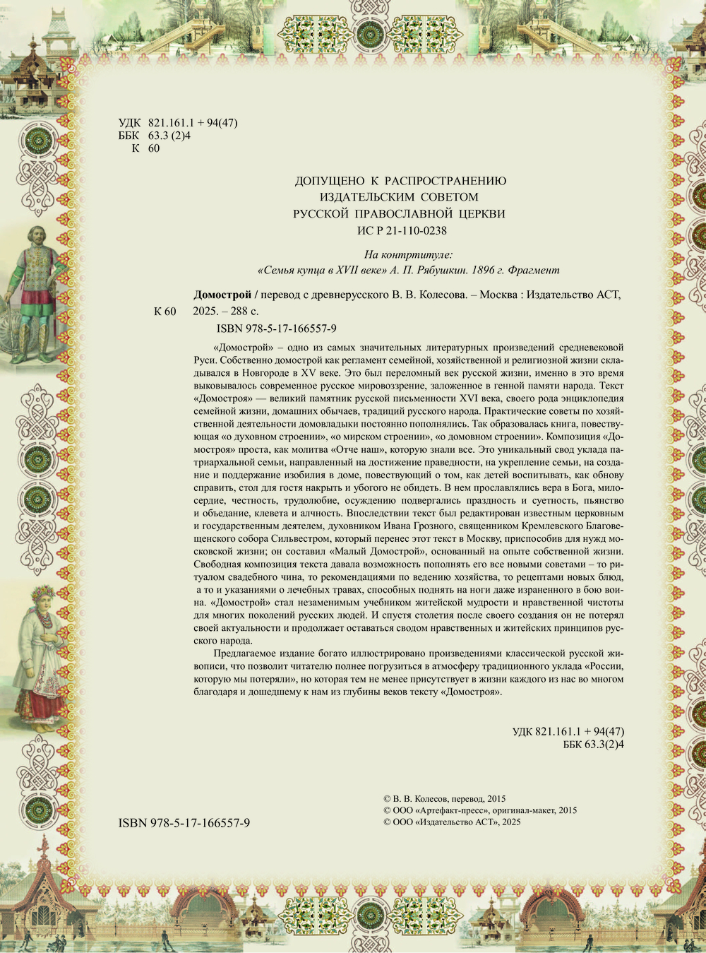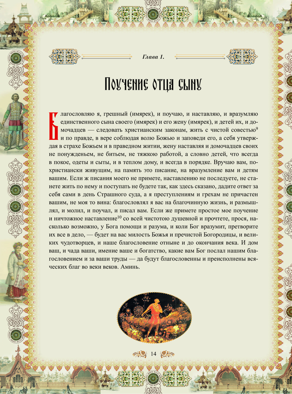 Предлагаемое издание богато иллюстрировано произведениями классической русской живописи, что позволит читателю полнее погрузиться в атмосферу традиционного уклада "России, которую мы потеряли", но которая тем не менее присутствует в жизни каждого из нас во многом благодаря и дошедшему к нам из глубины веков тексту "Домостроя".