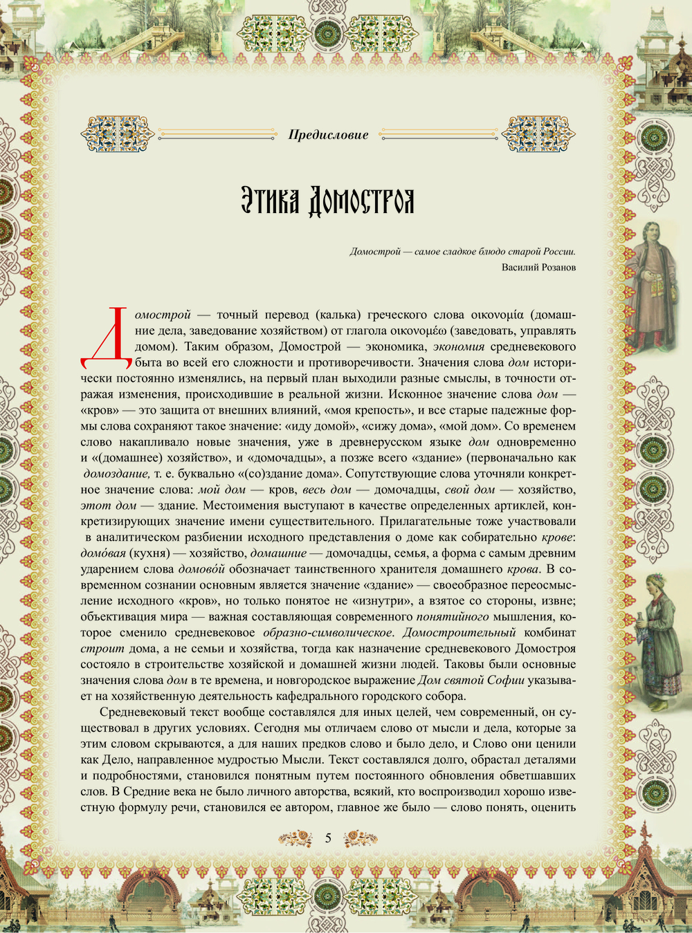 "Домострой" – одно из самых значительных литературных произведений средневековой Руси. Собственно домострой как регламент семейной, хозяйственной и религиозной жизни складывался в Новгороде в XV веке. Это был переломный век русской жизни, именно в это время выковывалось современное русское мировоззрение, заложенное в генной памяти народа. Текст "Домостроя" – великий памятник русской письменности XVI века, своего рода энциклопедия семейной жизни, домашних обычаев, традиций русского народа. Практические советы по хозяйственной деятельности домовладыки постоянно пополнялись. Так образовалась книга, повествующая "о духовном строении", "о мирском строении", "о домовном строении".