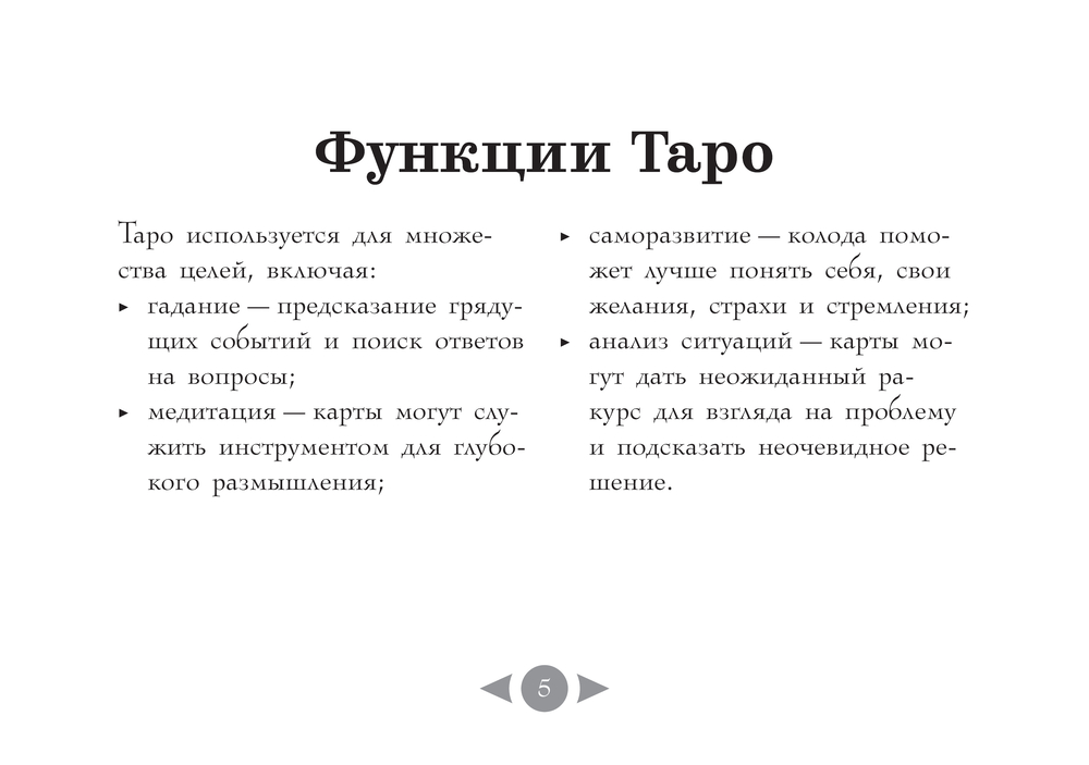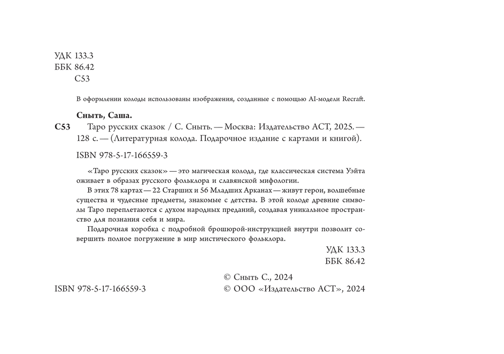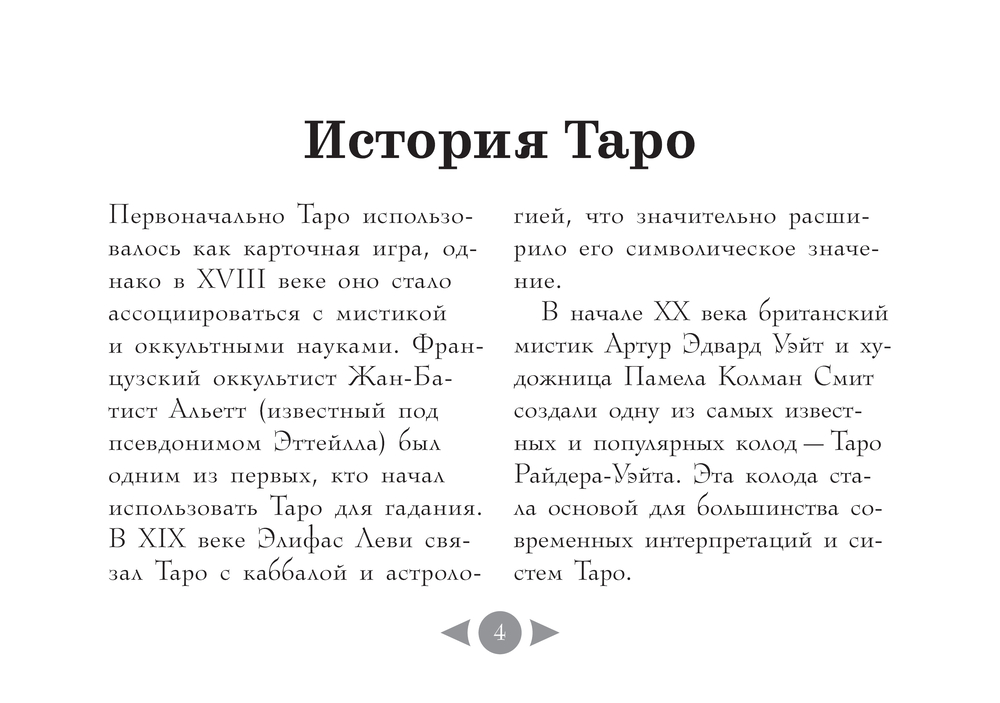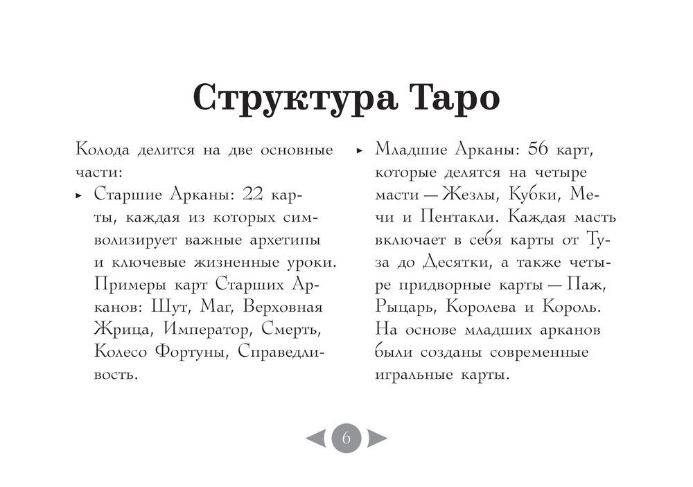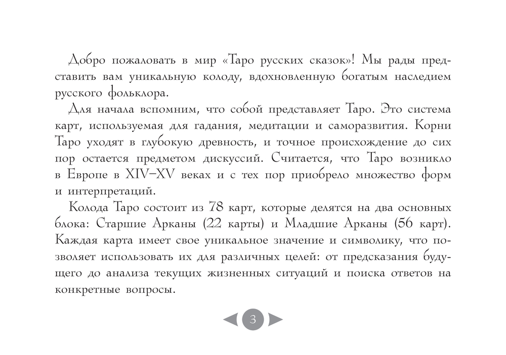 В этих 78 картах – 22 Старших и 56 Младших Арканах – живут герои, волшебные существа и чудесные предметы, знакомые с детства. Каждый Аркан здесь рассказывает свою историю и передает свою мудрость, предлагая интуитивное понимание через архетипы русских сказок. В этой колоде древние символы Таро переплетаются с духом народных преданий, создавая уникальное пространство для познания себя и мира.