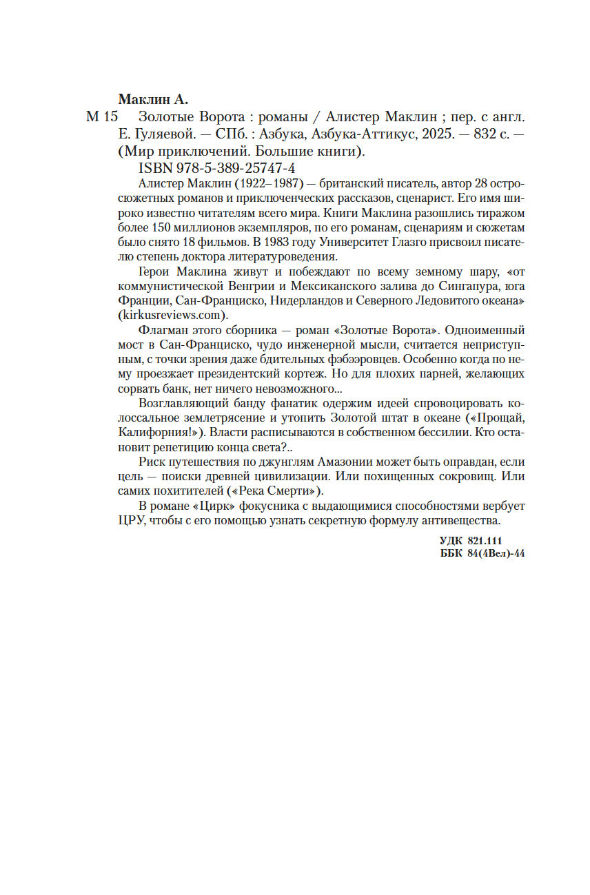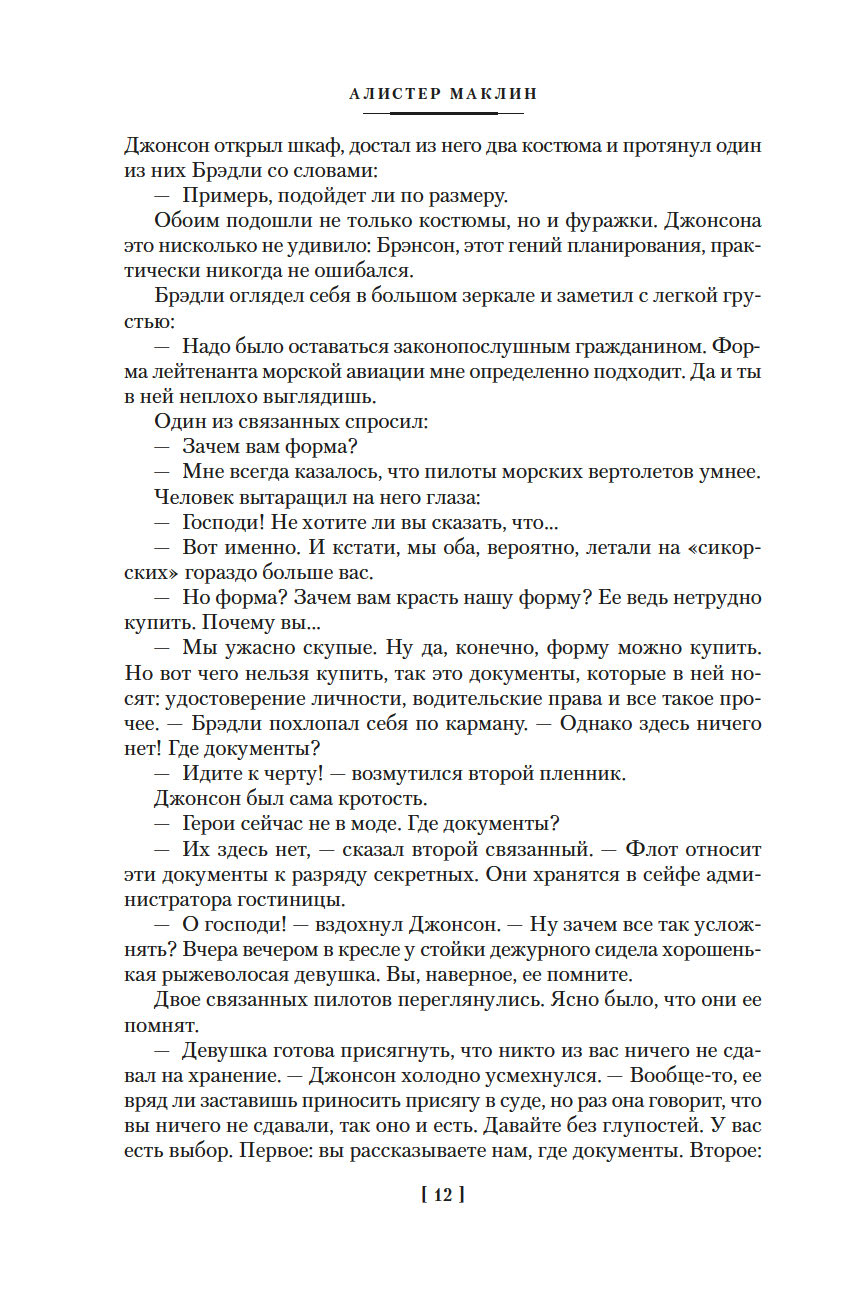 Алистер Маклин (1922-1987) – британский писатель, автор 28 остросюжетных романов и приключенческих рассказов, сценарист. Его имя широко известно читателям всего мира. Книги Маклина разошлись тиражом более 150 миллионов экземпляров, по его романам, сценариям и сюжетам было снято 18 фильмов. В 1983 году Университет Глазго присвоил писателю степень доктора литературоведения.